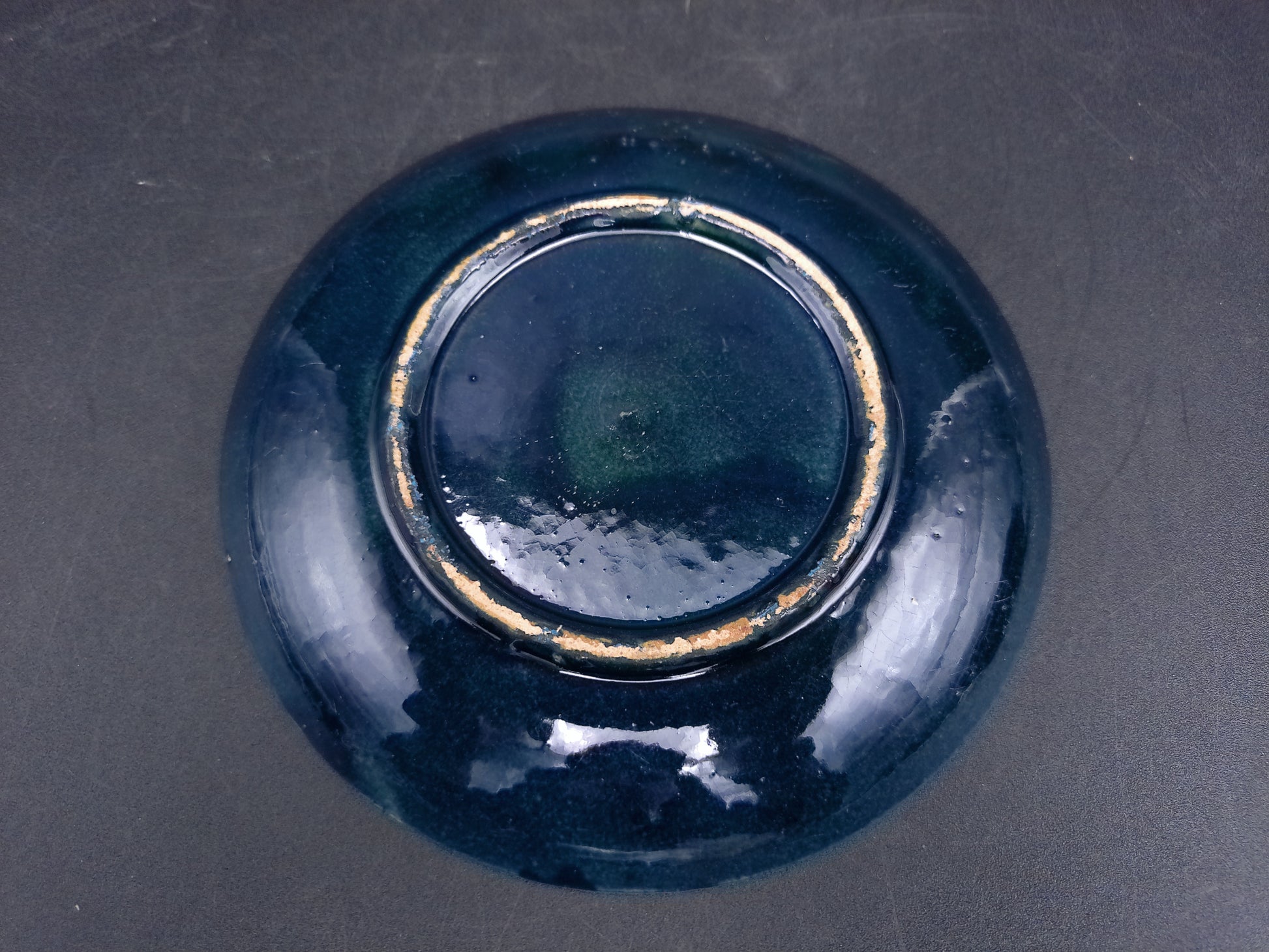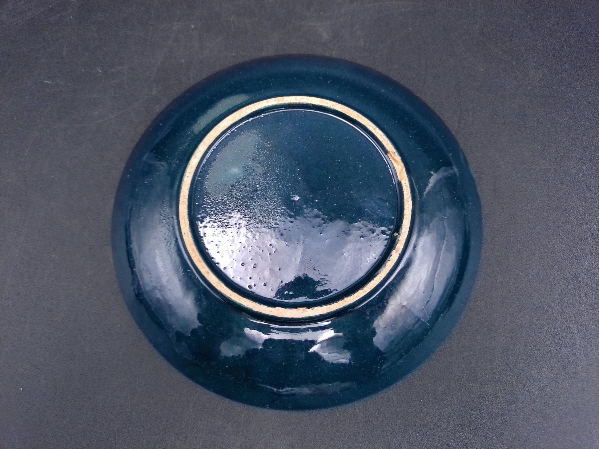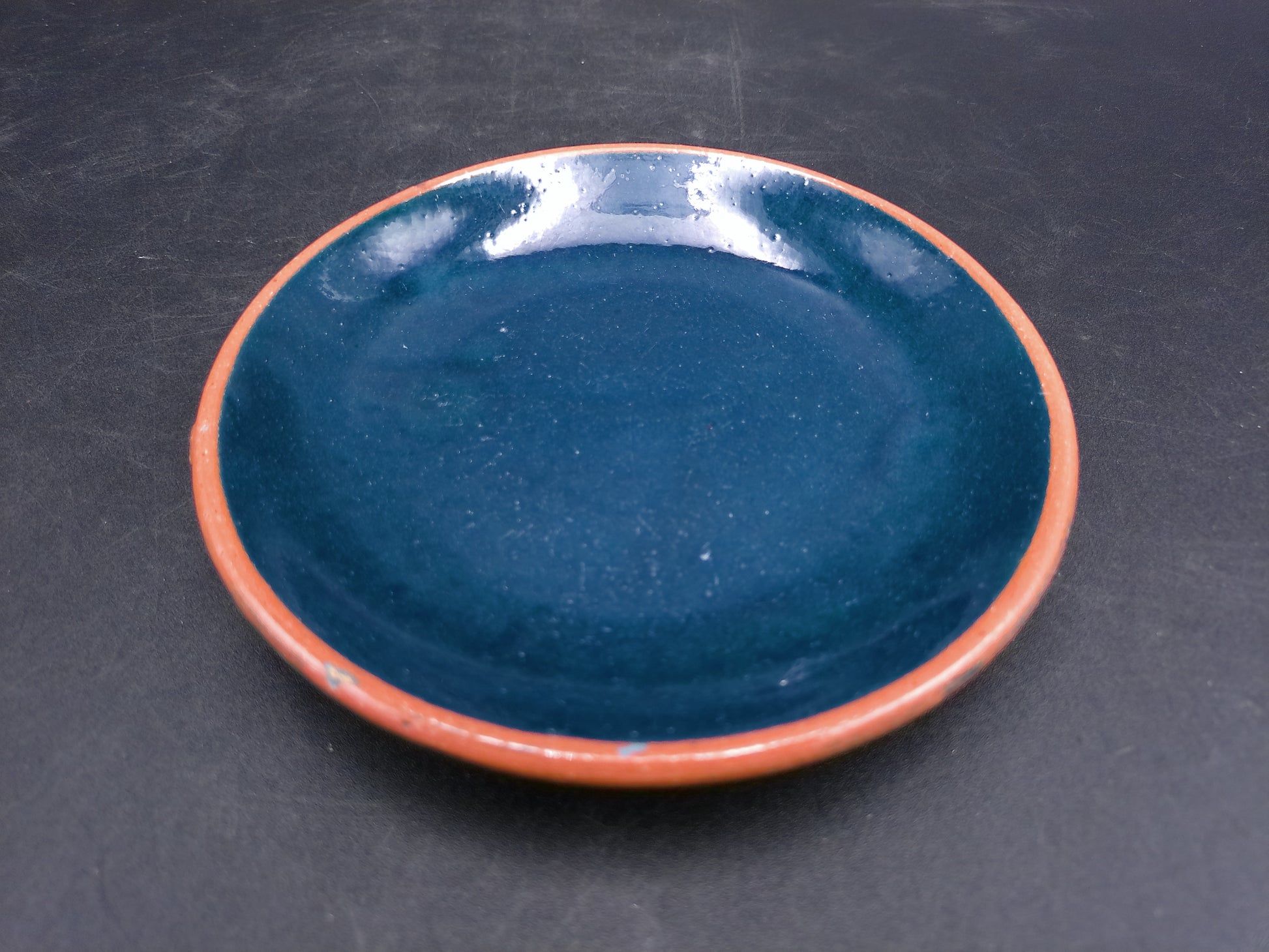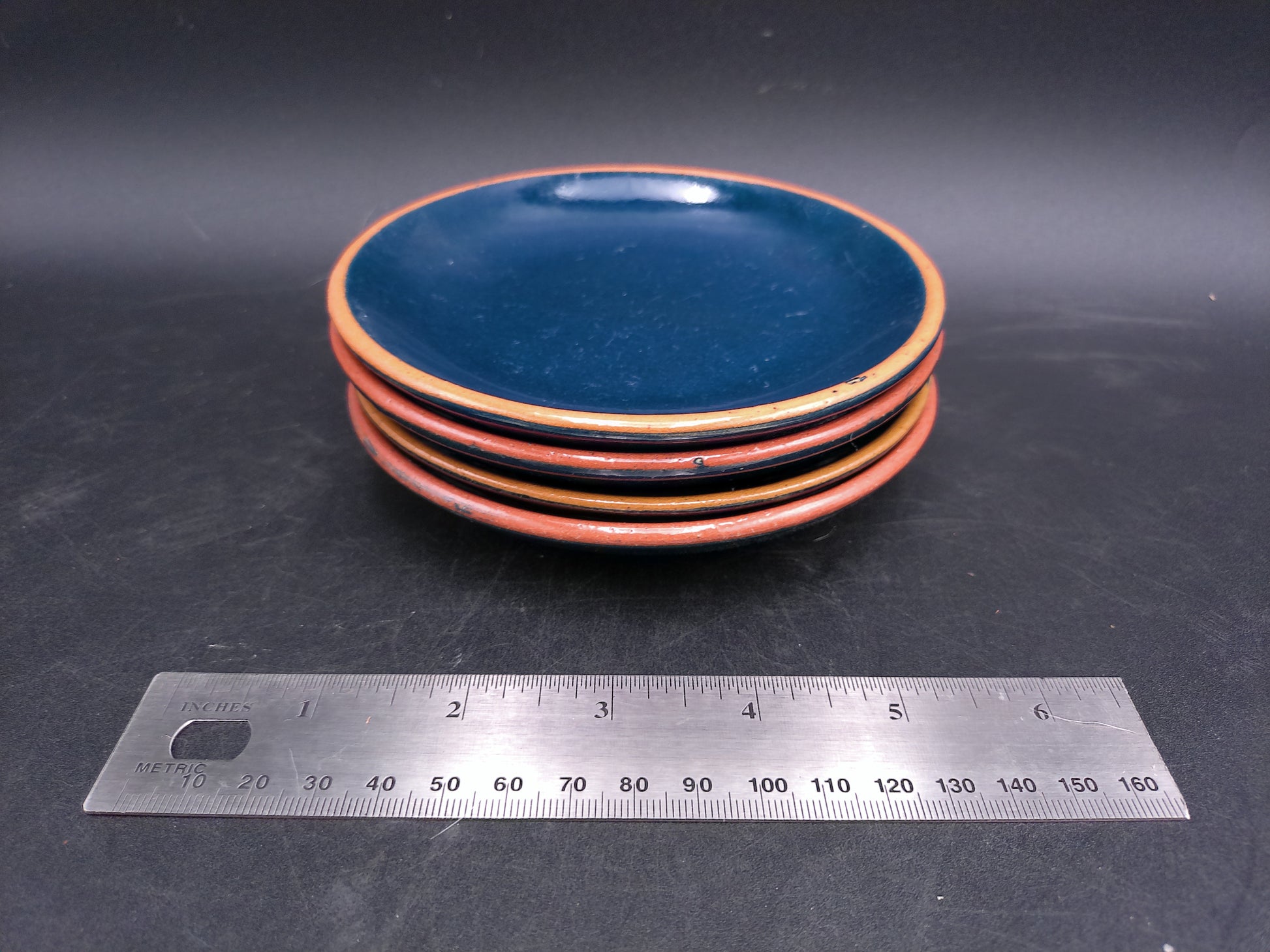 Expertly crafted vintage pottery set of 4 salad plates with blue and orange yellow rims. Perfect for serving healthy salads and snacks in style. Each plate is unique and adds a touch of retro charm to any table setting. Made of durable and high-quality materials for long-lasting use.