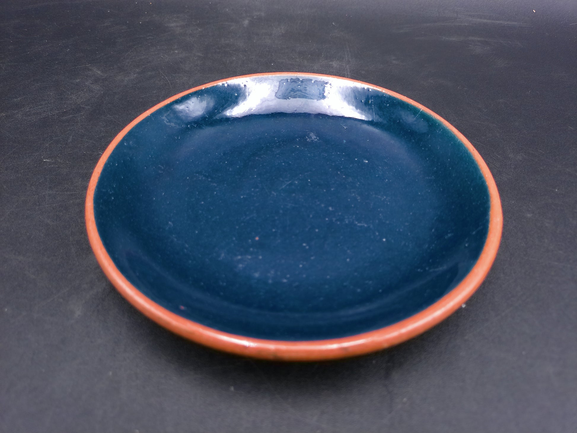 Pottery Juice Berry Blue and Orange Yellow Rim Salad Plate Set of 4 Vintage
