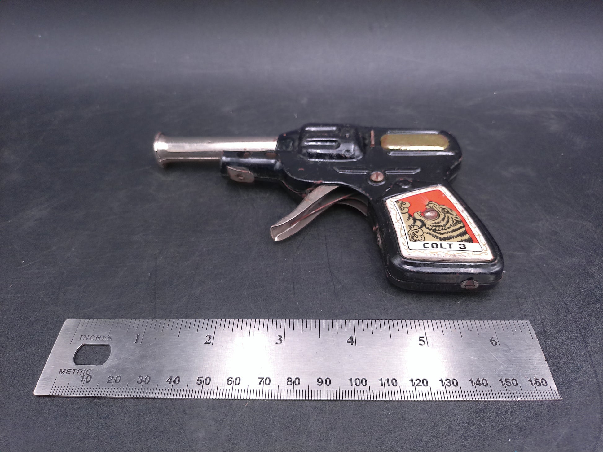 Vintage Japan Tin Colt 3 Cork Toy Pistol