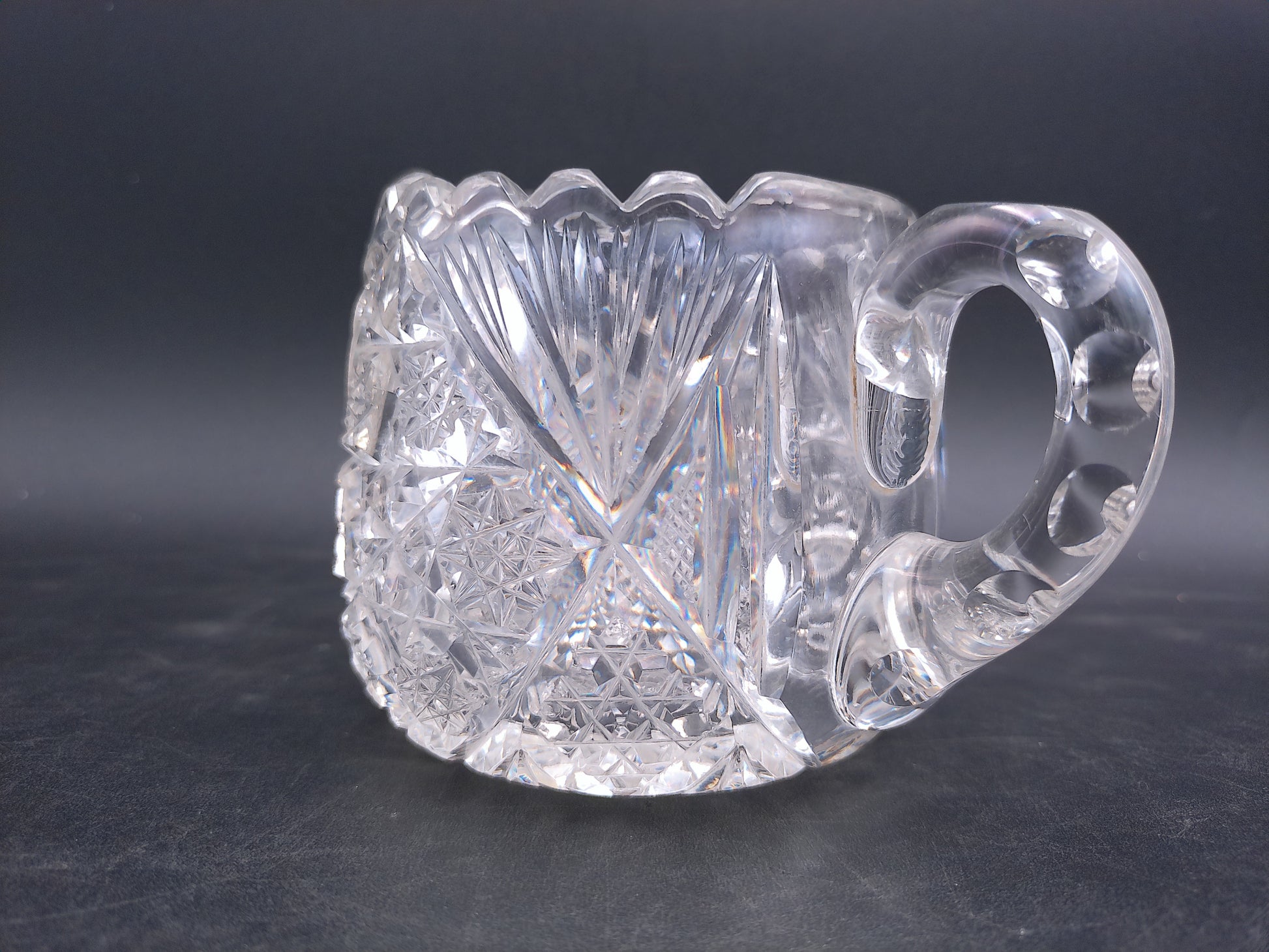 Indulge in timeless elegance with this Small Beautiful Vintage Crystal Creamer. Meticulously crafted with precision-cut facets that capture and reflect light with mesmerizing brilliance, this exquisite piece transforms ordinary dining experiences into extraordinary moments. Perfect for serving cream or as a decorative accent, this versatile treasure adds a touch of sophistication that modern reproductions simply cannot match. Don't miss this opportunity to own a piece of crystalline history.