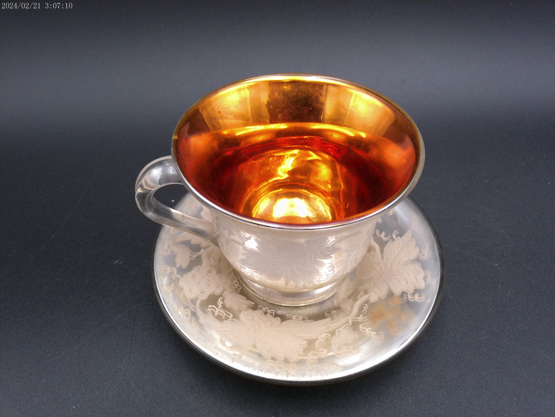 Crafted with expert precision, this antique Victorian silver cup and saucer set features hand blown mercury glass and delicate floral details. The elegant design exudes a timeless charm, perfect for adding a touch of sophistication to any tea or coffee experience. Elevate your table setting with this exquisite set.