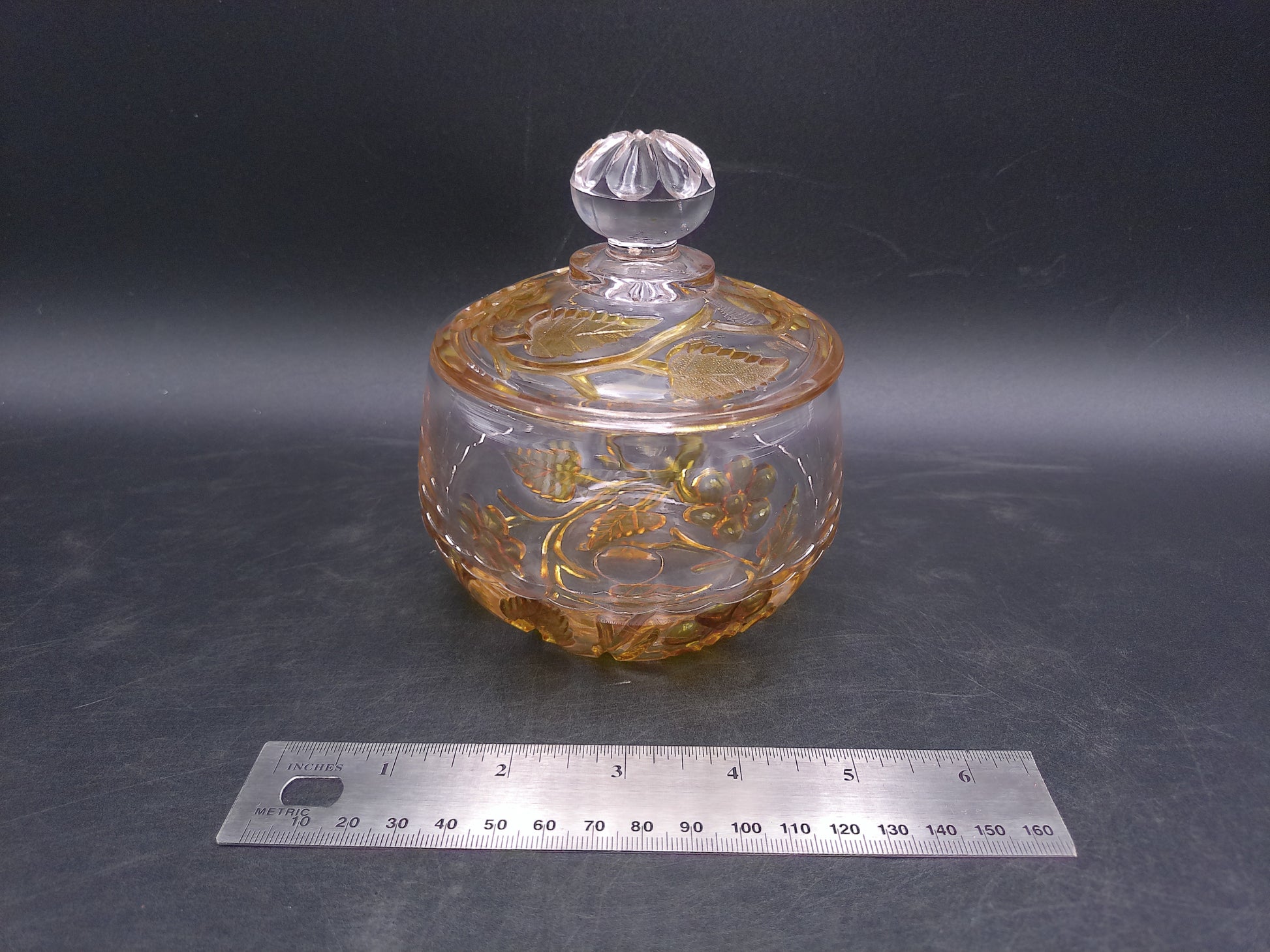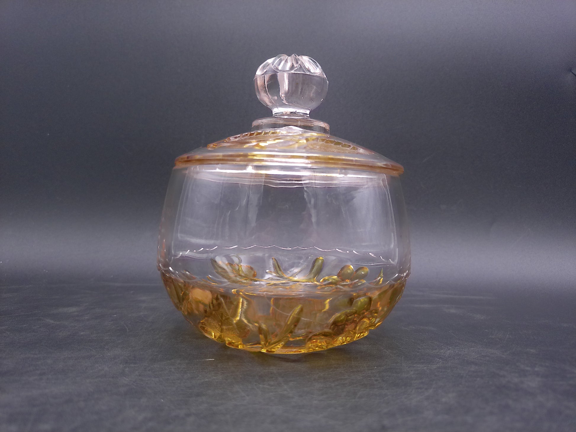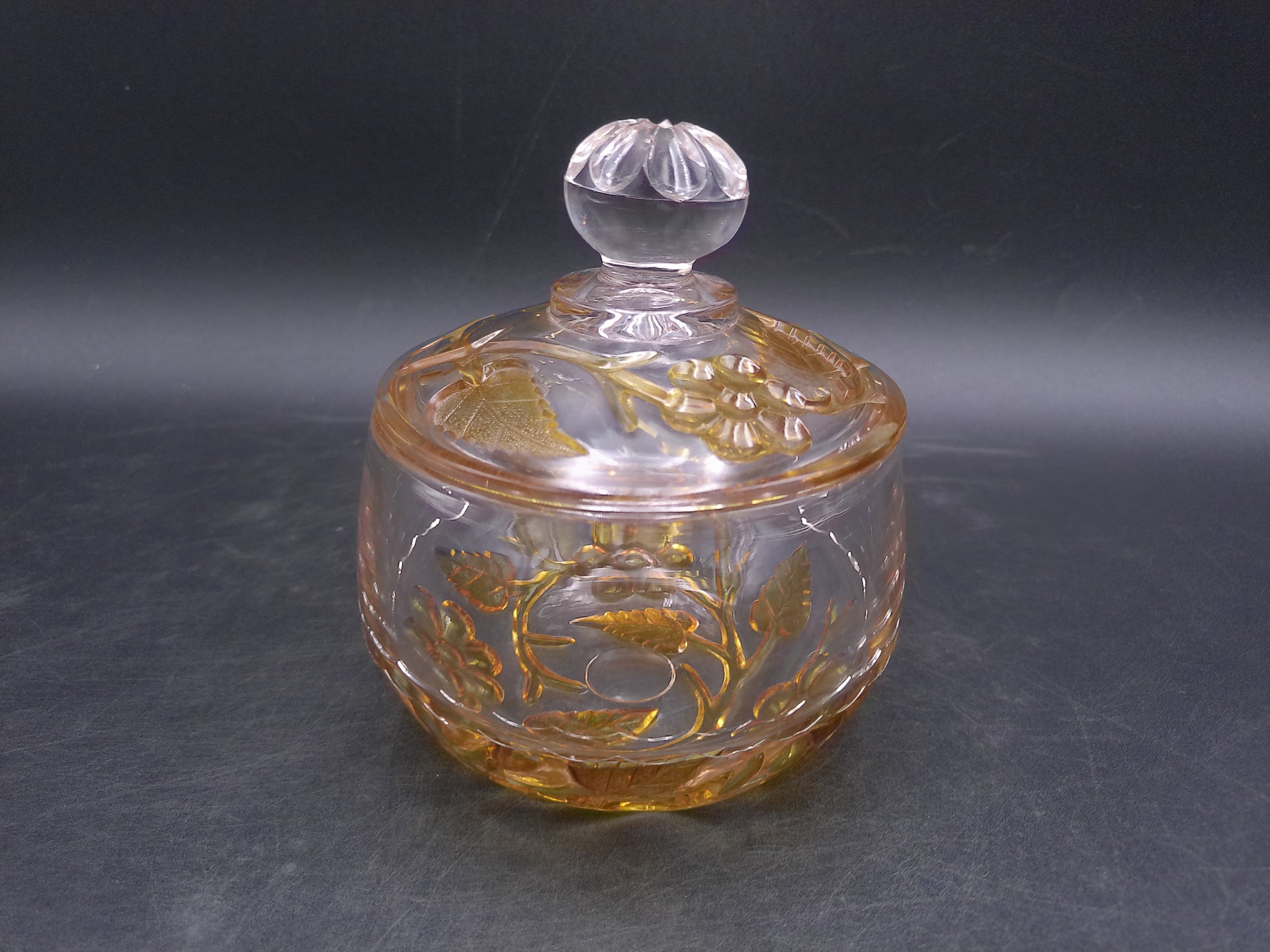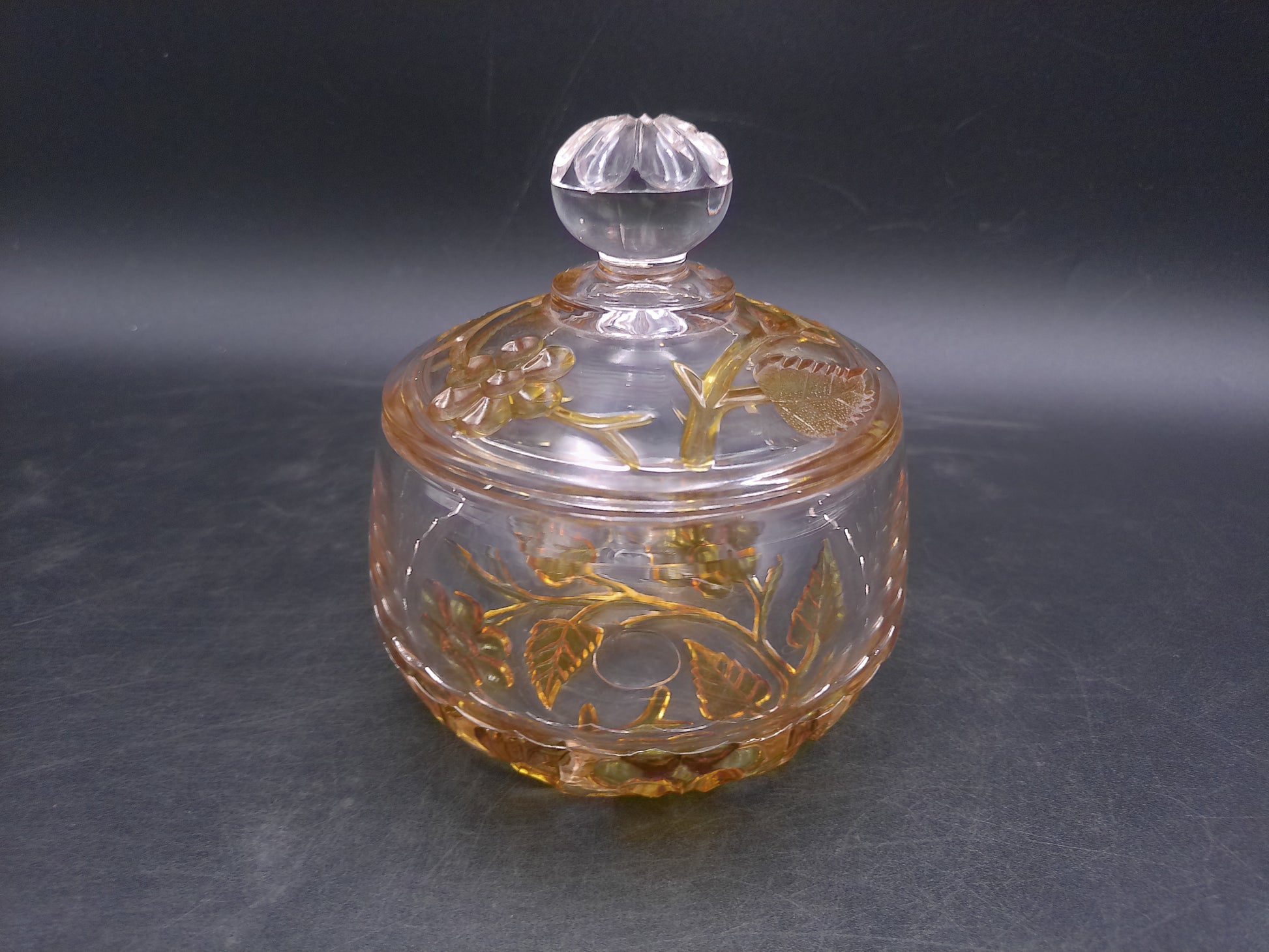 Old and Rare Crystal Candy or Jam Jar Amber Glass Floral Glass Design with Lid