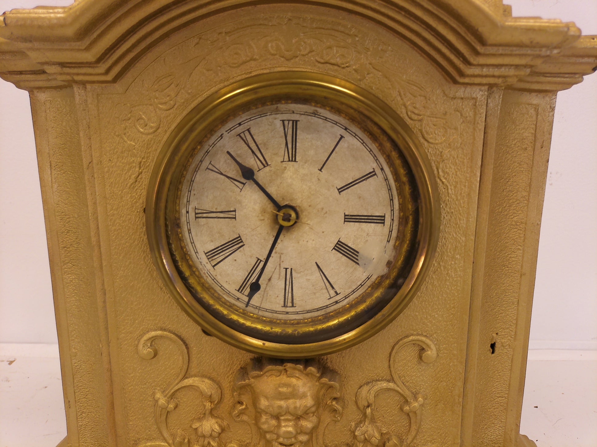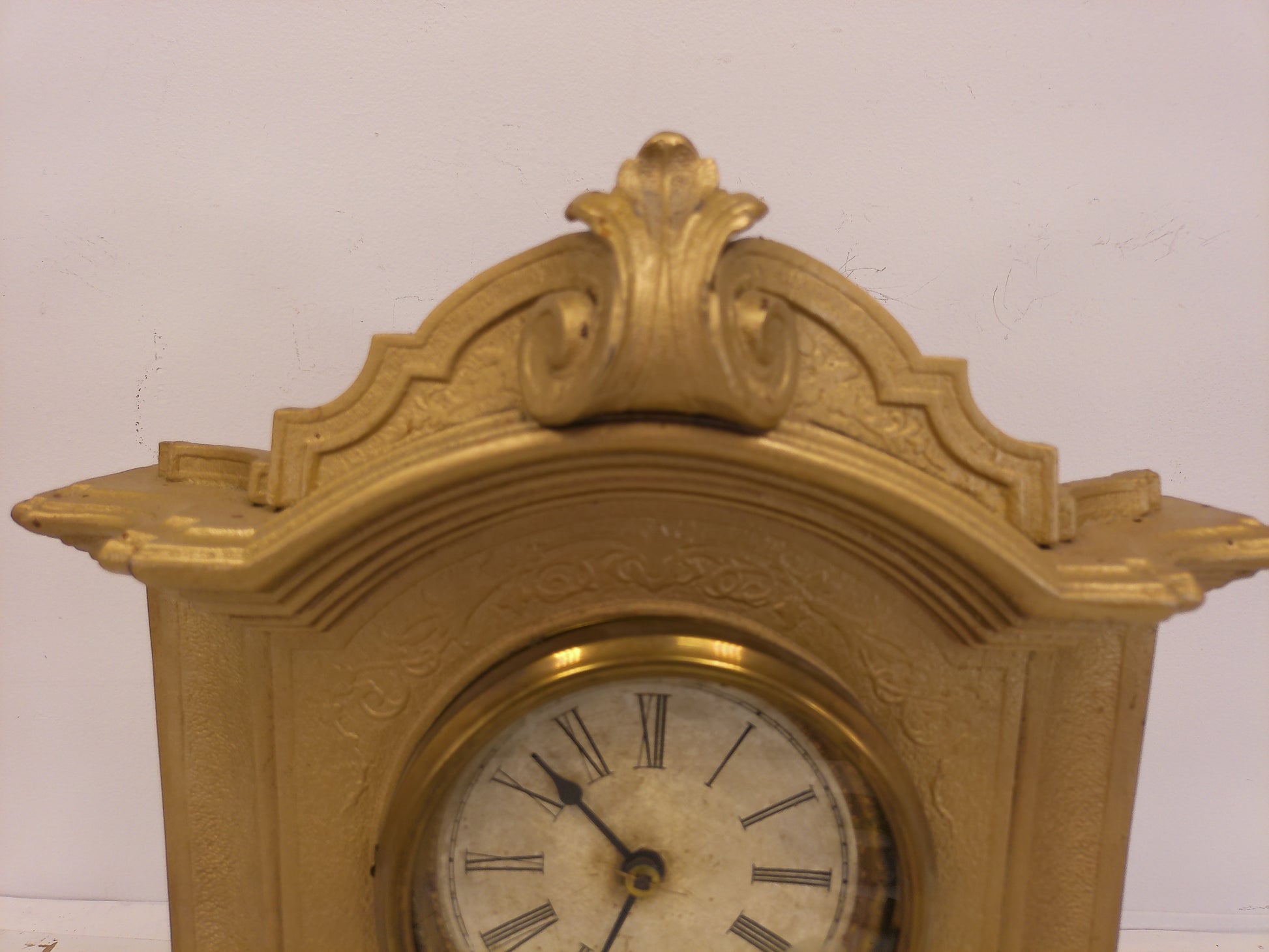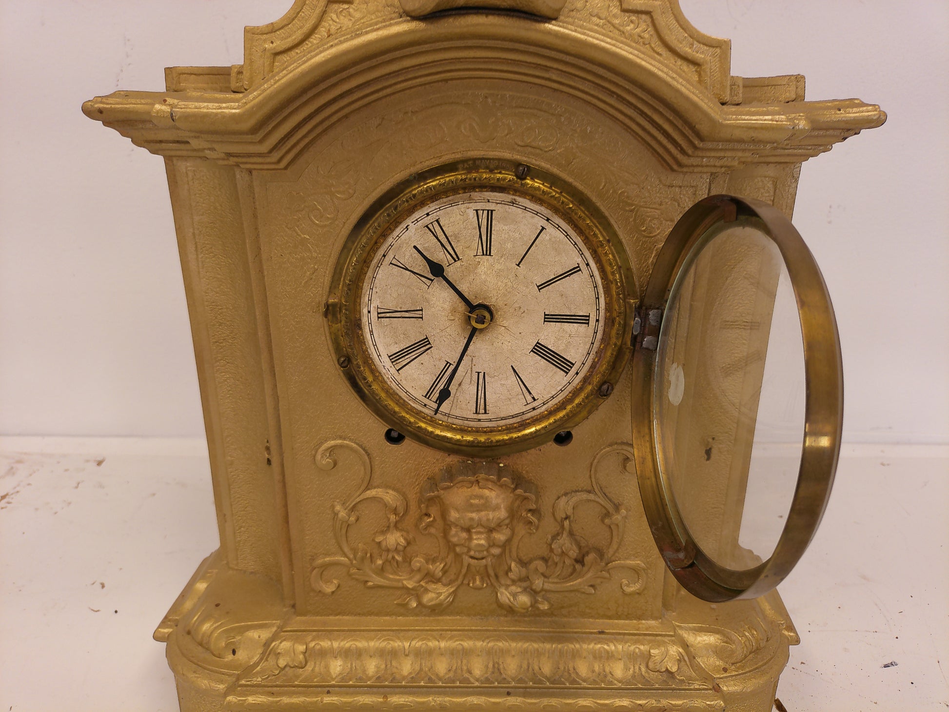 This ornate mantel clock is crafted from high-quality, painted brass with antique gold finish. Its intricate design adds a touch of elegance to any room. Enjoy accurate timekeeping and a beautiful centerpiece with this antique-style clock.