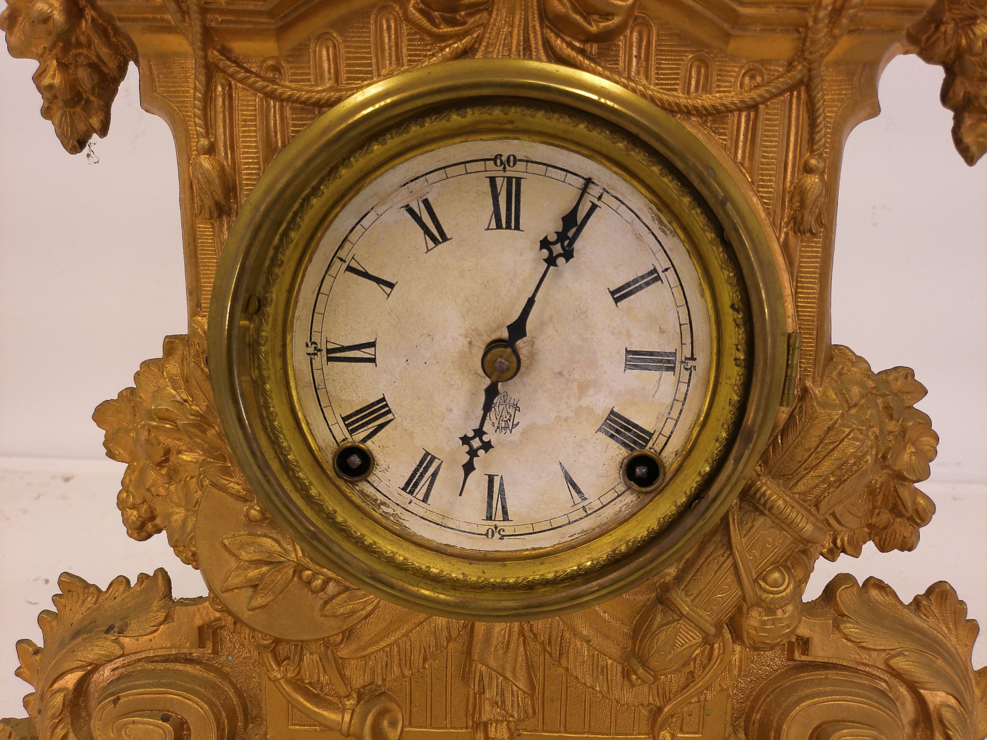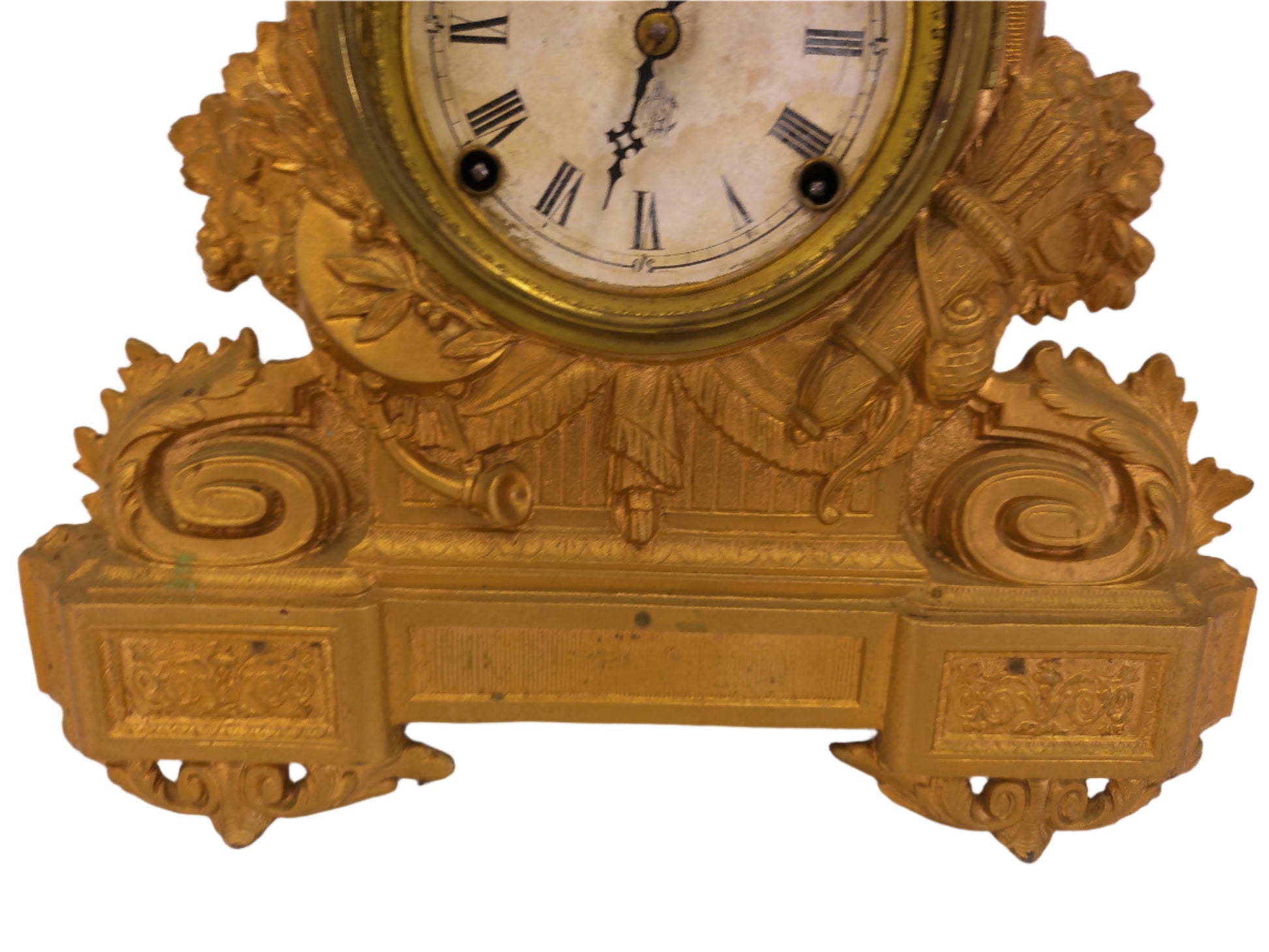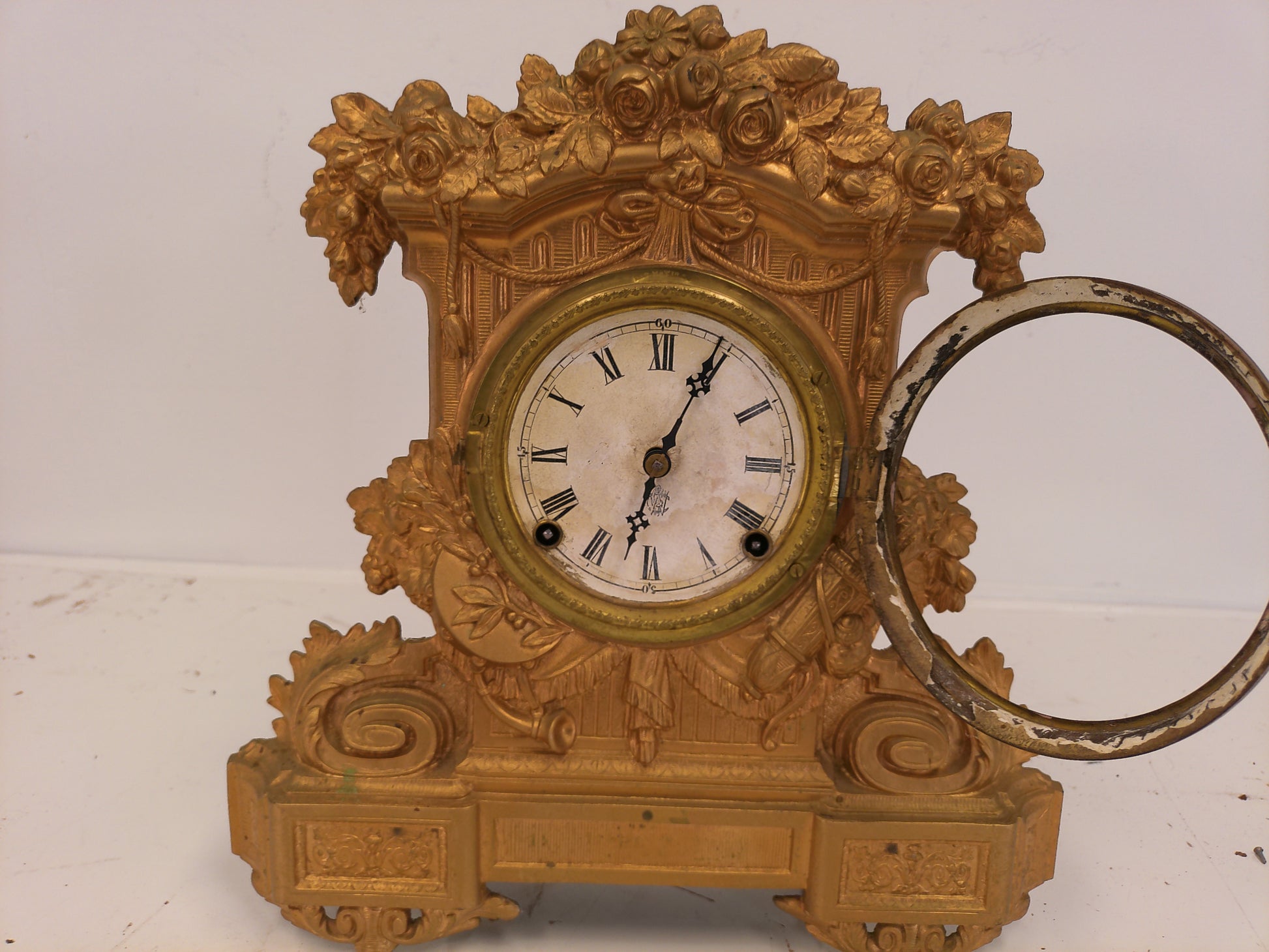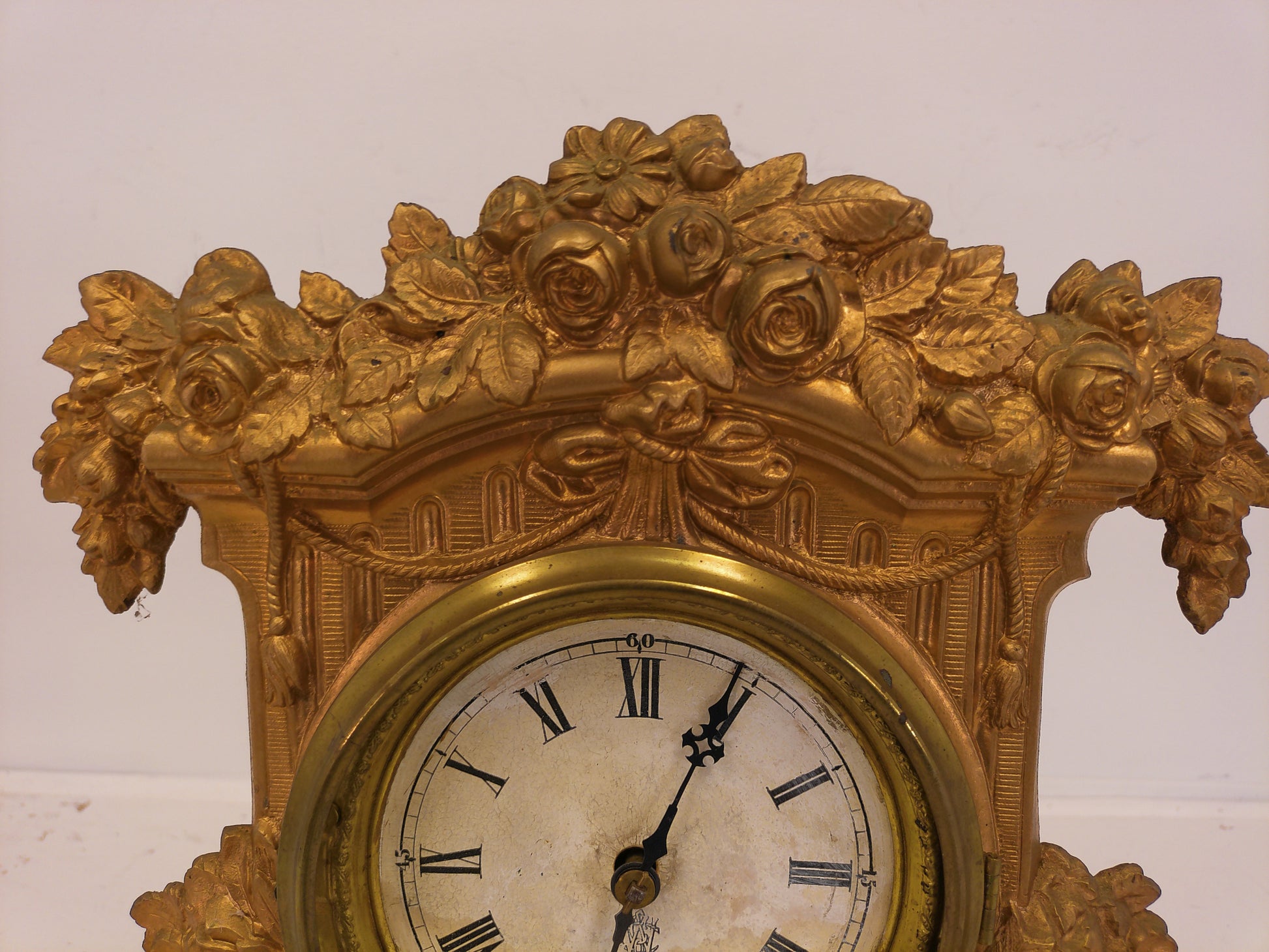This ornate antique clock boasts an elegant gold metal design with a sturdy wood backing. Its intricate details and vintage look make it a timeless addition to any room. The durable materials ensure long-lasting use and the precise clock mechanism ensures accurate timekeeping. A beautiful and functional piece for any decor.