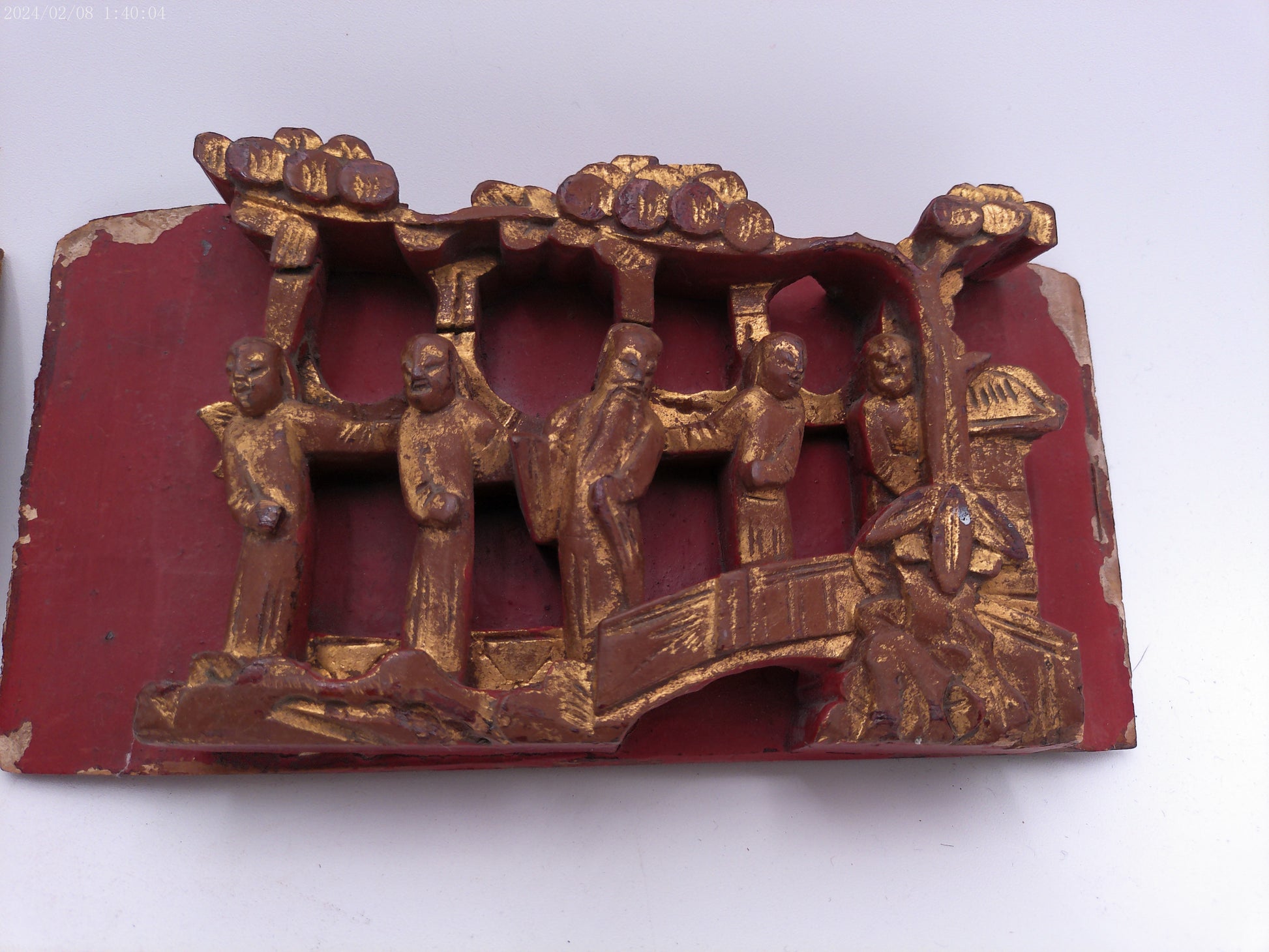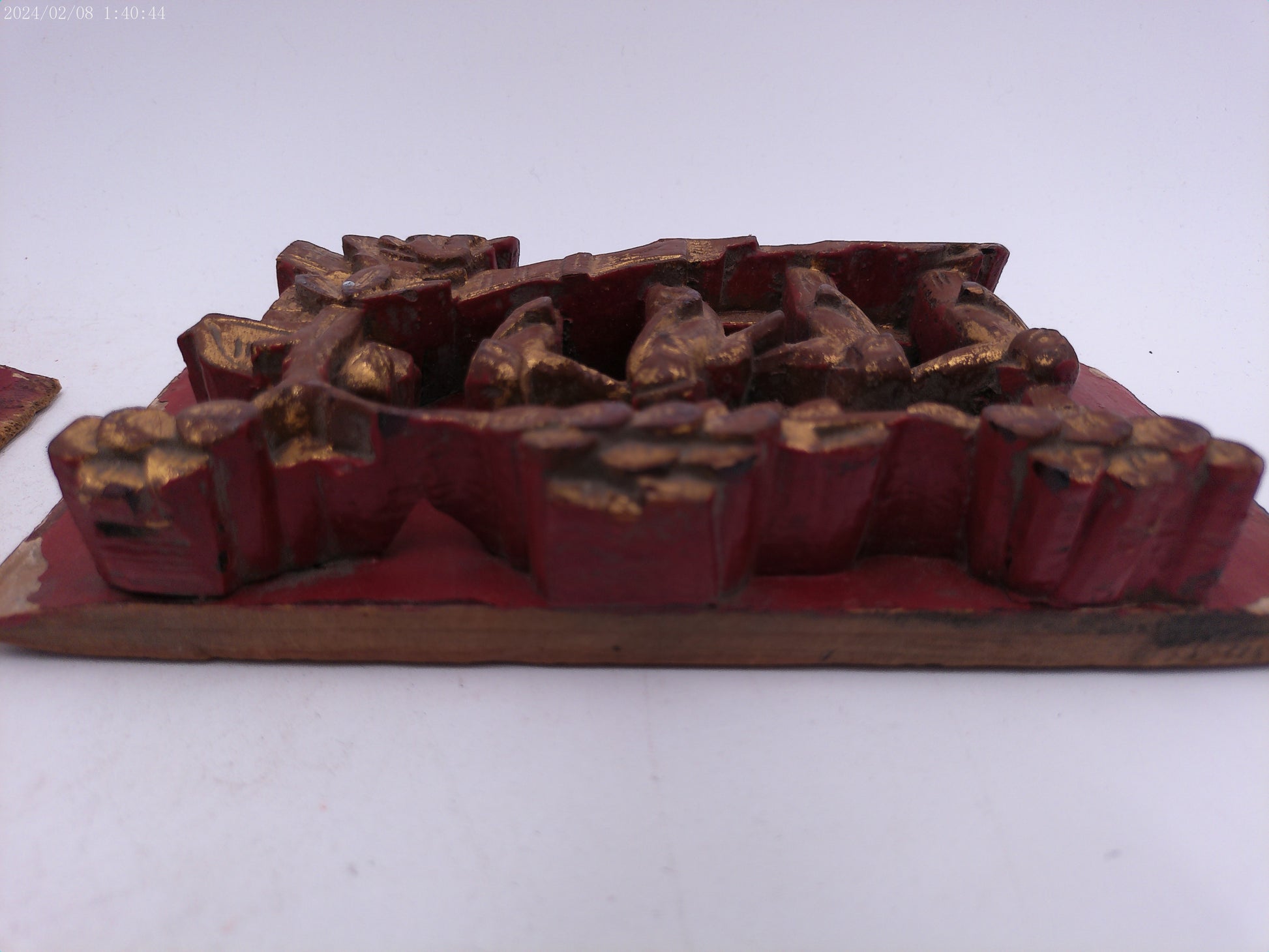 These Chinese carved wood gold leaf panels feature intricate designs and expert craftsmanship. Hand-carved from high-quality wood and adorned with luxurious gold leaf, these panels add a touch of elegance and cultural authenticity to any space. Enhance your interior decor with these unique and beautifully detailed panels.