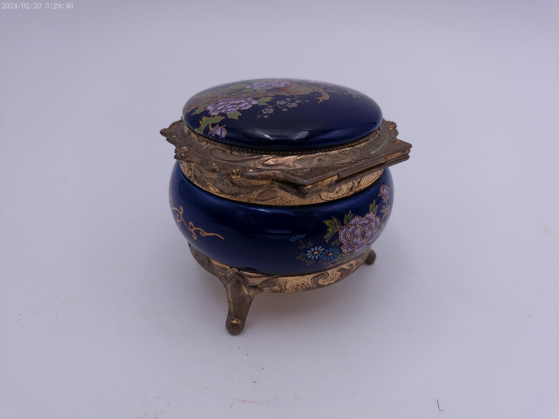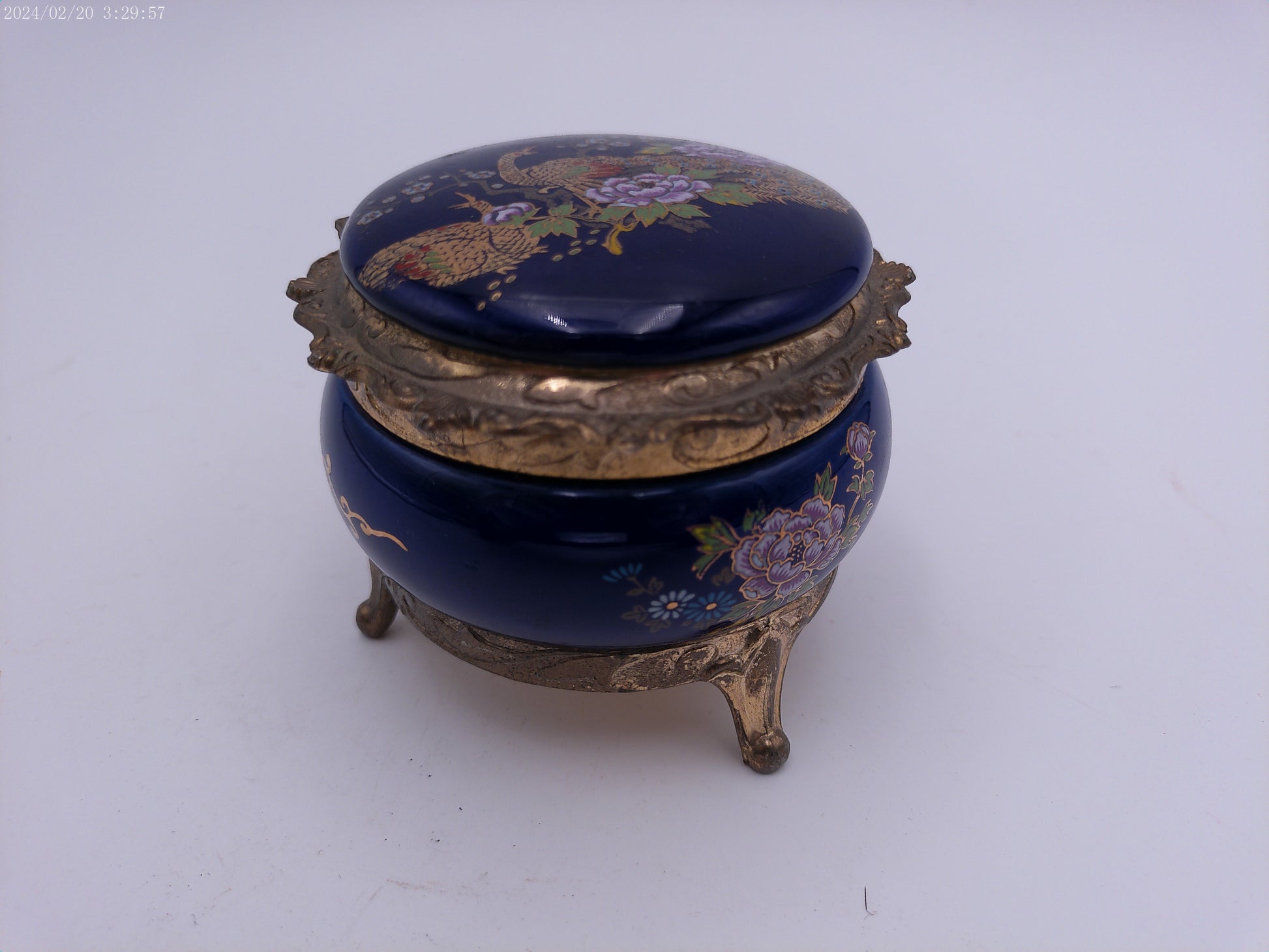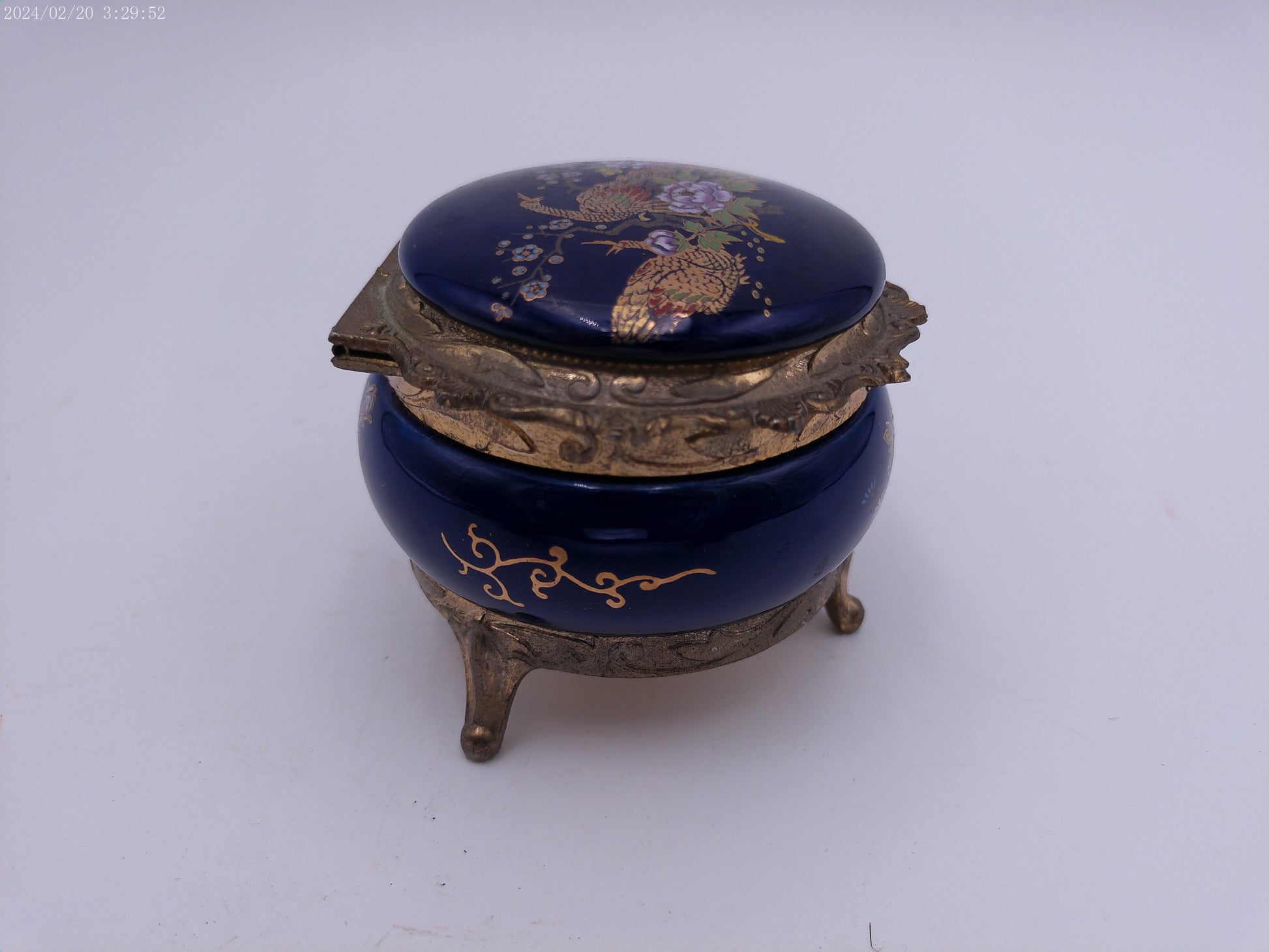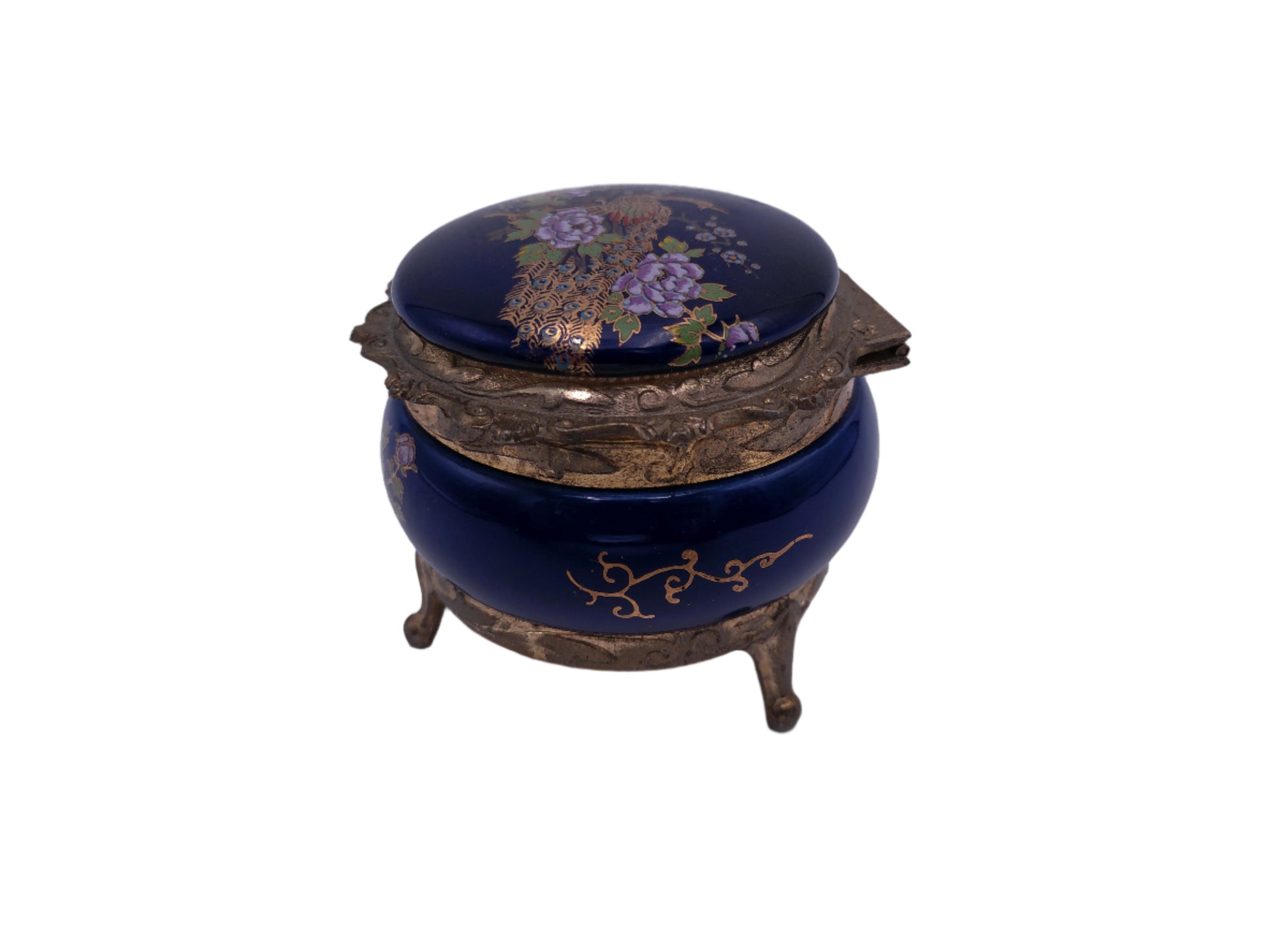 Peacock Music Box Trinket Royal Blue Porcelain & Gold Metal Stunning