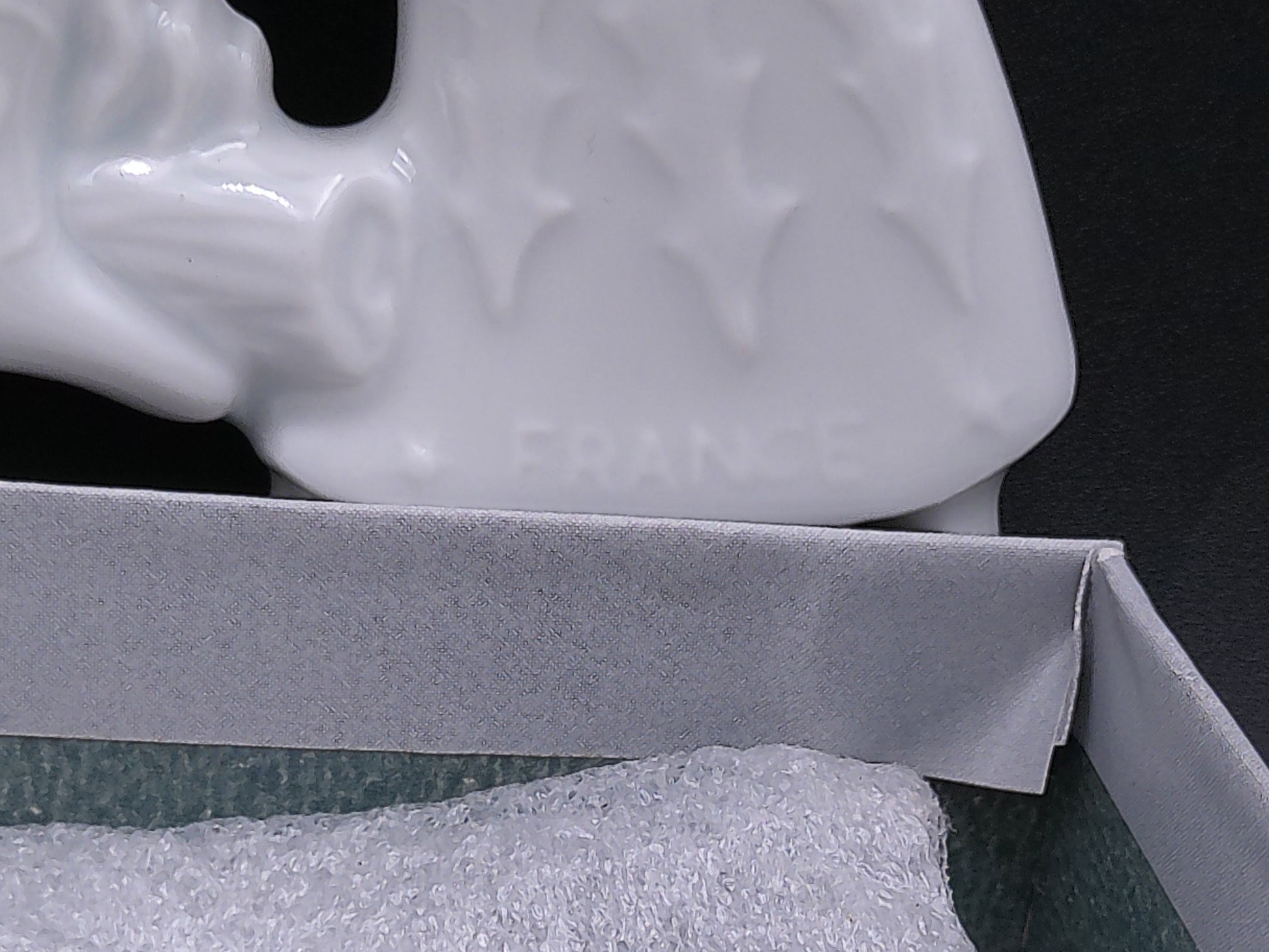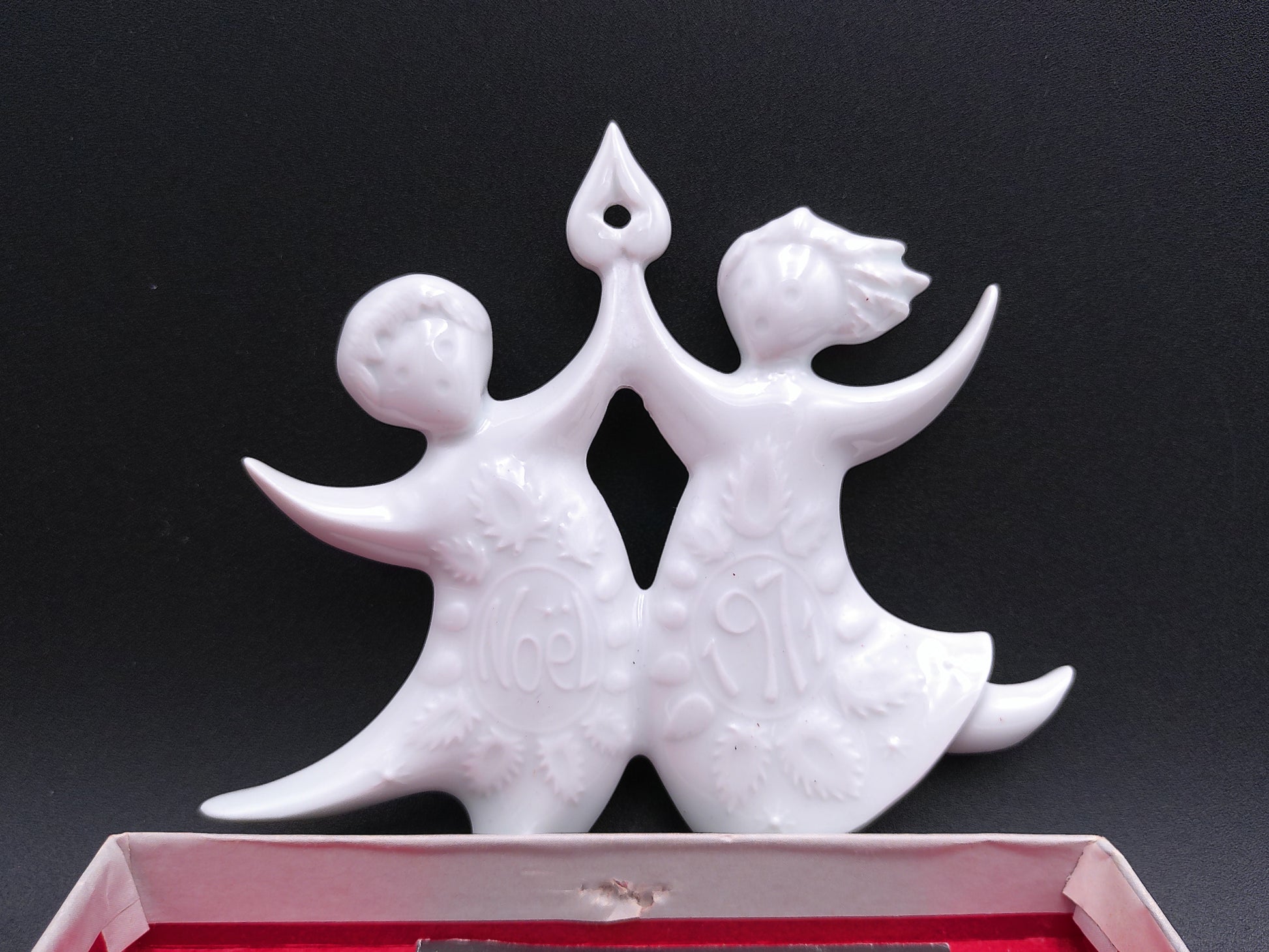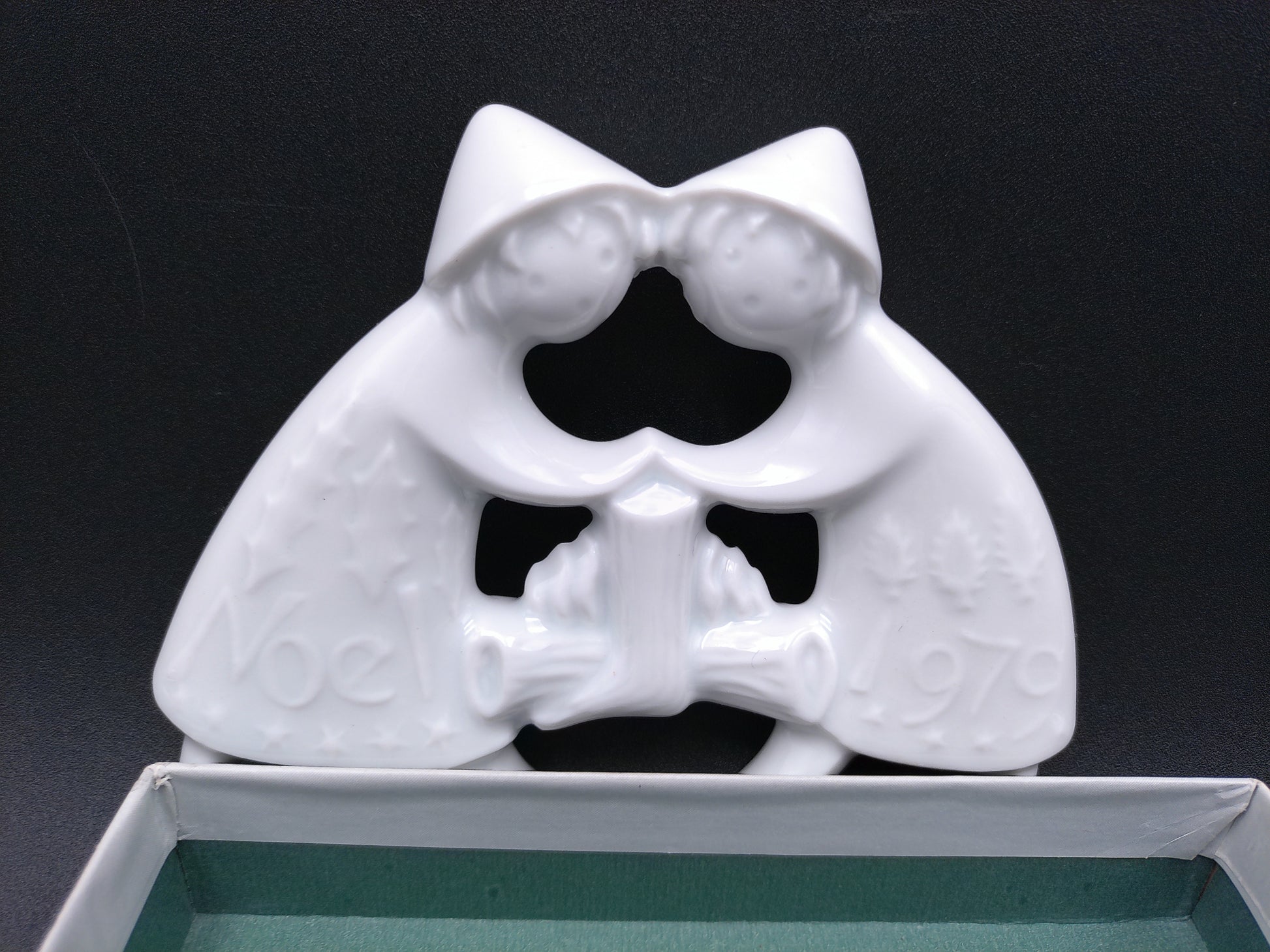 Add a touch of luxury to your holiday decor with these Haviland Limoges porcelain ornaments. Designed and crafted in France in 1979, the delicate Yule Log and Children design will add an elegant and timeless touch to your festive celebrations. These collectible ornaments come in a beautiful box, making them the perfect gift for any art and design enthusiast.