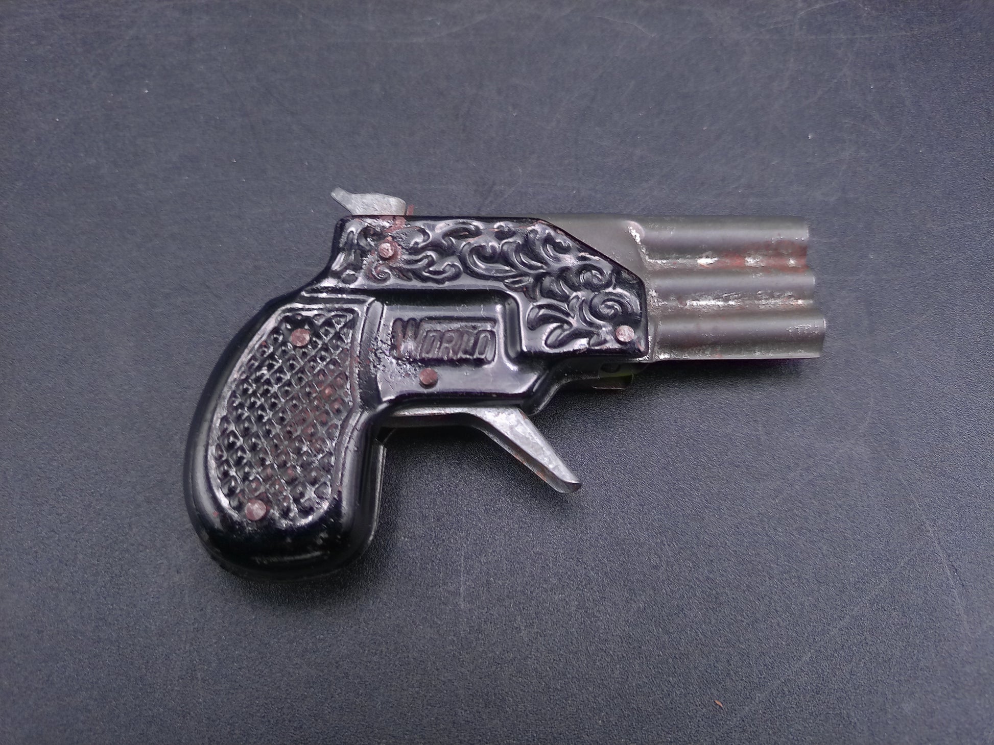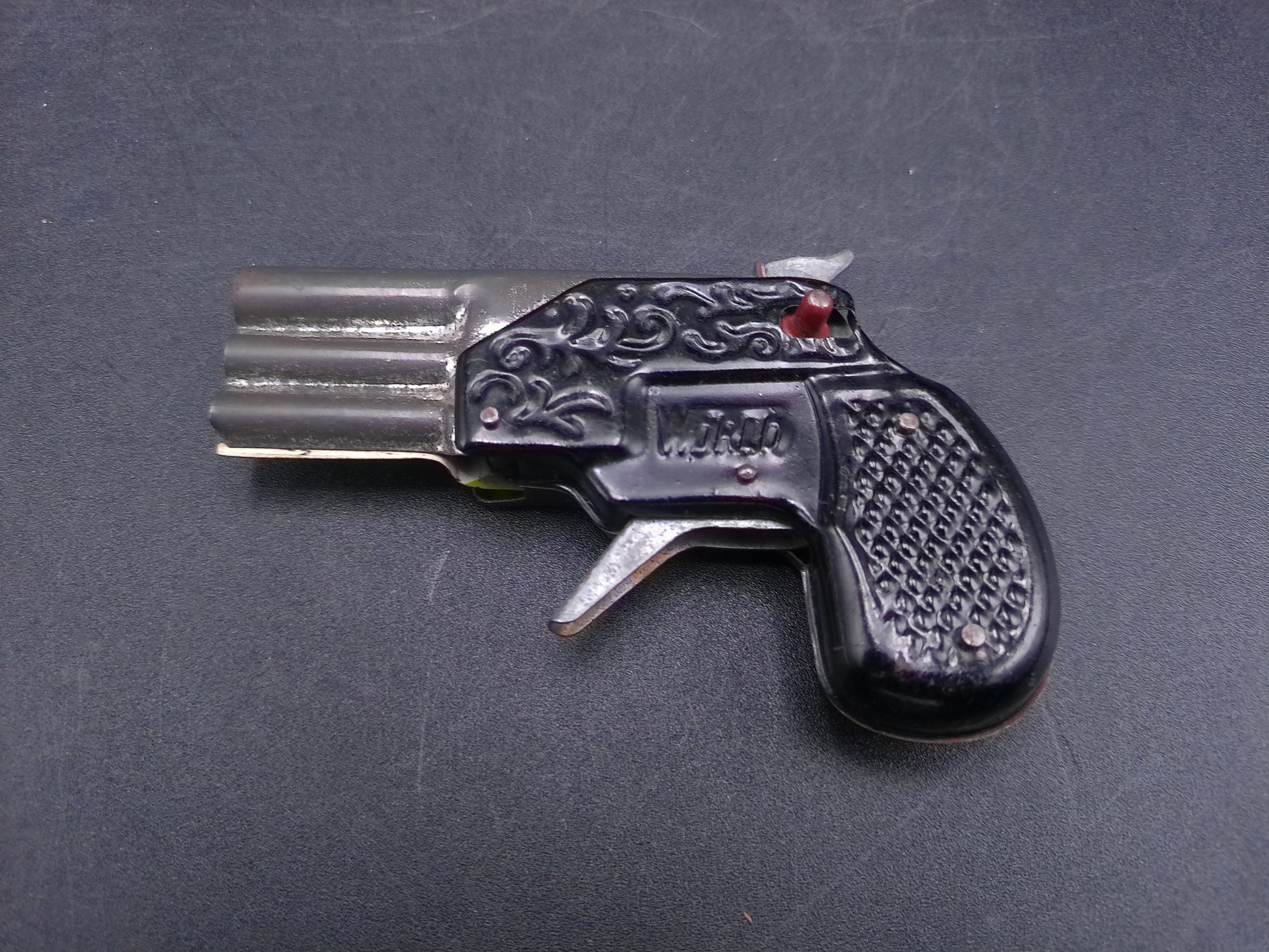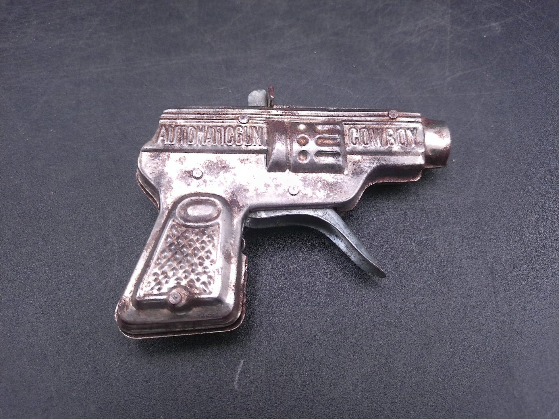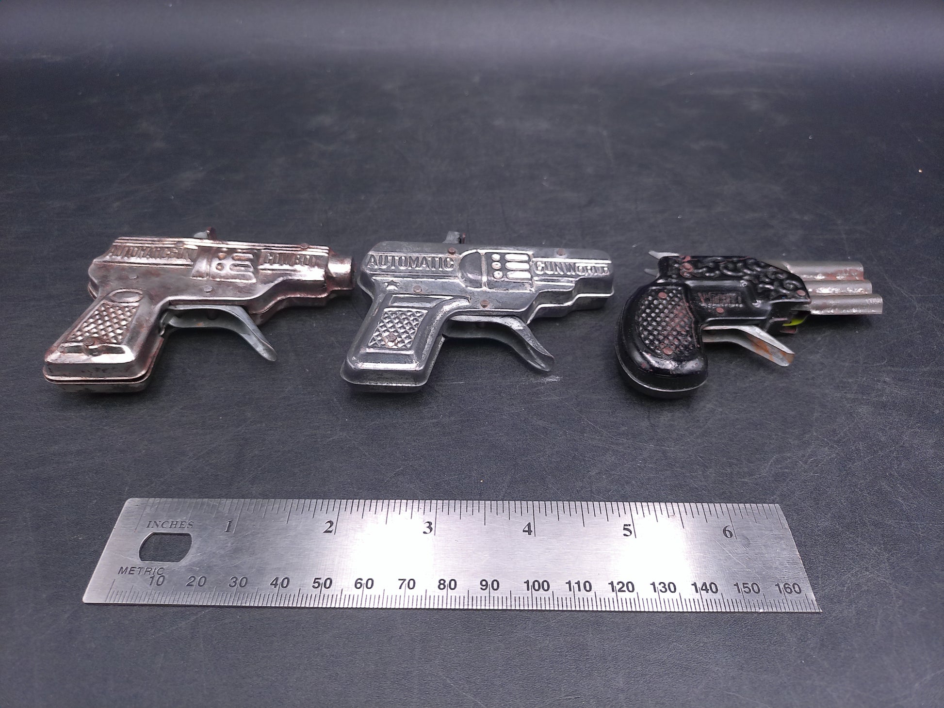 Step back in time with this charming set of three vintage metal cap guns, authentic pieces that capture the nostalgia of classic childhood play. Crafted from durable metal construction, these collectible toys feature detailed designs and genuine vintage appeal. Ideal for collectors seeking authentic memorabilia, enthusiasts of retro toys, or anyone looking to add character to a themed display. Each gun in the set showcases the craftsmanship of a bygone era, making them conversation starters for any collection. Whether you're preserving gaming history or seeking unique decorative pieces with personality, this trio delivers both charm and authenticity that modern reproductions simply cannot match.