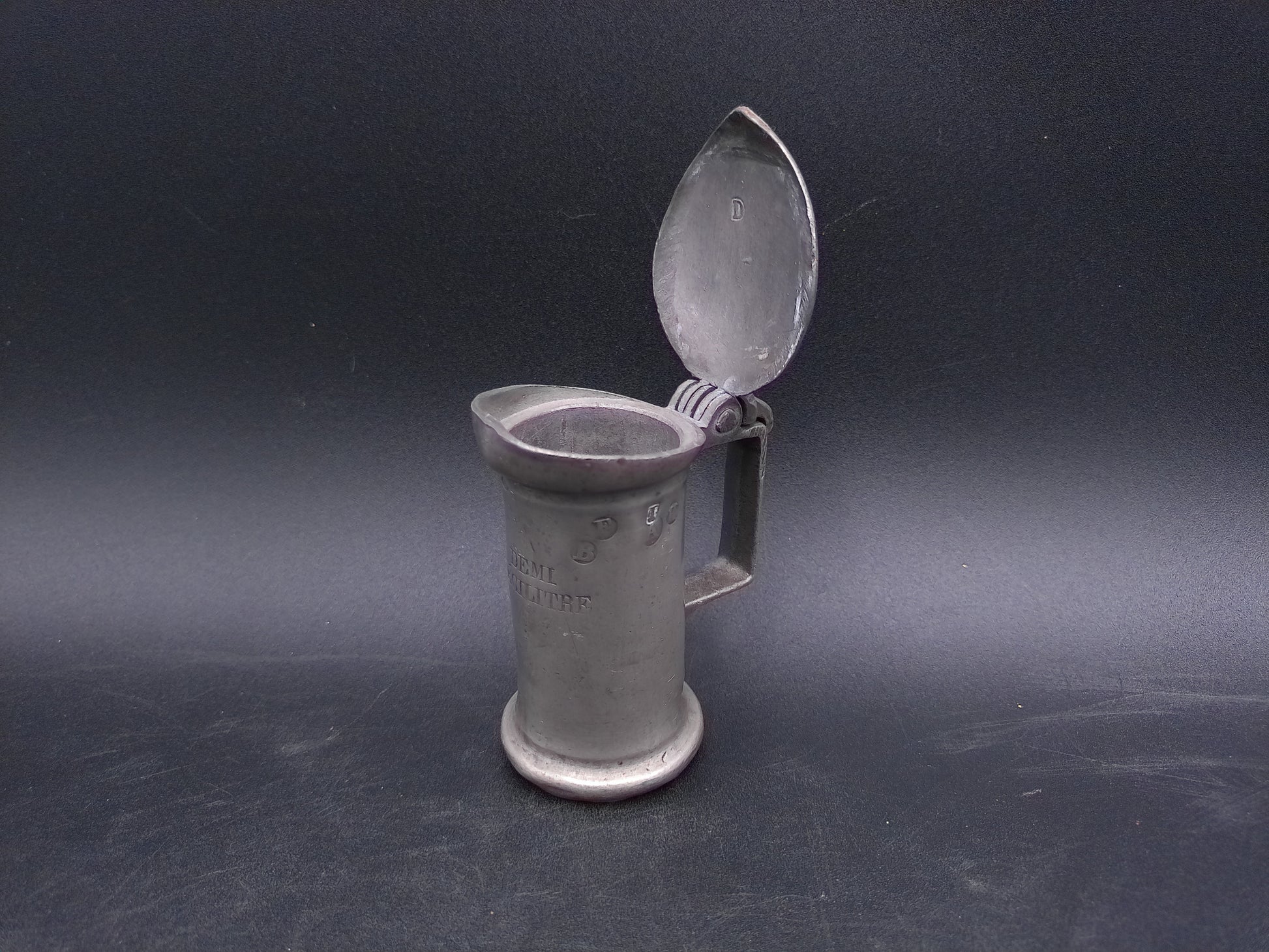 Elevate your kitchen tools with our Pewter Small Lidded Measuring Cup. Crafted from antique French pewter, this cup is both functional and elegant. Its lidded design ensures precise measurements and keeps ingredients fresh. Upgrade your cooking experience with this expertly crafted, antique measuring cup.
