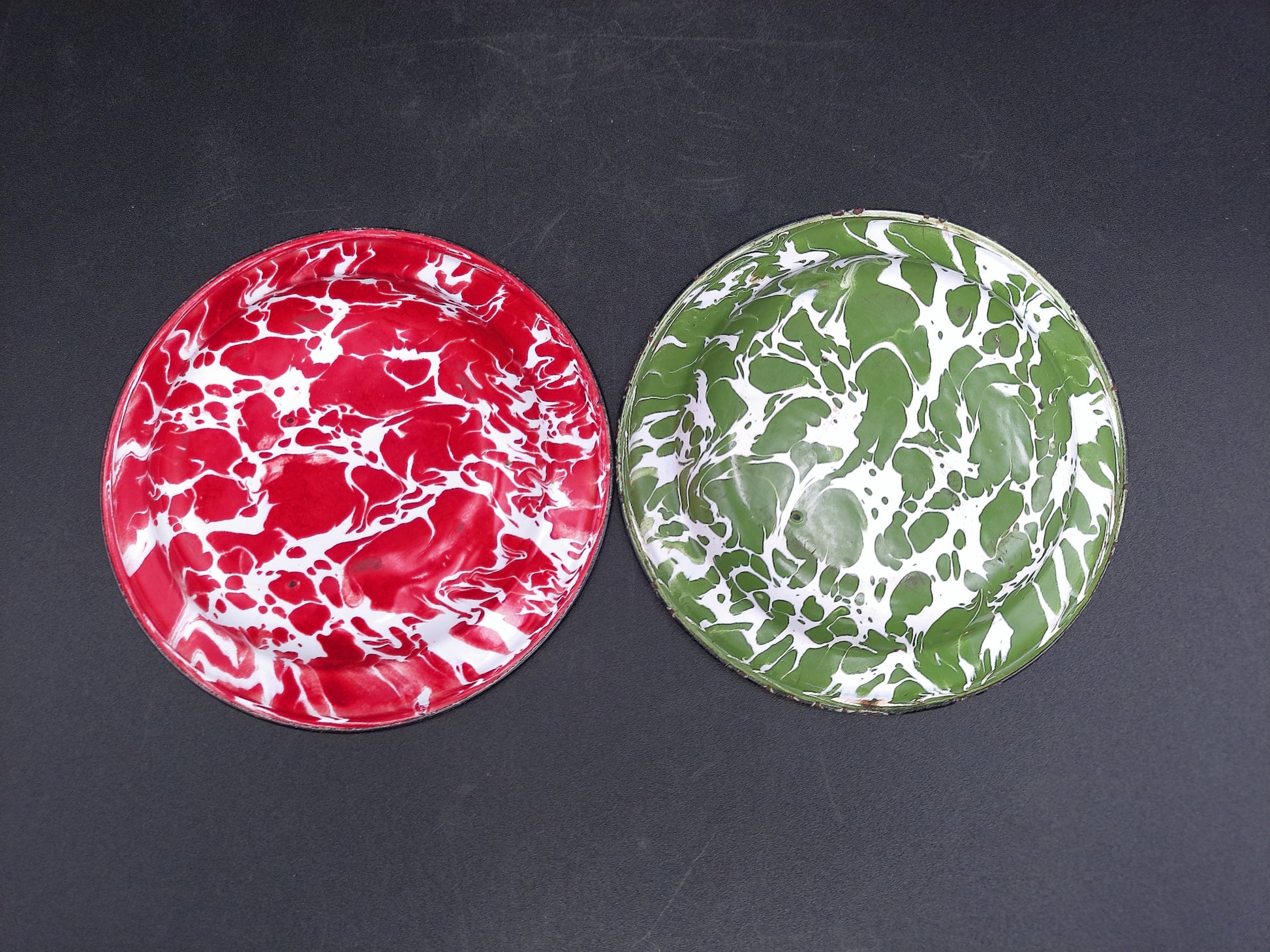 Pottery Plate Dish Green & White and Red & White Swirl Enamelware