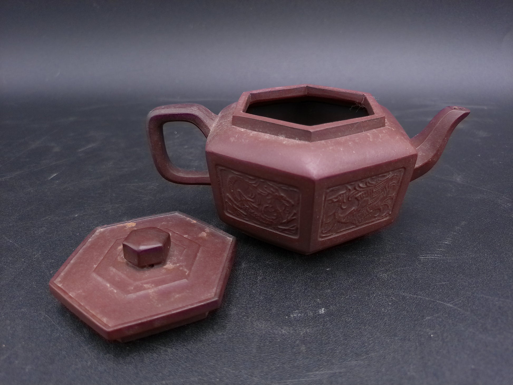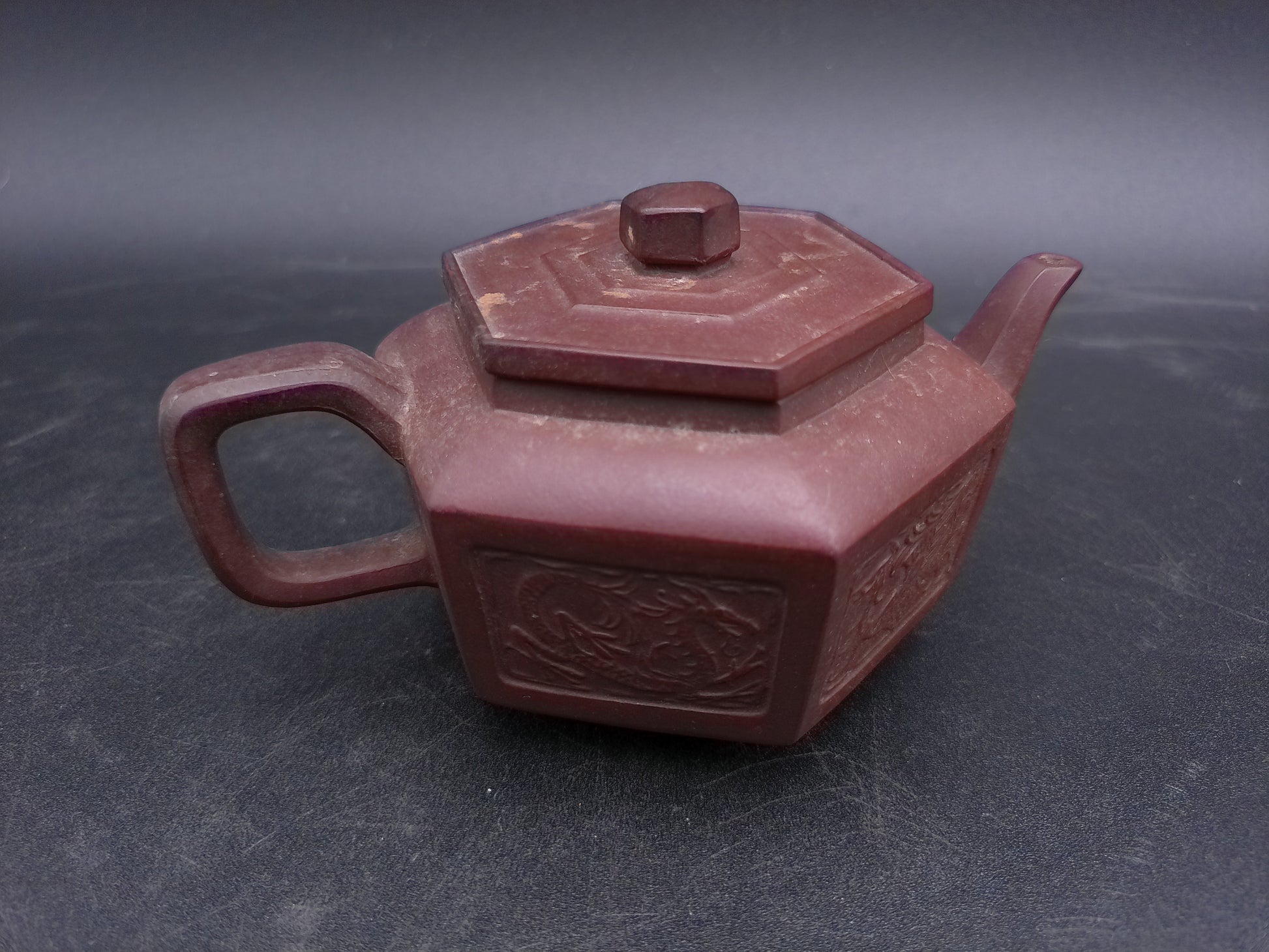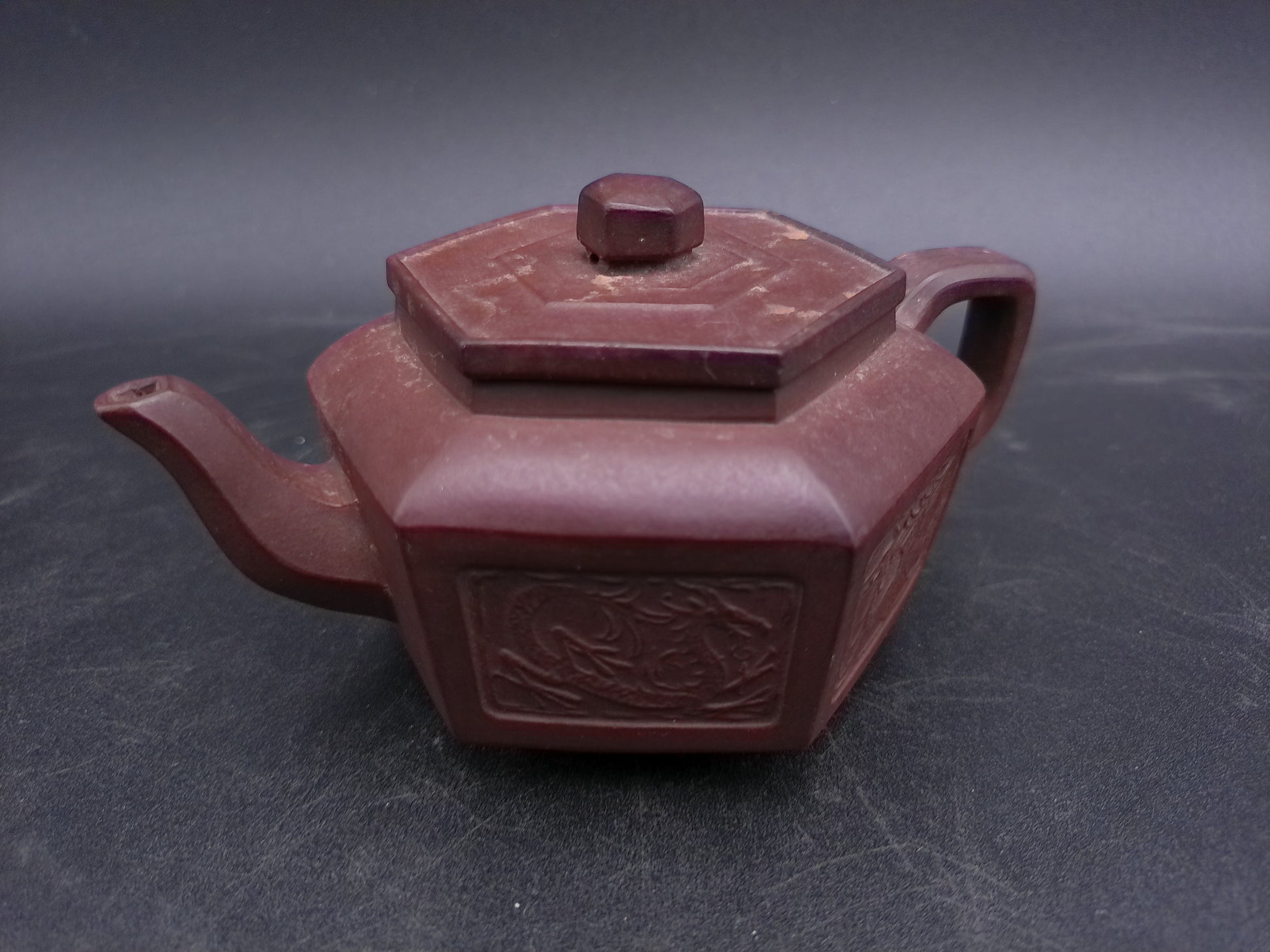 Chinese Teapot Vintage with Design maybe Dragon on sides Clay Brown Rustic Color