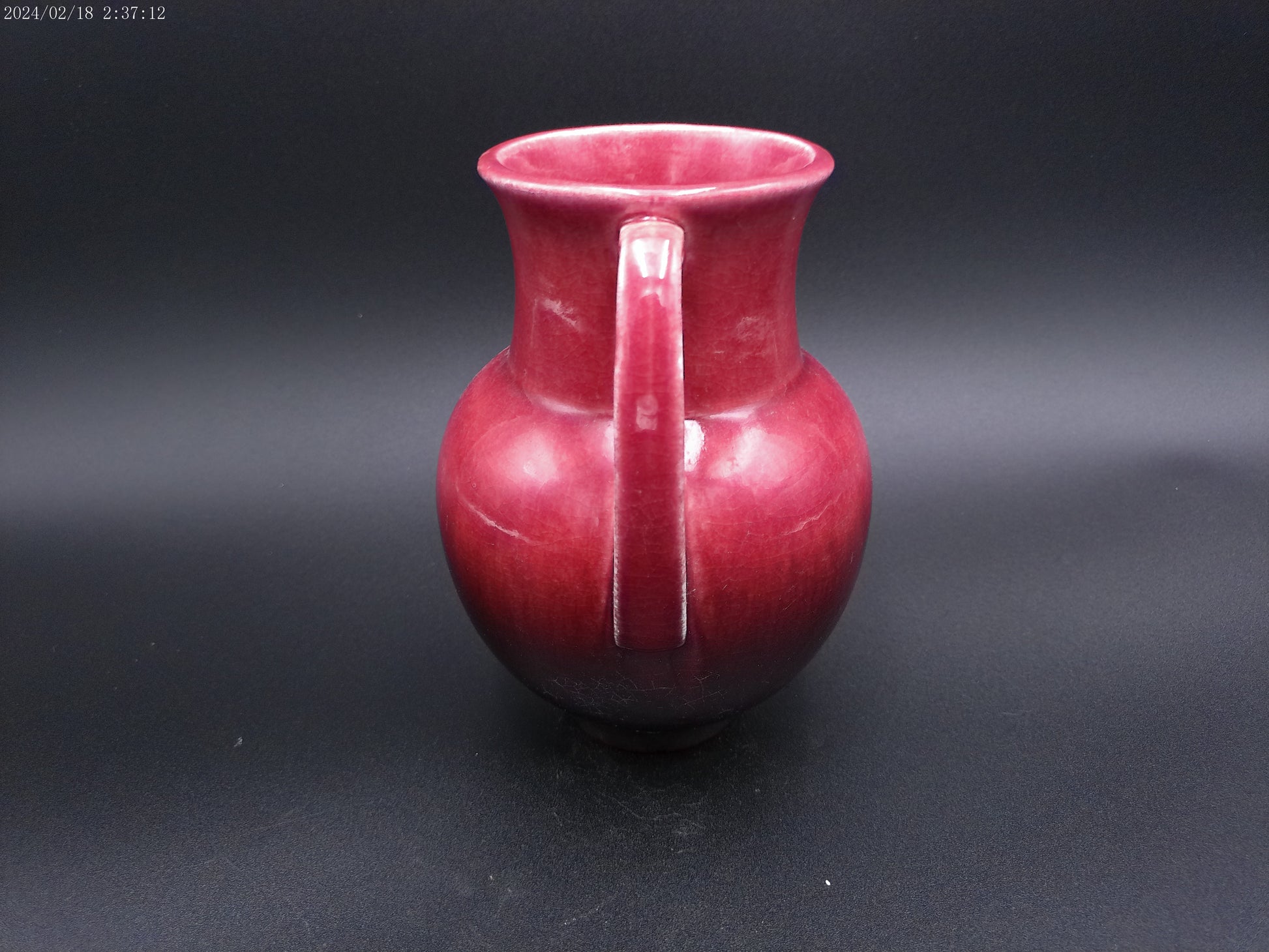 This Roseville jug vase features a vibrant red rose color with a signature and marking for authenticity. Handcrafted with care, this vase adds a touch of elegance to any room. Made to last, it's a beautiful addition to any collection.