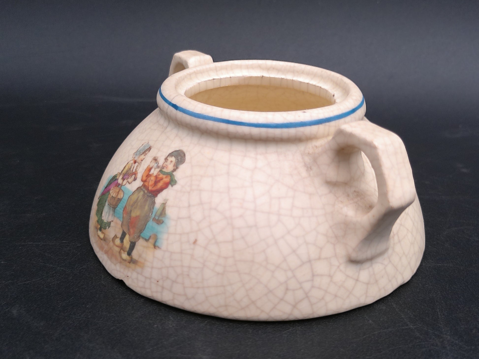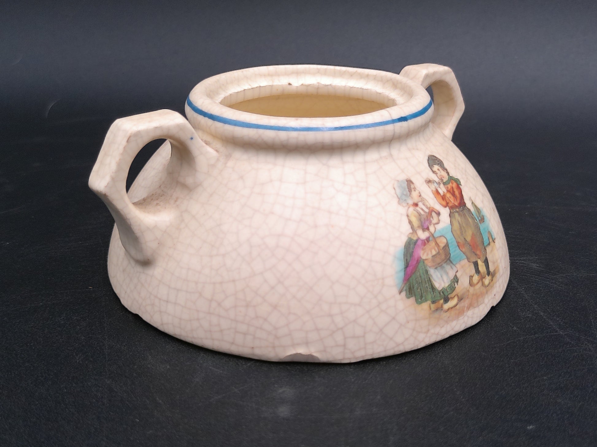 This Roseville 1910 Pottery Dutch Creamware Tea Teapot without a lid is a vintage collectible that adds charm and character to any kitchen or home decor. Crafted in 1910, it features a classic design and quality craftsmanship. Perfect for tea lovers and collectors alike!