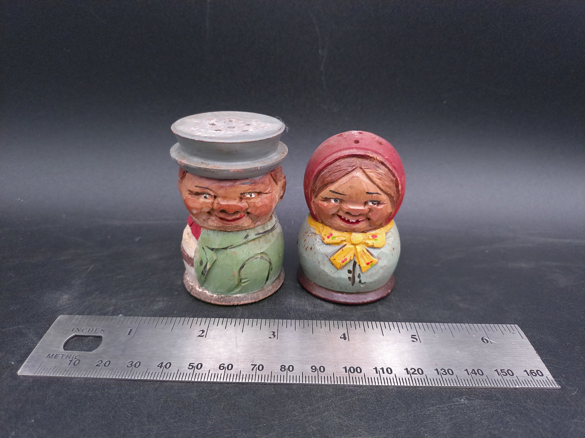 Hand Carved Wooden German Man and Woman Salt and Pepper Shakers Vintage