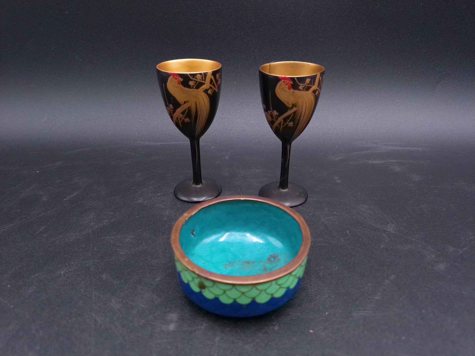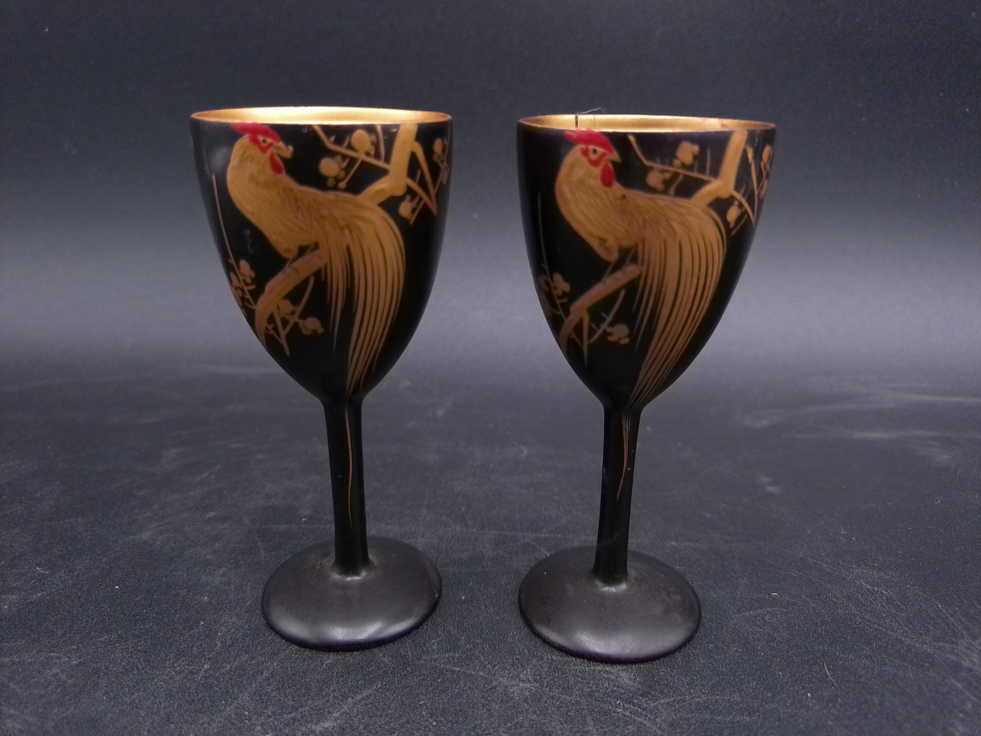 A Pair of rare Vintage 1920's Japanese Gold Leaf Onagadori Rooster Black Lacquer Ware Stemware . Cup for your consideration is this absolutely stunning nearly antique,1920's hand made, hand painted, hand lacquered, hand gilded Japanese black lacquer ware stemware wood sake cocktail glasses. Hand crafted in Japan, these gorgeous pieces of folk art measure 6" tall with a 2 3/4" diameter and a 2 1/4" base. The design pattern features the Golden (24 Kt gilded)