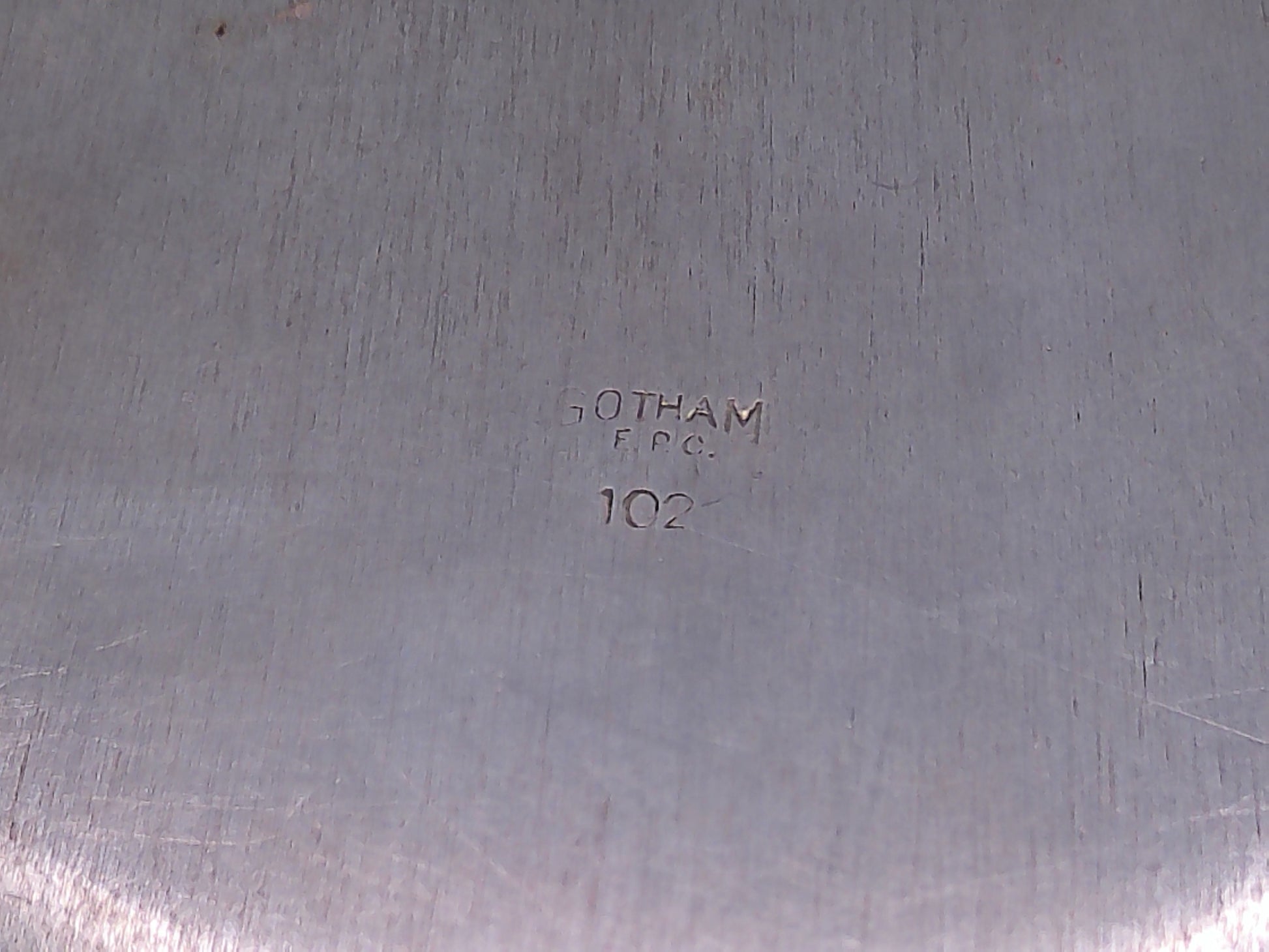 This vintage serving tray is made from silver plated metal and features a marked design of "Gotham F.P.C. 102". Its round shape makes it perfect for serving dishes in a stylish and elegant manner. Add a touch of nostalgia and sophistication to your dining experience with this one-of-a-kind piece.