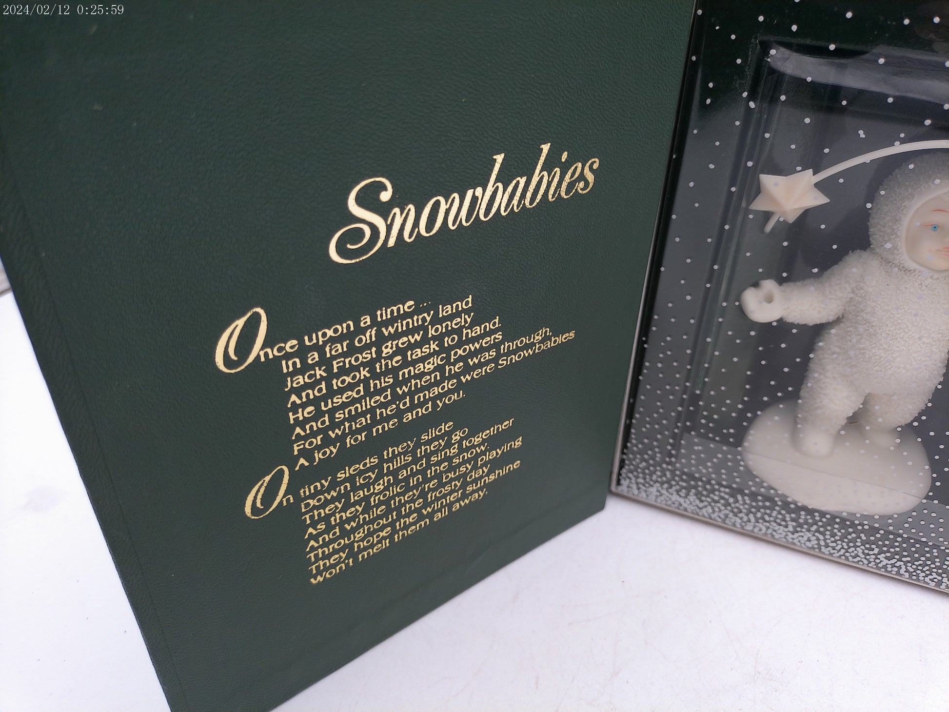 This Snowbabies figurine with item number 6867-5 is titled "Juggling Stars In The Sky". It features a Snowbaby character juggling stars in front of a starry night sky backdrop. A charming and whimsical addition to any figurine collection.