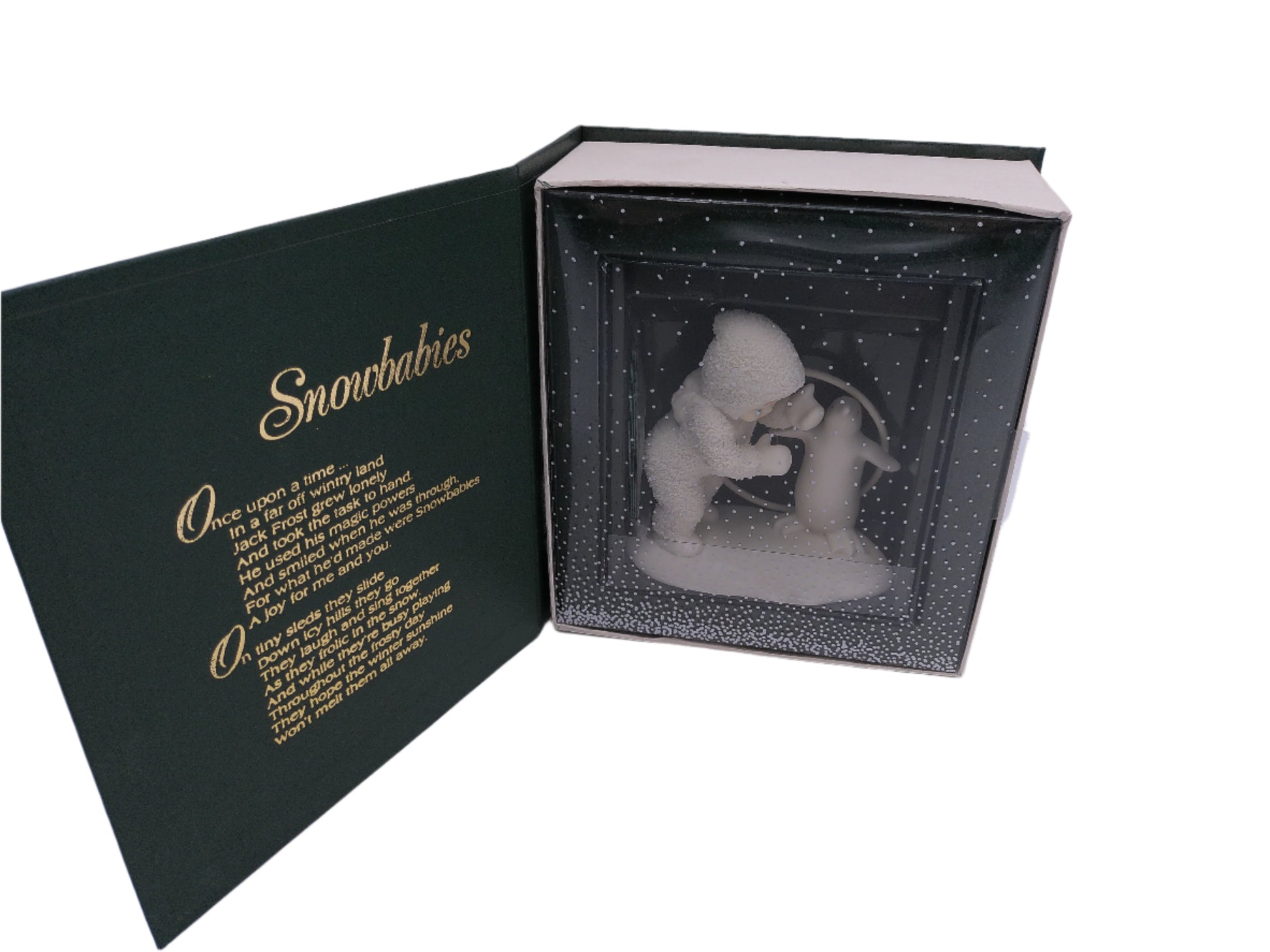 This Snowbabies figurine portrays a cute and playful scene, adding a whimsical touch to any collection. Handcrafted with delicate porcelain and hand-painted details, this intricately designed piece showcases the expert craftsmanship and attention to detail of the Snowbabies Classics line. Bring a smile to any room with this adorable figurine.