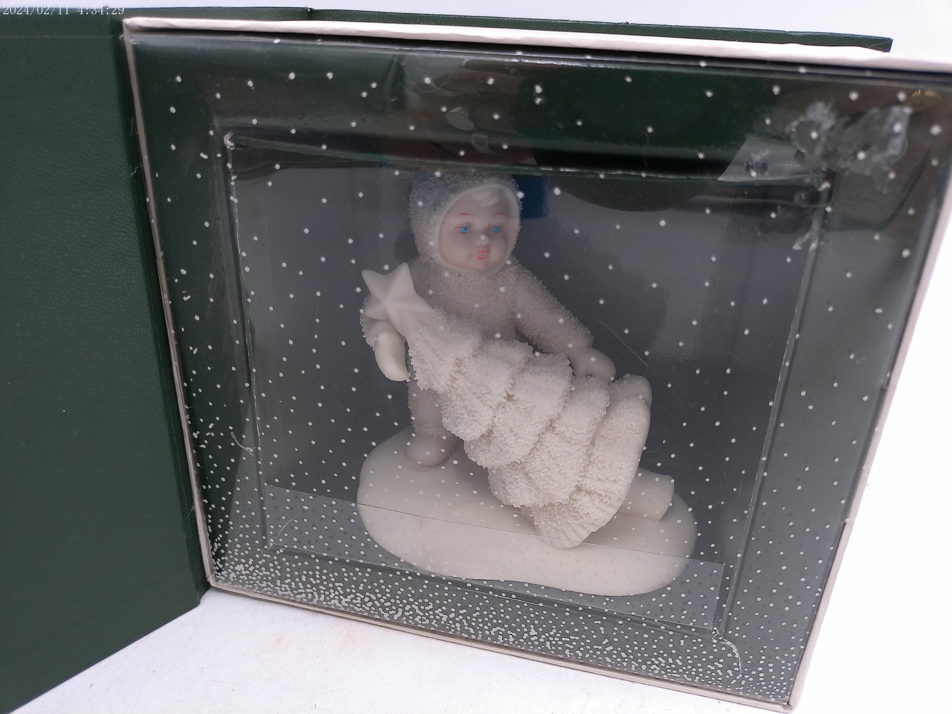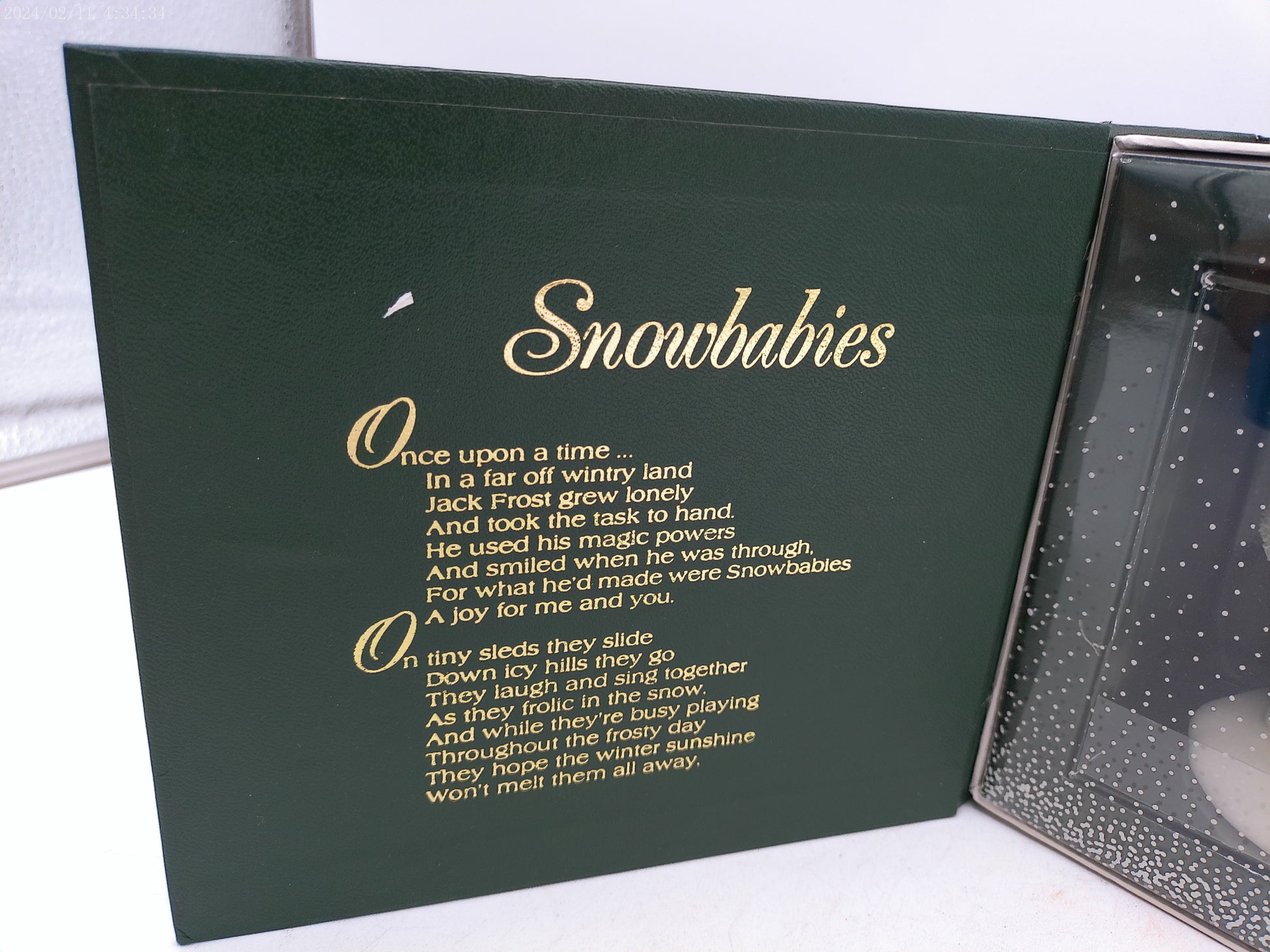 This Snowbabies figurine captures the festive spirit of winter with its charming depiction of a snowman putting up a tree. The handcrafted details and delicate design make it a perfect addition to any holiday decor. Bring a touch of whimsy to your home and celebrate the season with this delightful figurine.