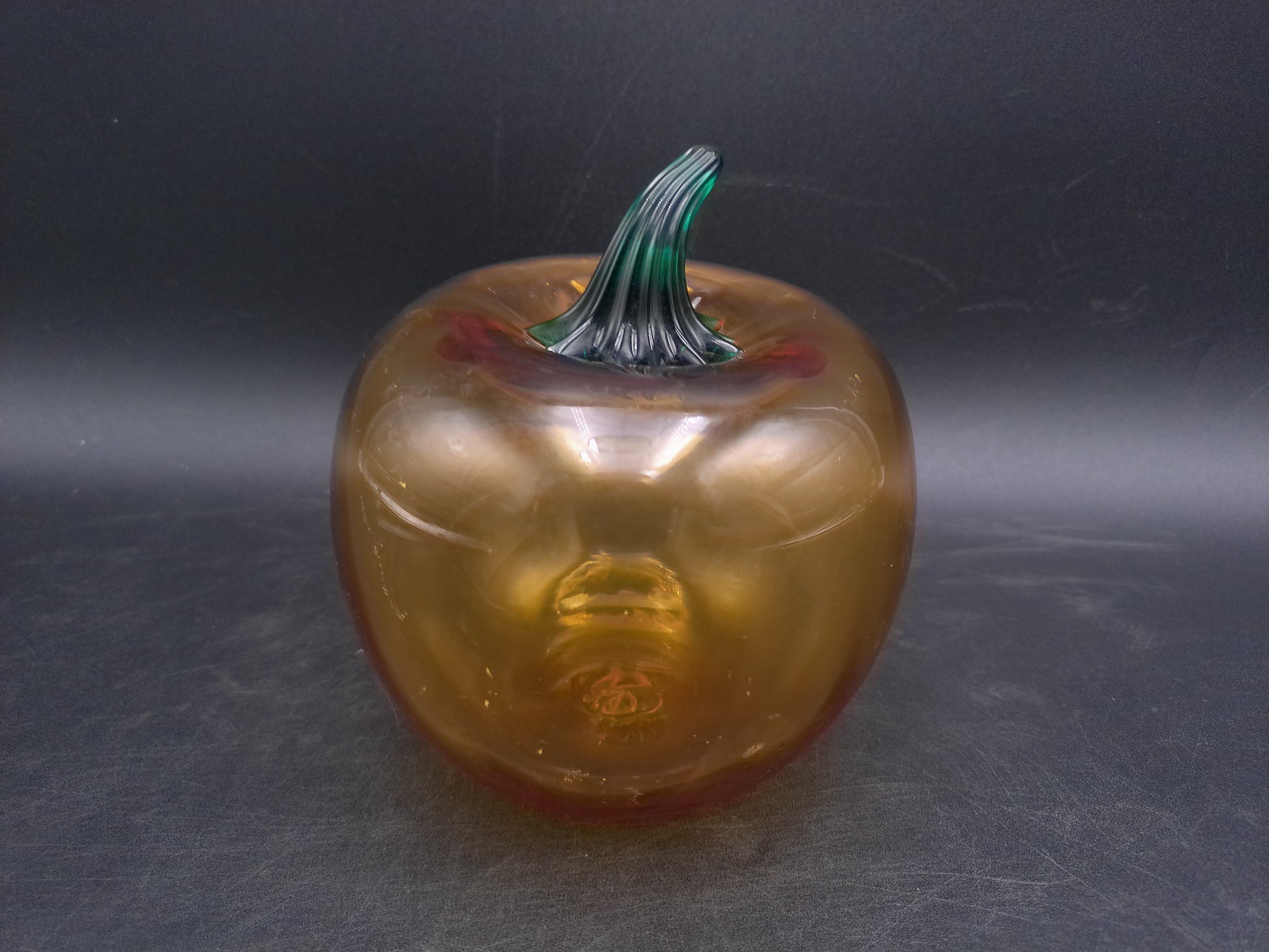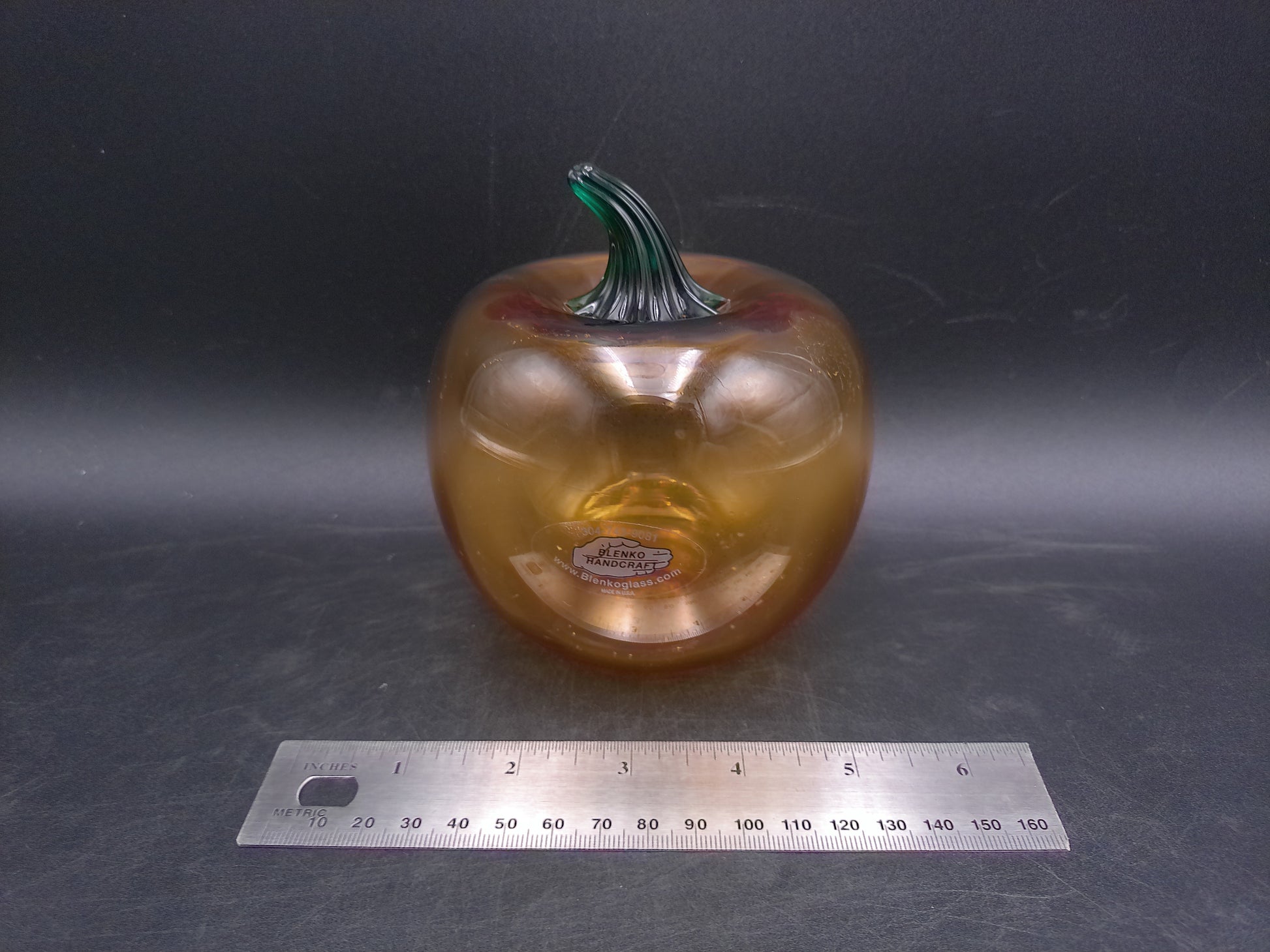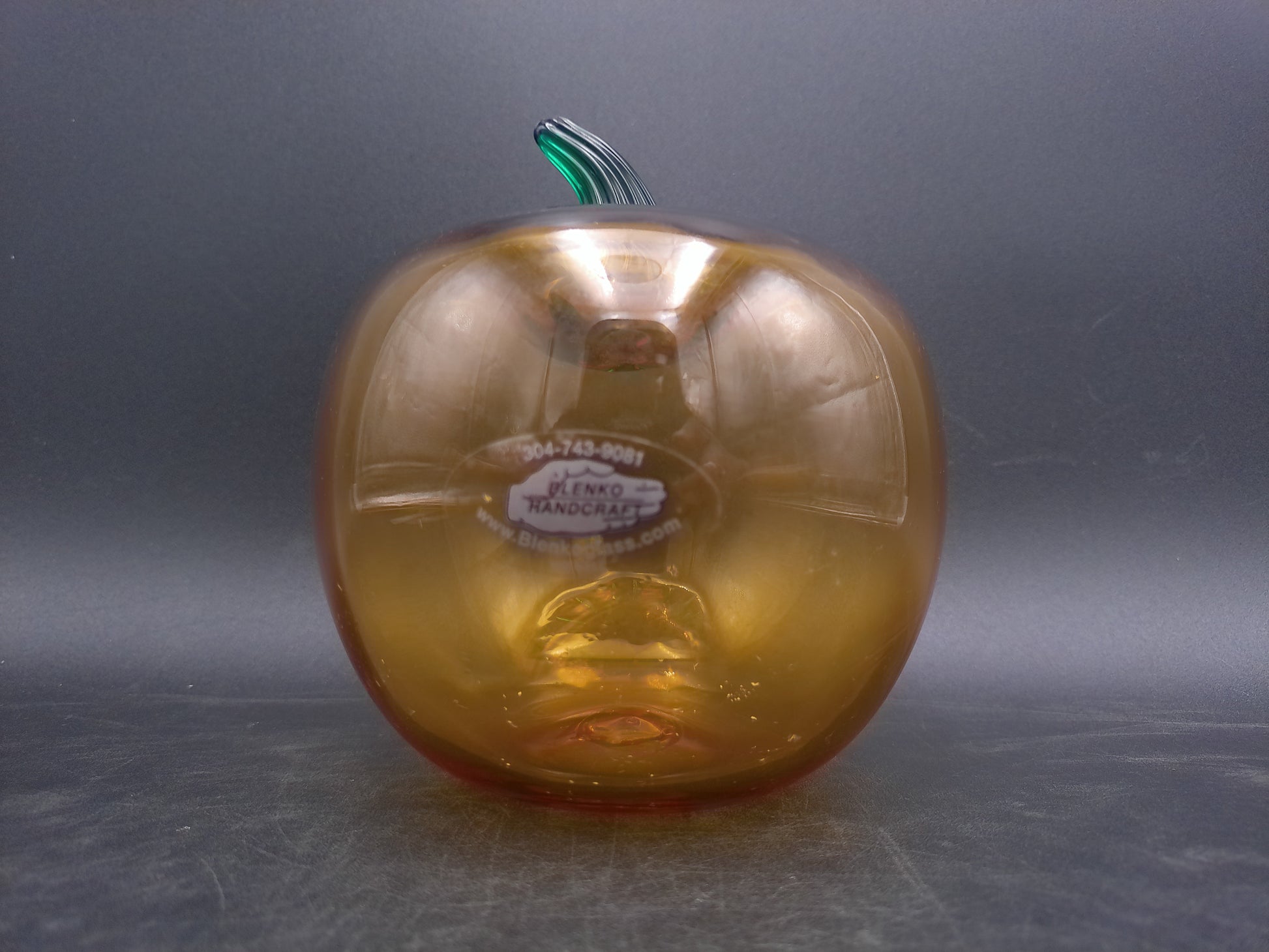 Add a vibrant touch to your décor with the Blenko Handcraft 9355 S Optic Art Glass Pumpkin. Standing 5 inches tall, this topaz-colored pumpkin features a striking green stem, showcasing exquisite craftsmanship and rich, translucent hues. Perfect as a seasonal accent or a year-round decorative piece, it brings warmth and artistic flair to any space. Elevate your collection with this unique, handcrafted glass art.