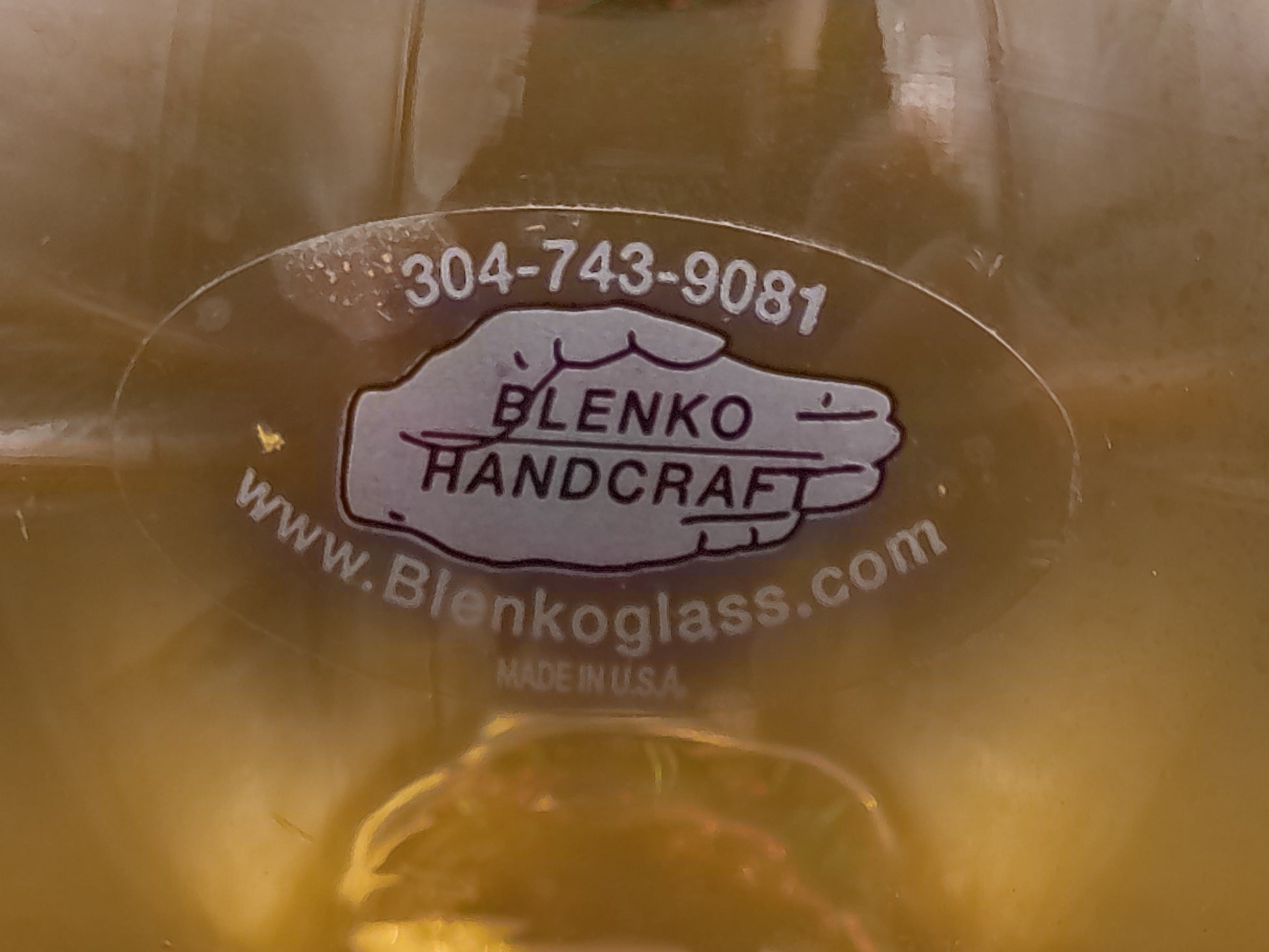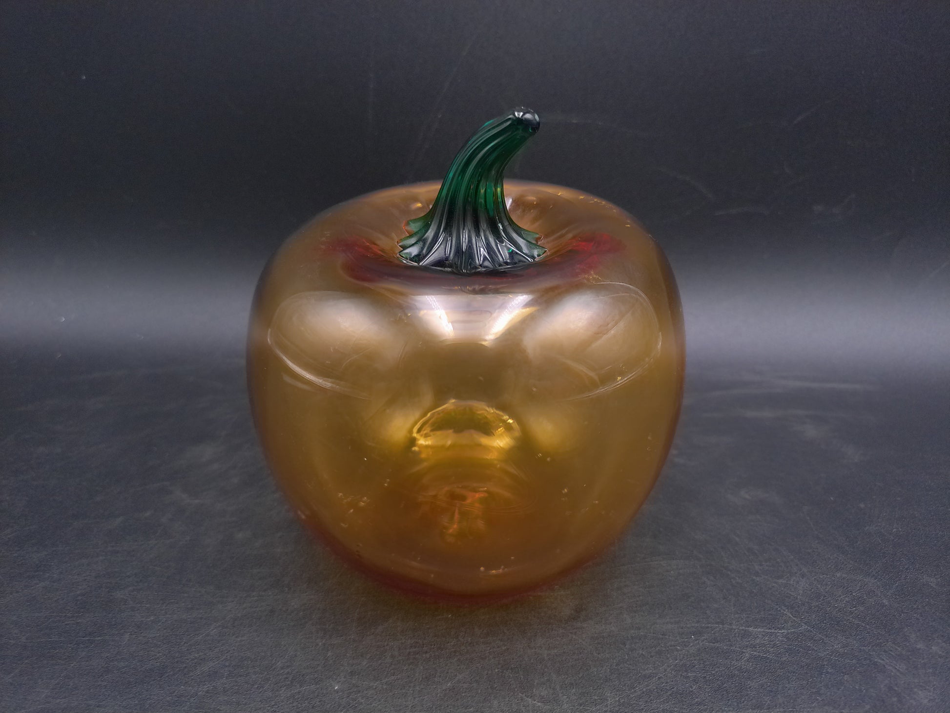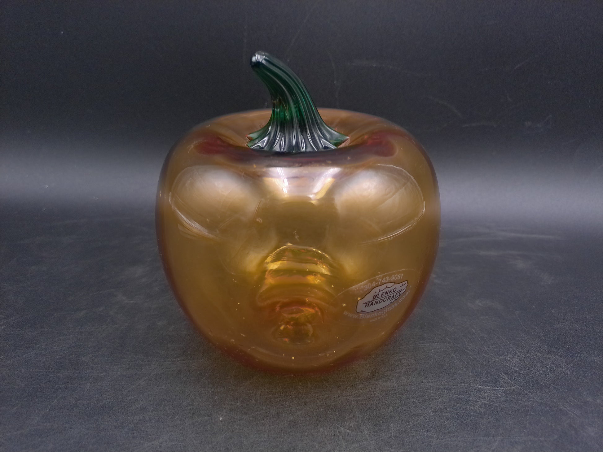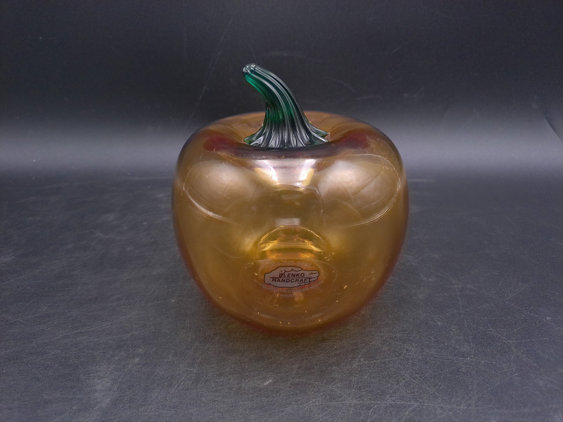 Add a vibrant touch to your décor with the Blenko Handcraft 9355 S Optic Art Glass Pumpkin. Standing 5 inches tall, this topaz-colored pumpkin features a striking green stem, showcasing exquisite craftsmanship and rich, translucent hues. Perfect as a seasonal accent or a year-round decorative piece, it brings warmth and artistic flair to any space. Elevate your collection with this unique, handcrafted glass art.