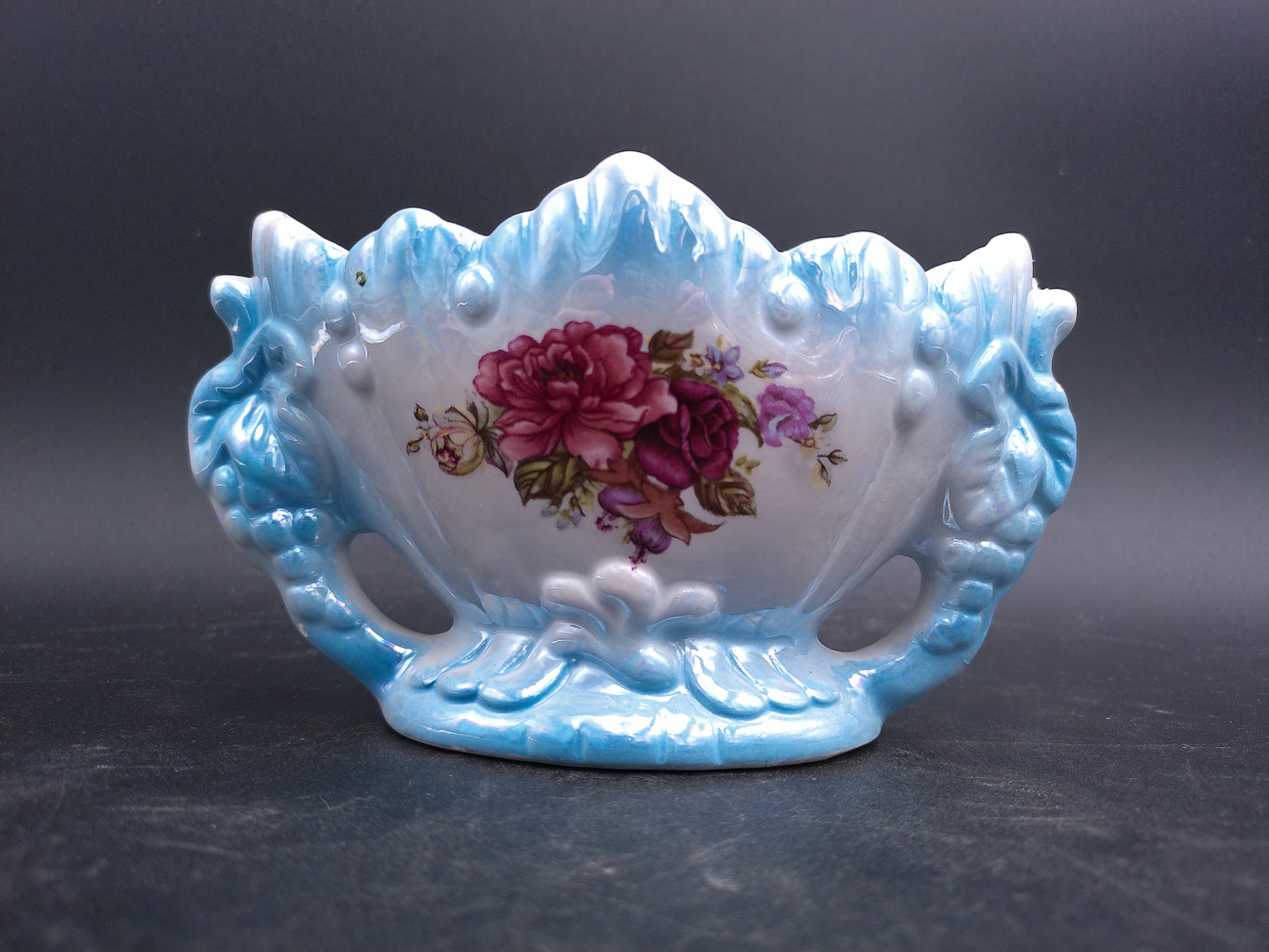 This vintage-inspired vase features a delightful floral design and a striking baby blue color. With dual handles, it's both functional and decorative, adding a touch of elegance to any room. Perfect for showcasing your favorite flowers or as a stand-alone piece, this vase is a must-have for any home.