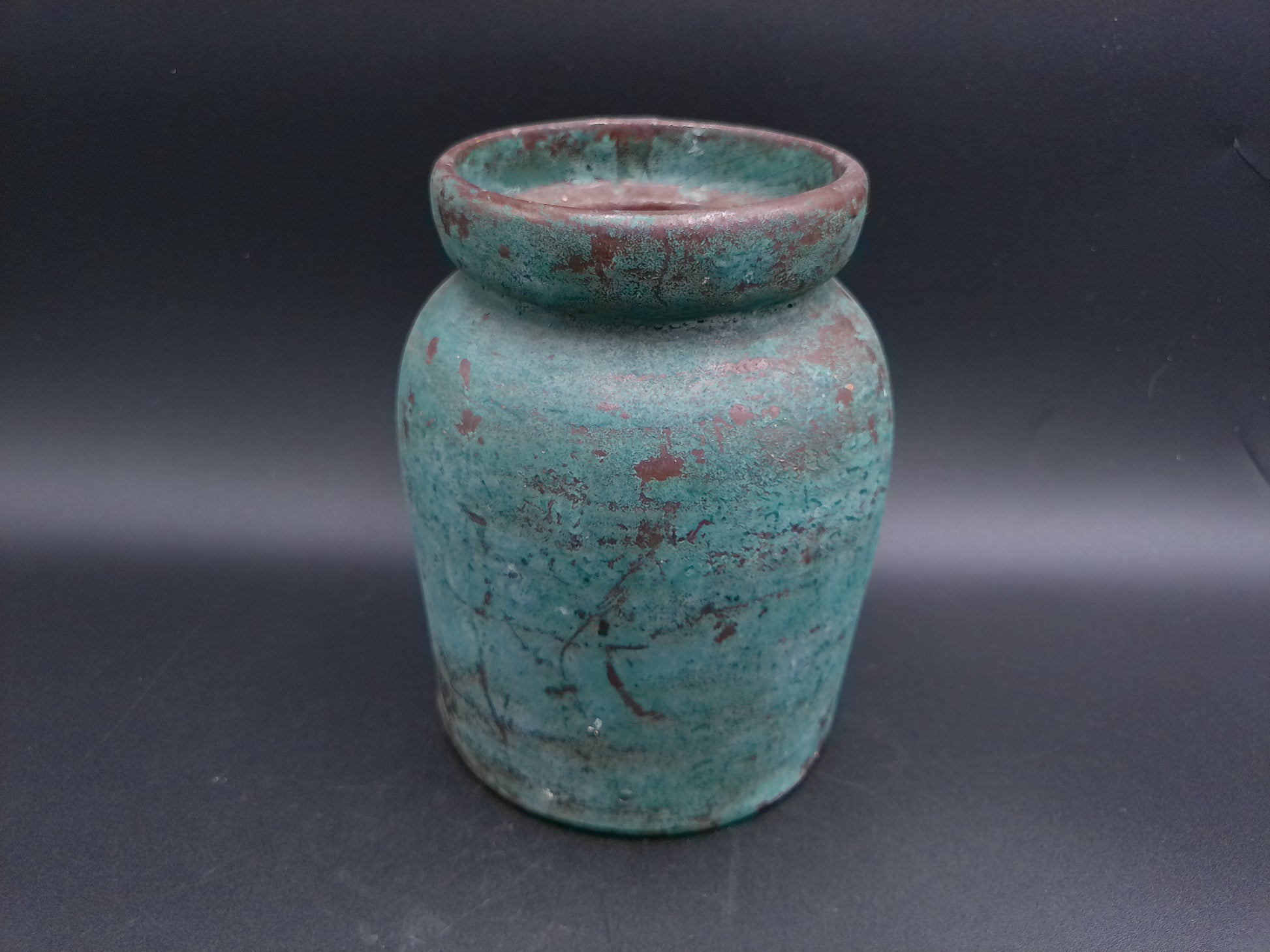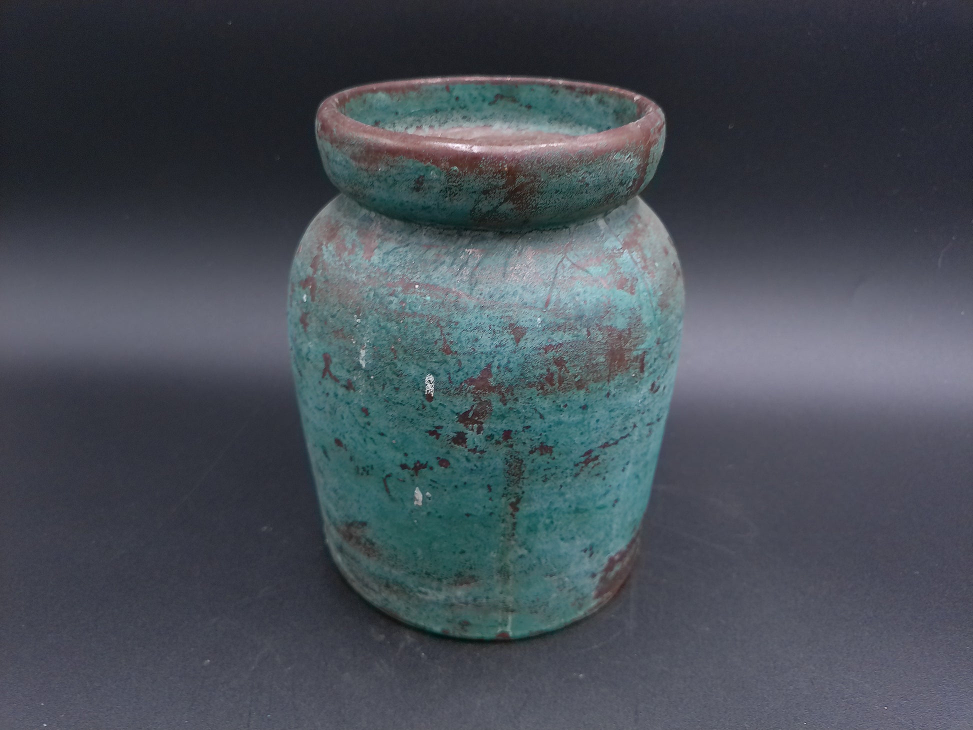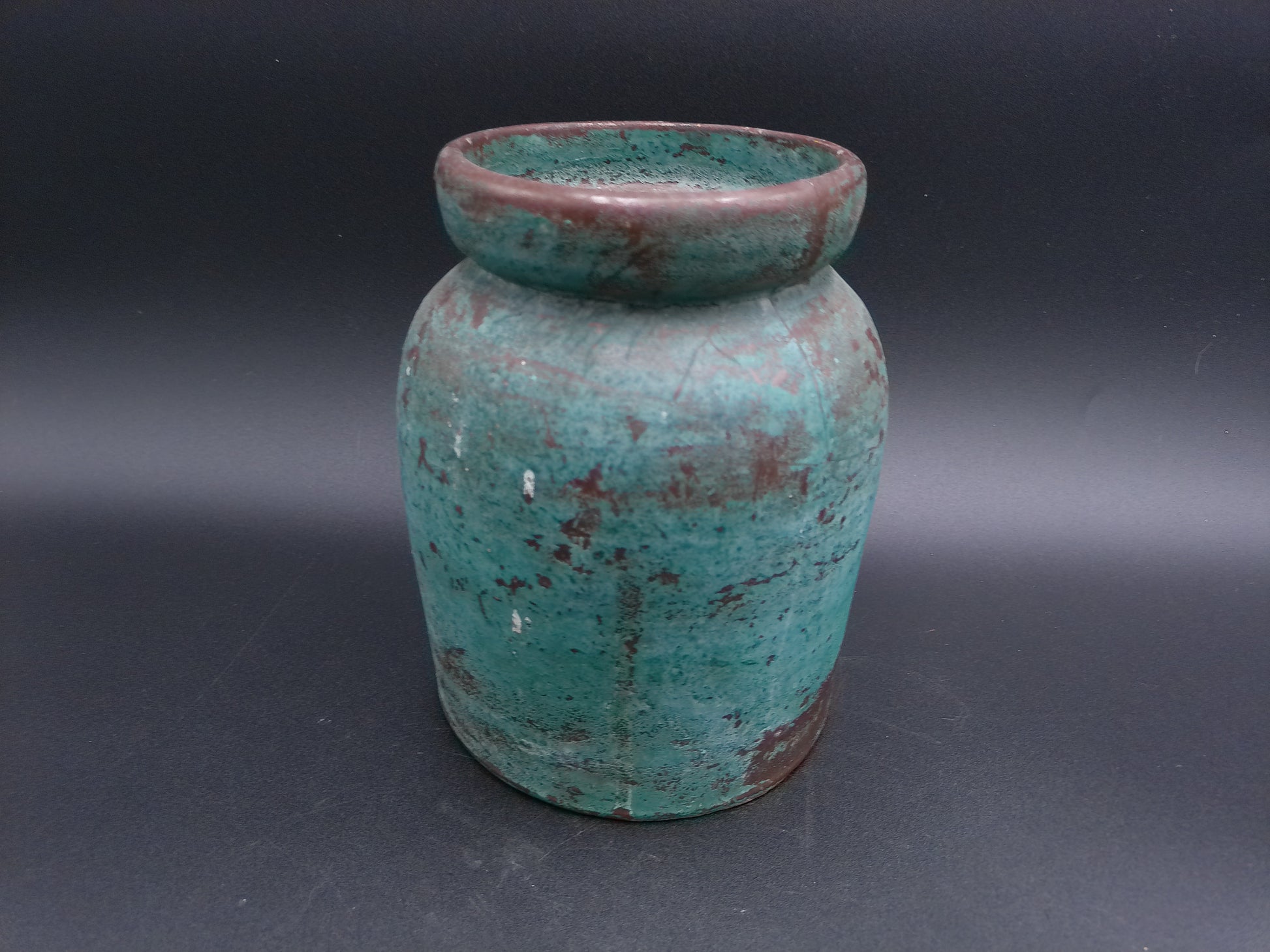 Vase Early 20th century Chinese ceramic vase. This antique farmhouse style ceramic jar has a beautifully aged emerald green glazed finish