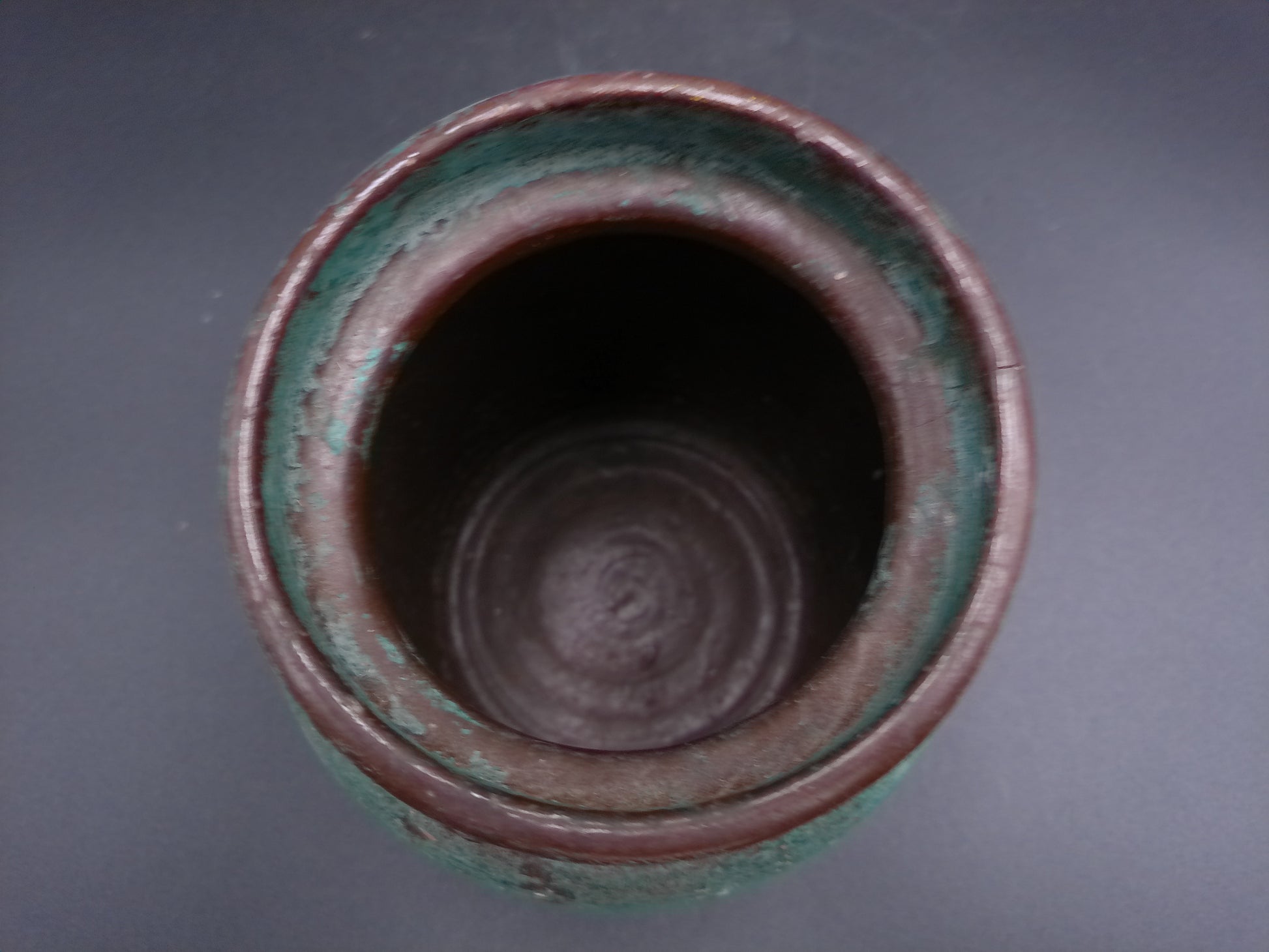 Transport yourself to early 20th century China with this vintage Chinese ceramic vase. The farmhouse style and aged emerald green glazed finish add a touch of rustic elegance to any space. Perfect for displaying flowers or as a standalone decor piece.