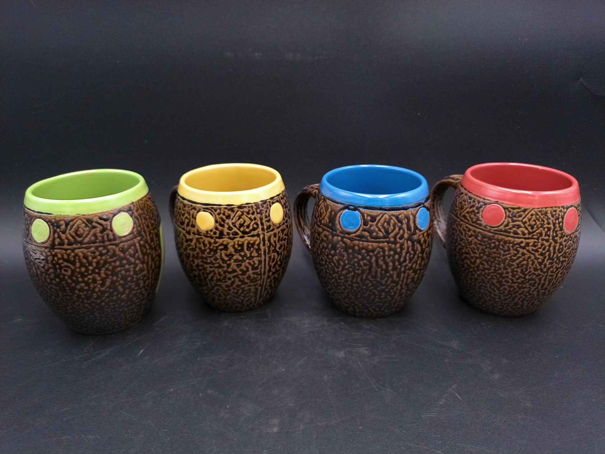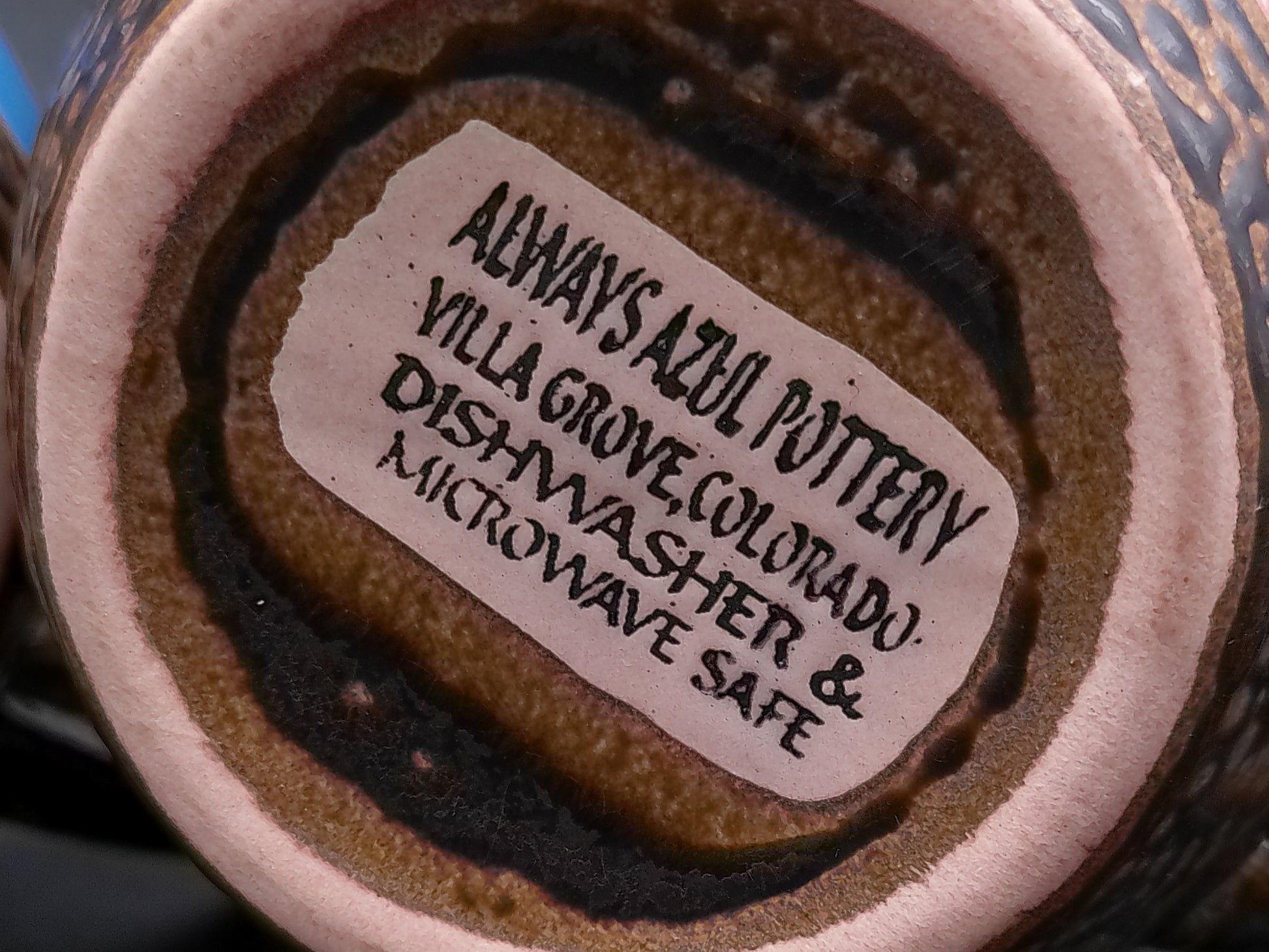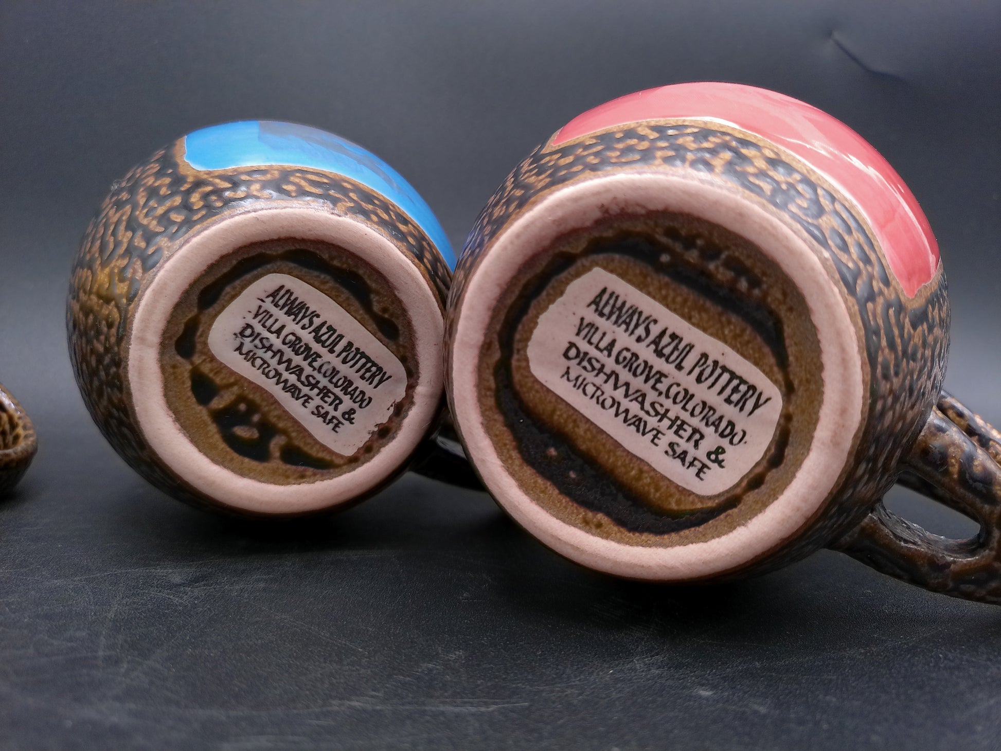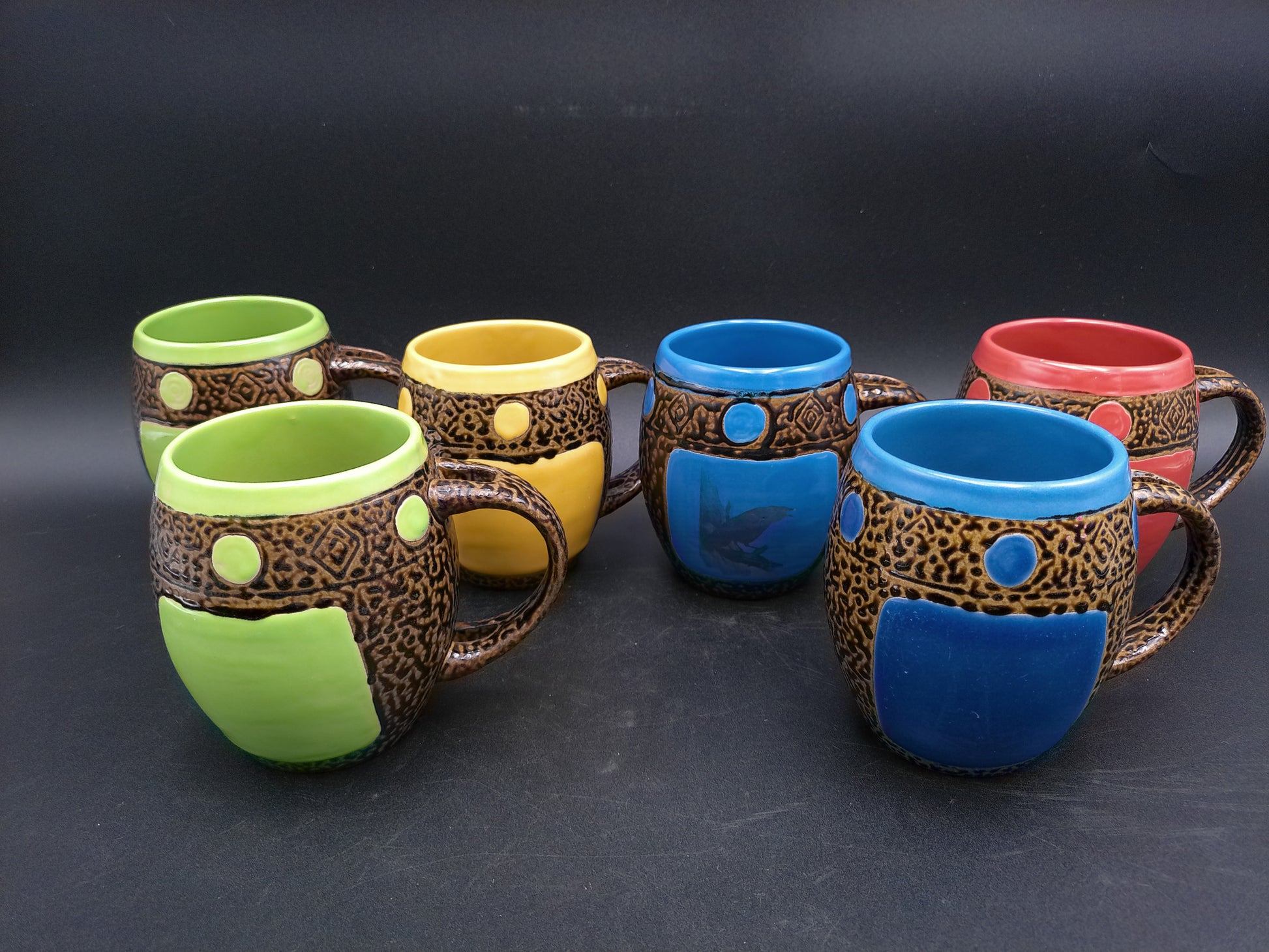 Indulge in the natural beauty and unique craftsmanship of this Pottery Coffee Mugs Lot of 6 set from Always Azul. Featuring intricate dragonfly, flower, and pinecone designs, each mug is handcrafted with love and care. Perfect for adding a touch of charm to your daily coffee routine, these mugs are a must-have for any pottery lover!