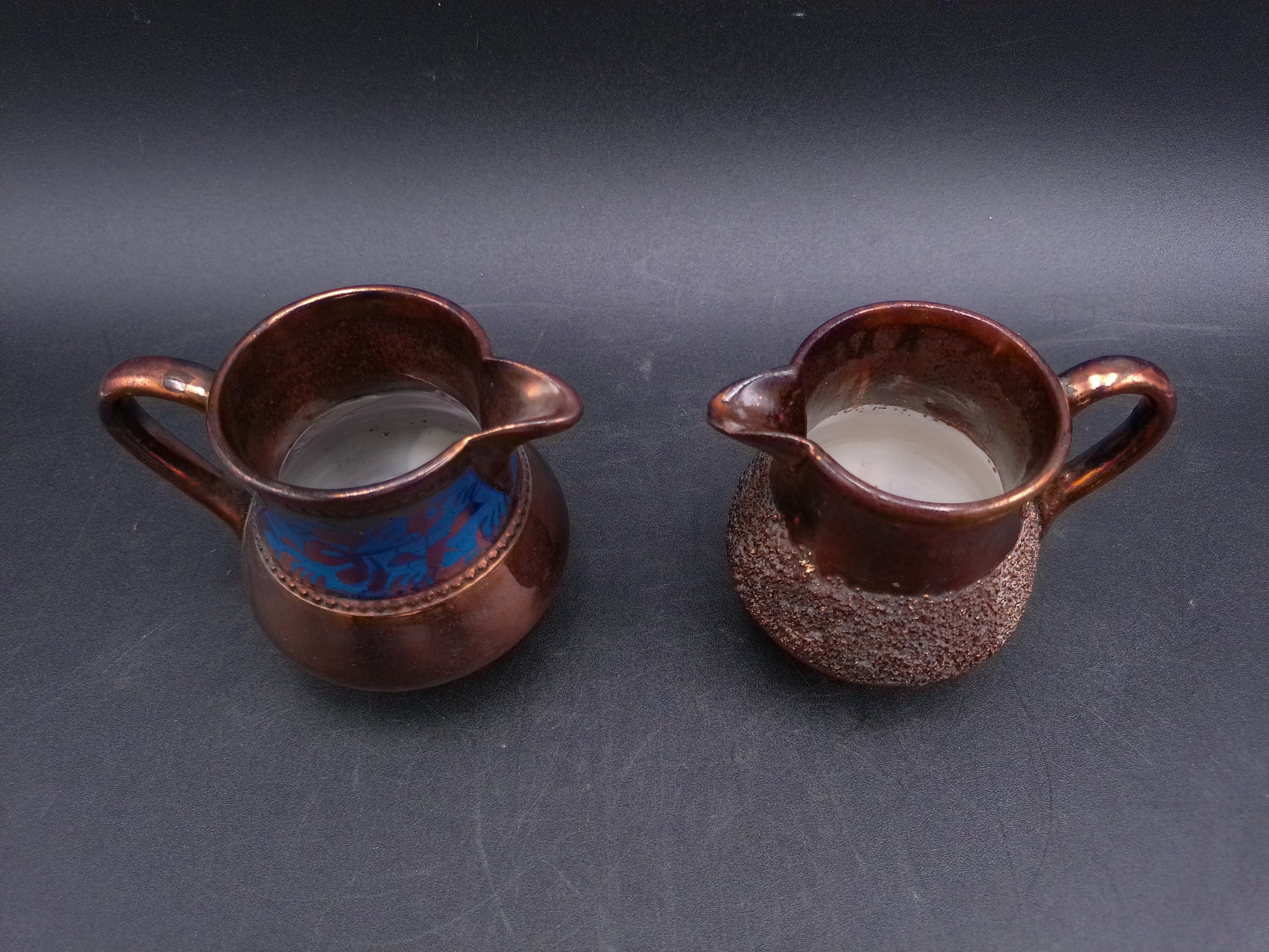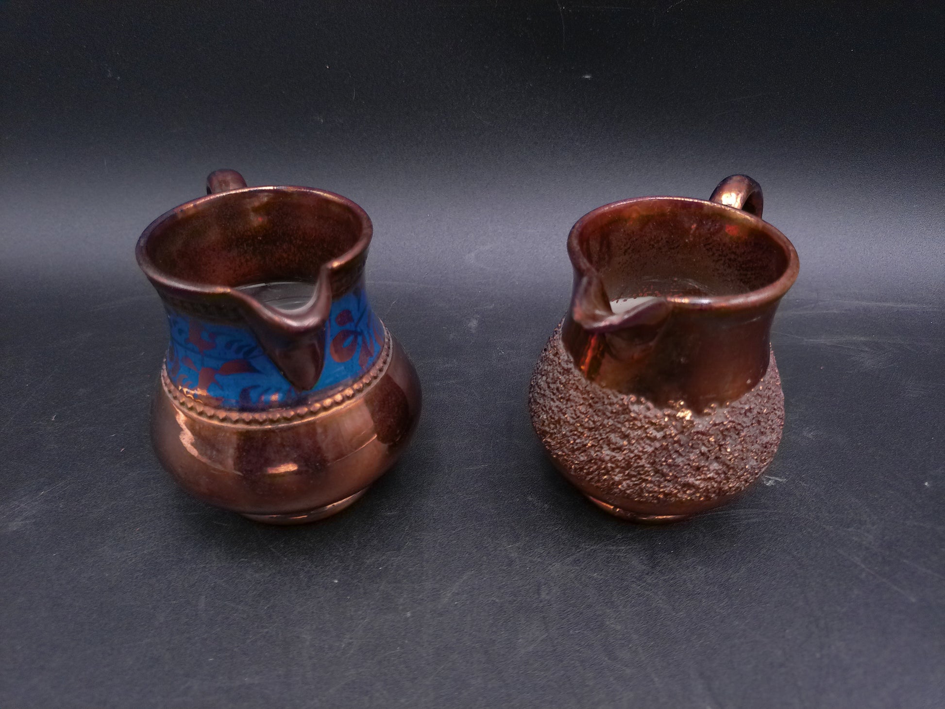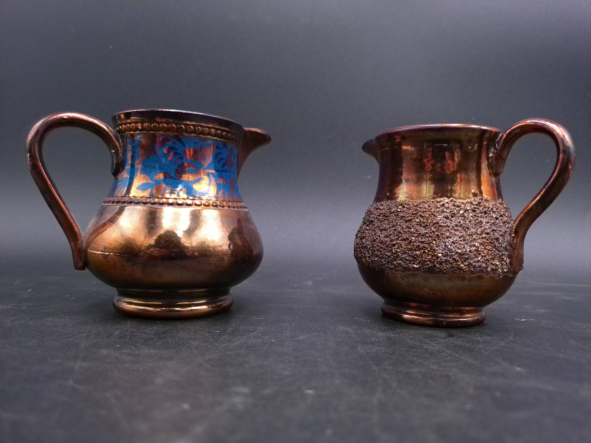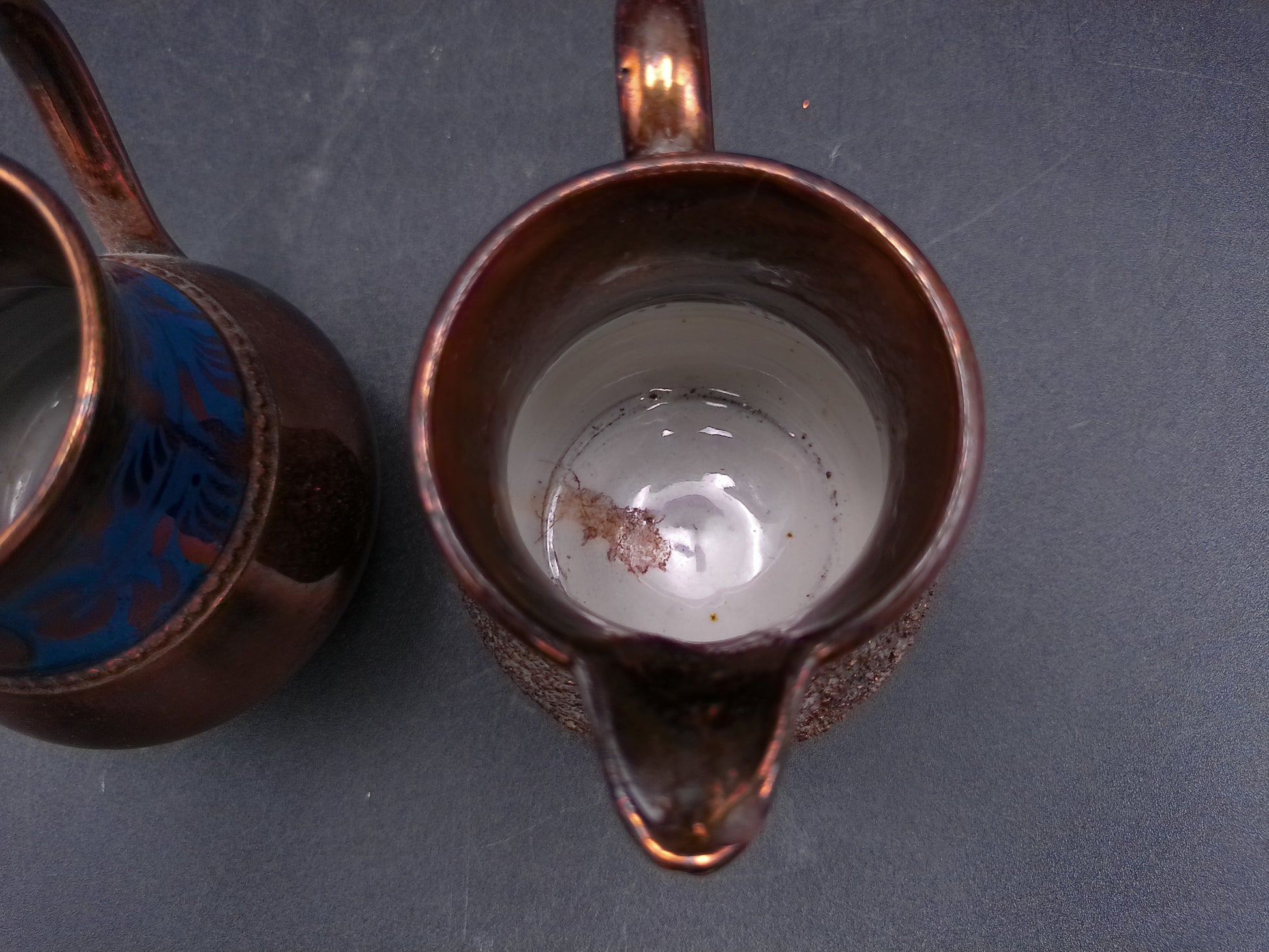 Small Copper Luster Creamer 3" Tall and Copper Lustre Cream Pitcher with Blue Decor on it