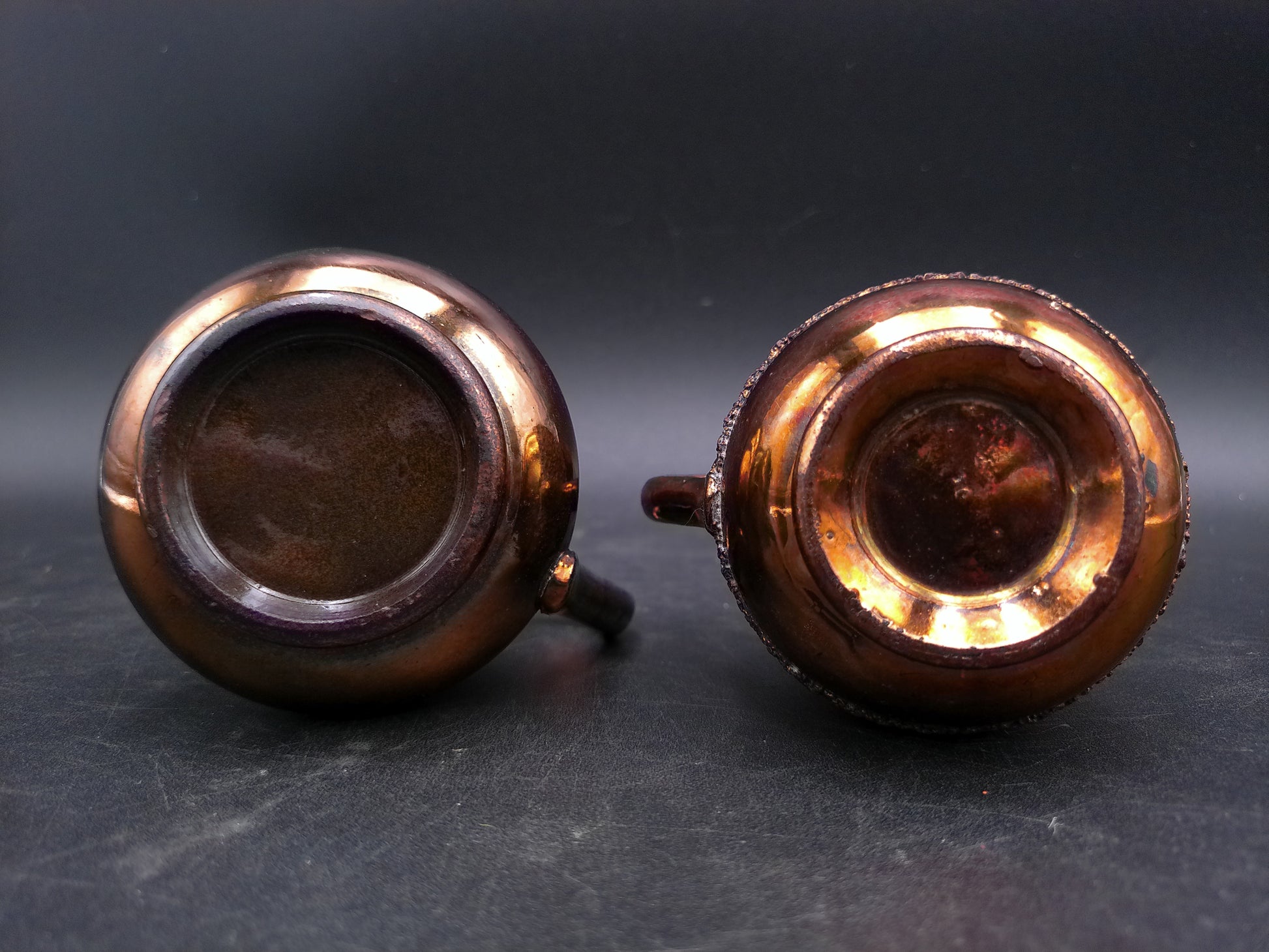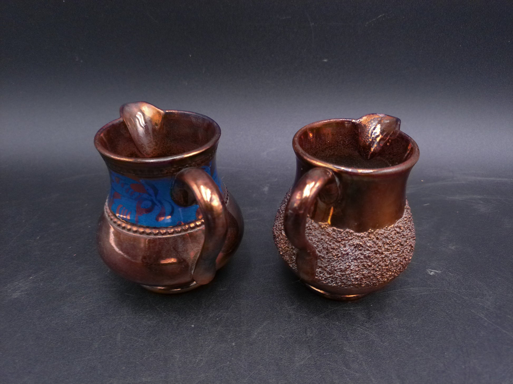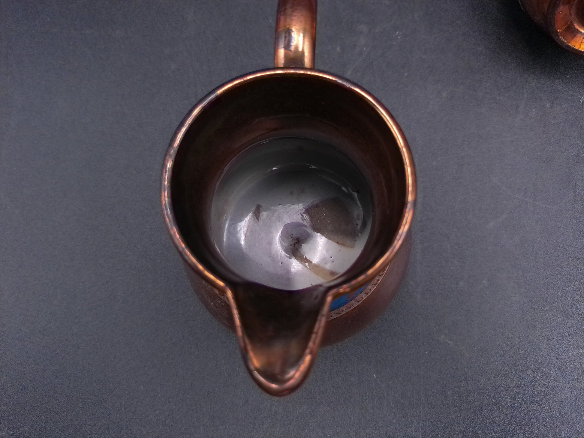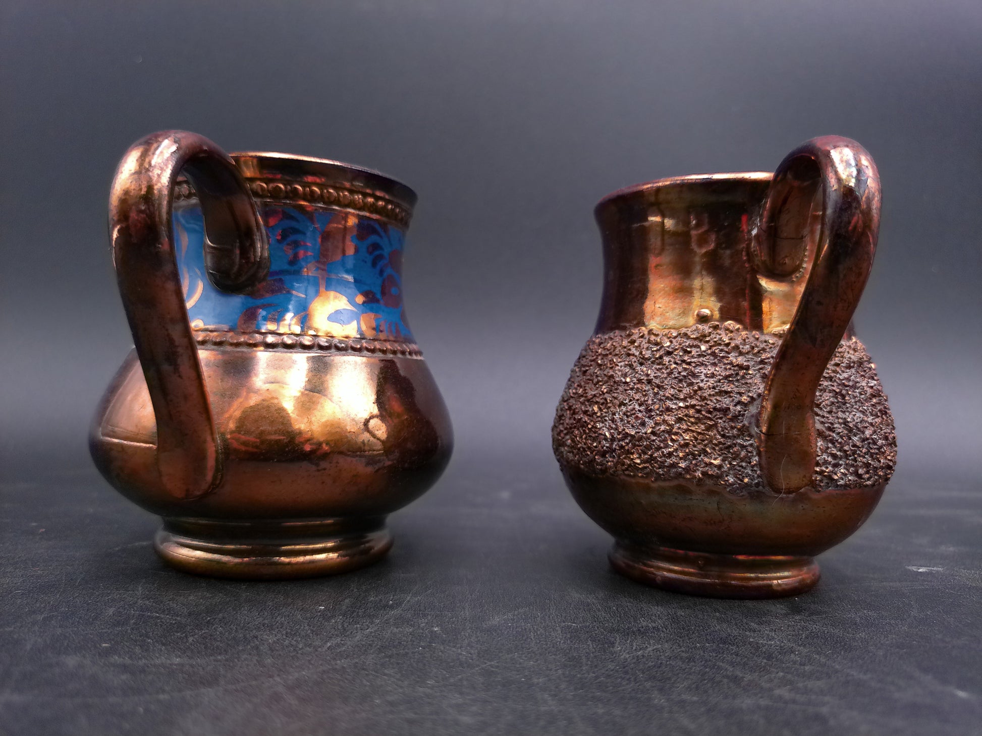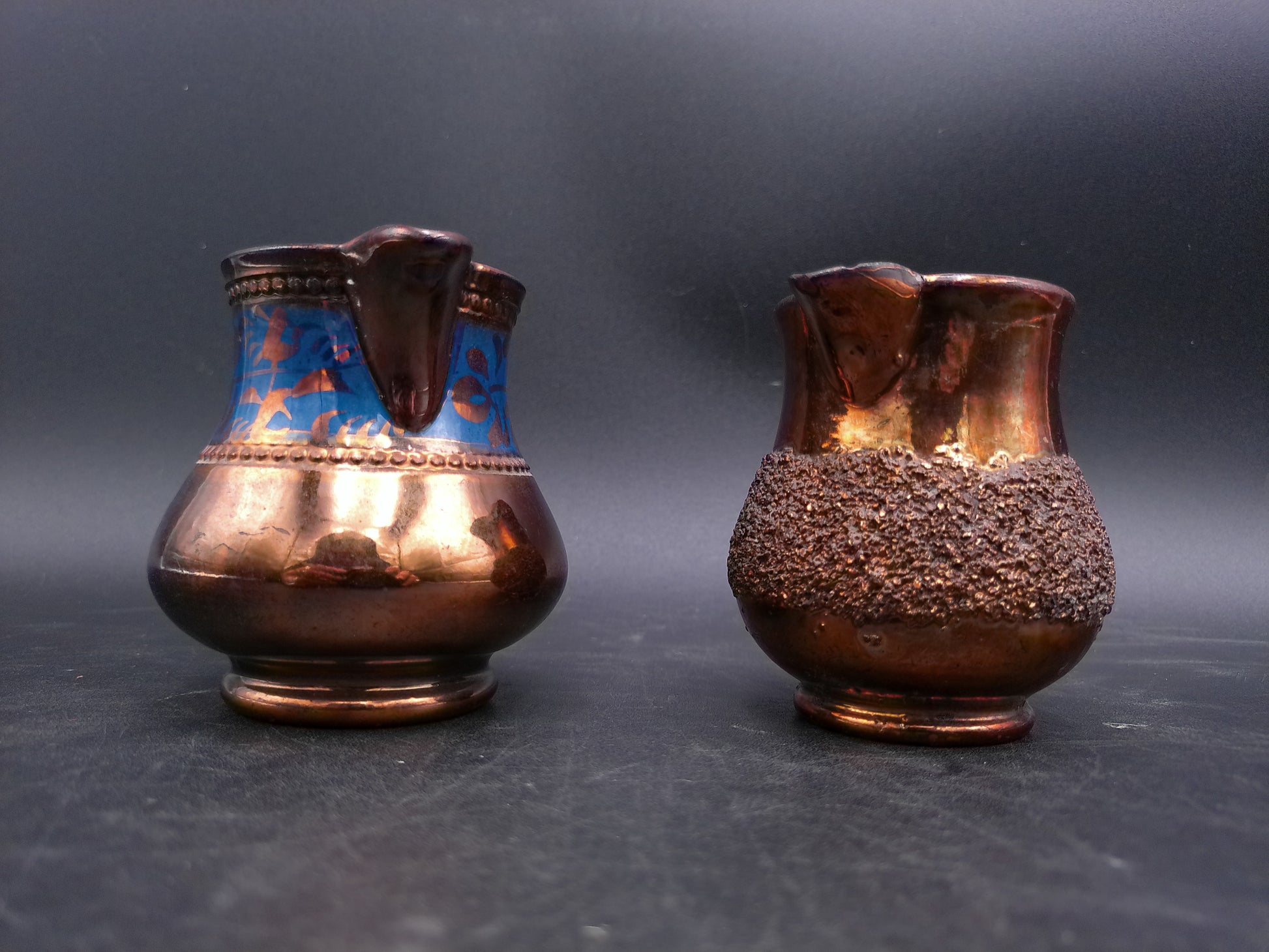 Small Copper Luster Creamer 3" Tall and Copper Lustre Cream Pitcher with Blue Decor on it