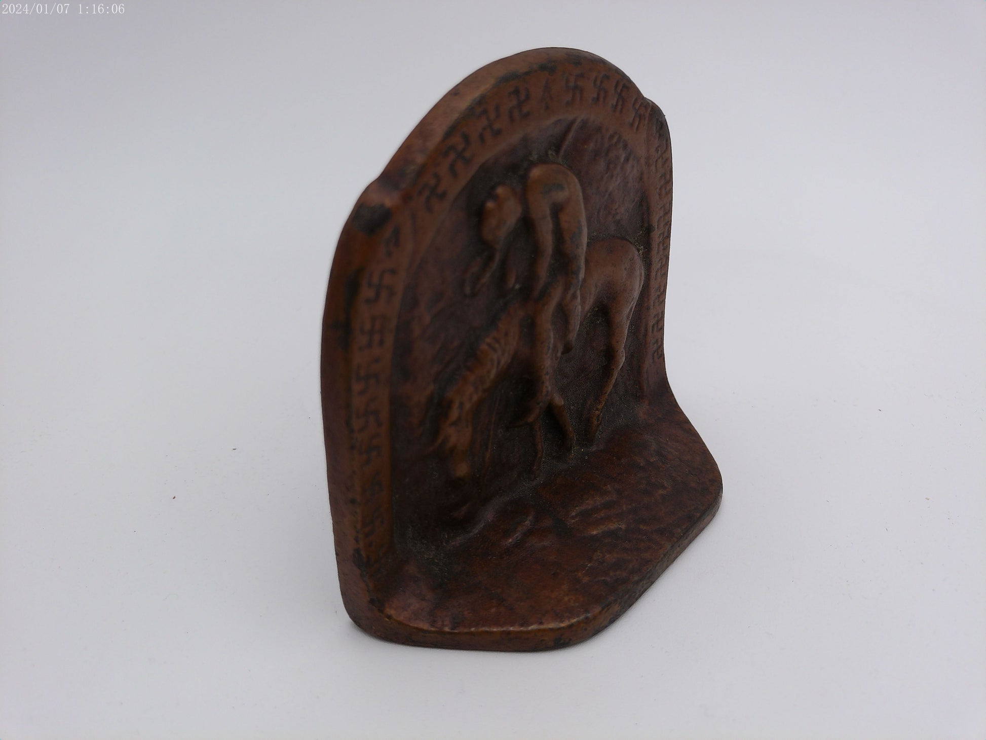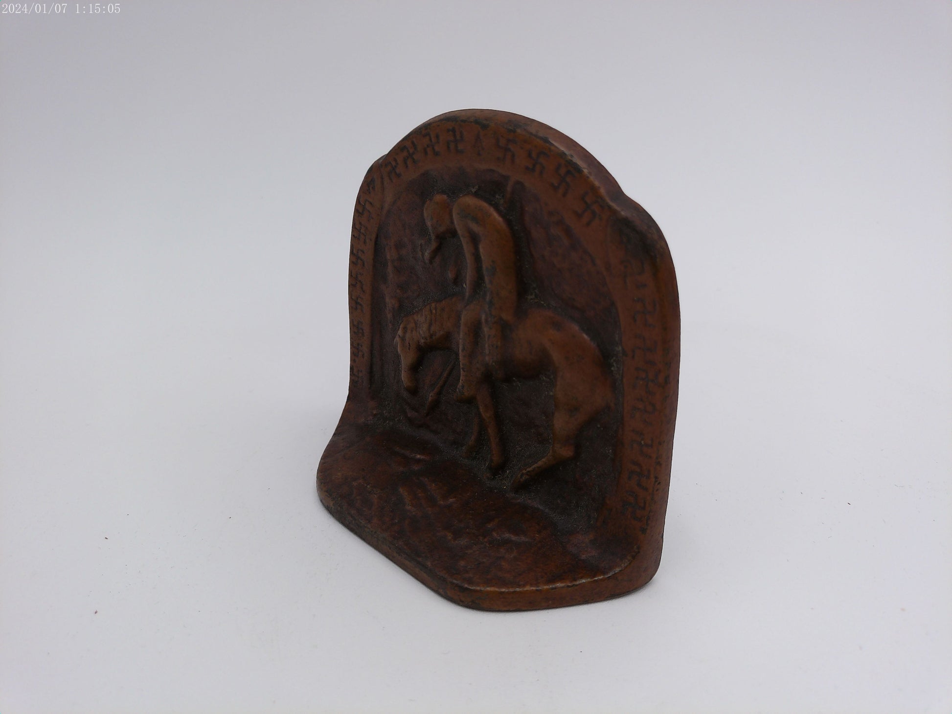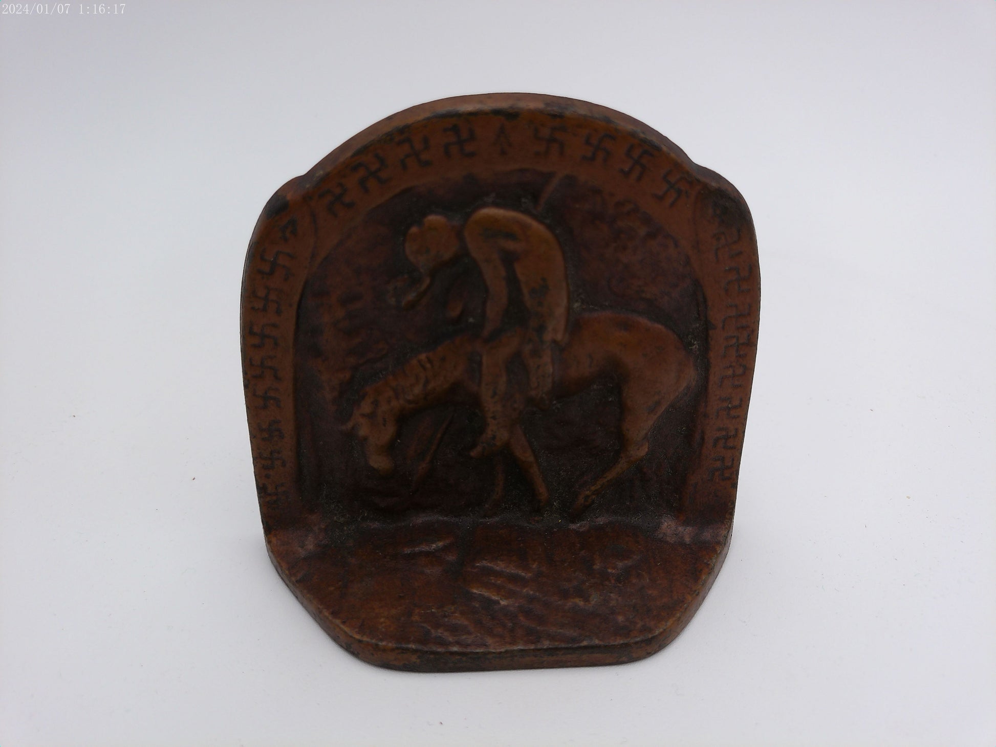Add a touch of history and charm to your space with our Vintage 1930 Cast Iron bookend featuring an Indian riding on a horse. Crafted with intricate details and sturdy iron, it not only holds books in place but also adds a nostalgic feel to your decor.