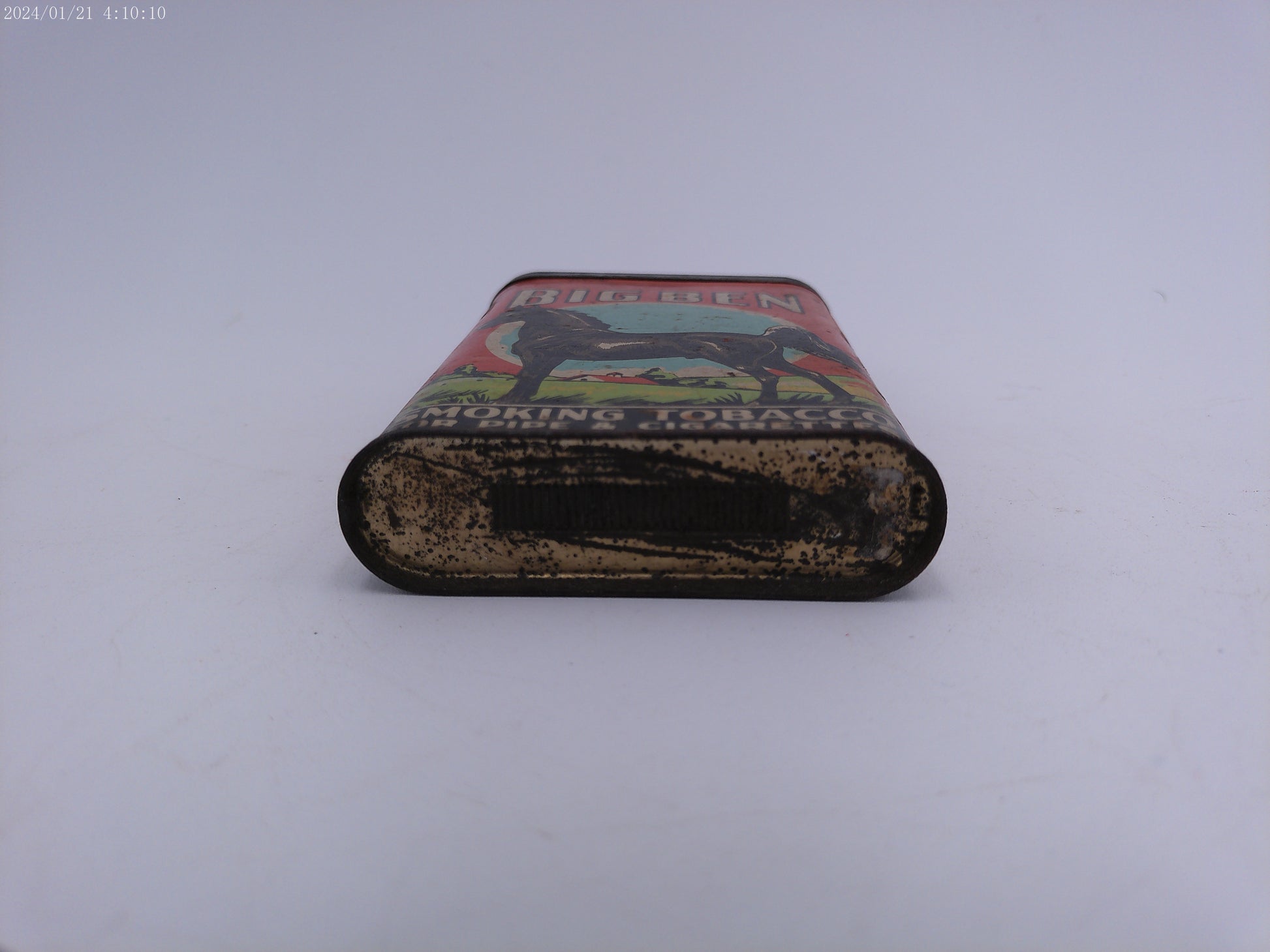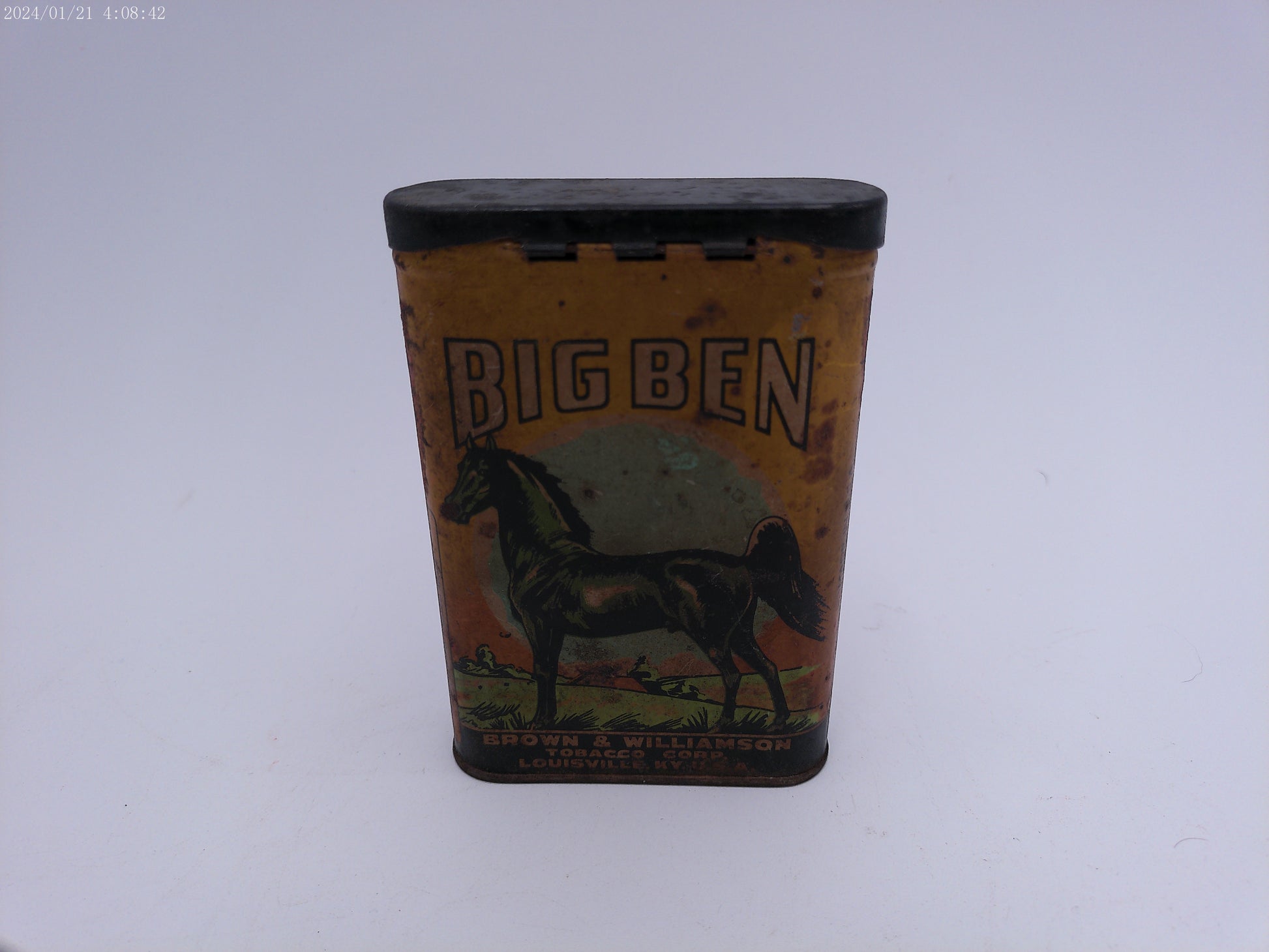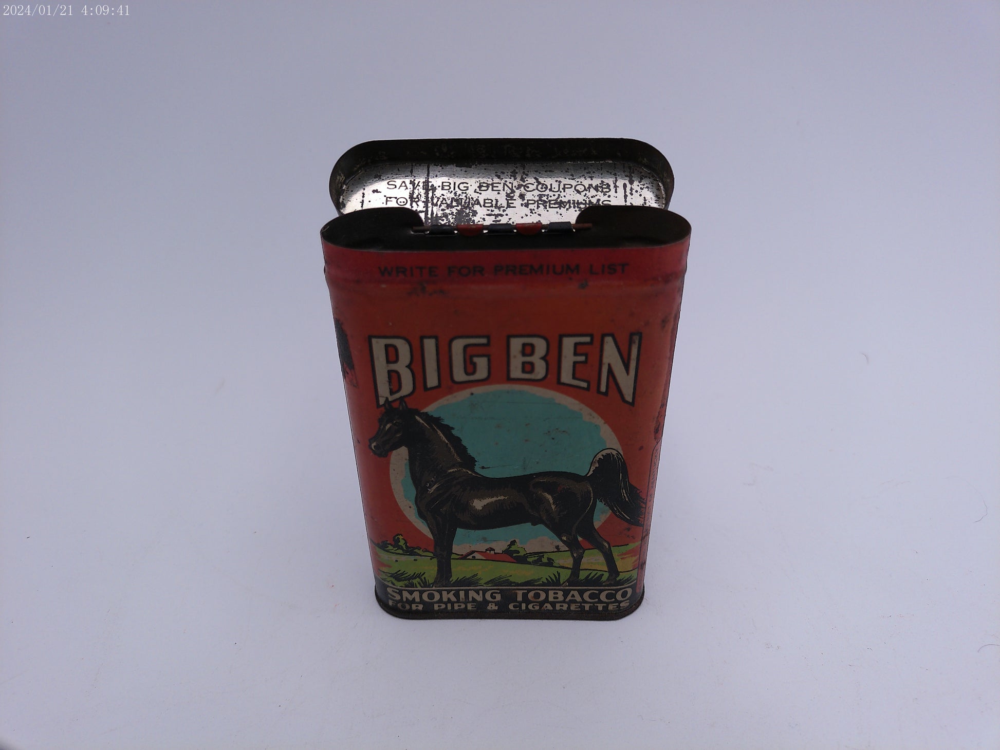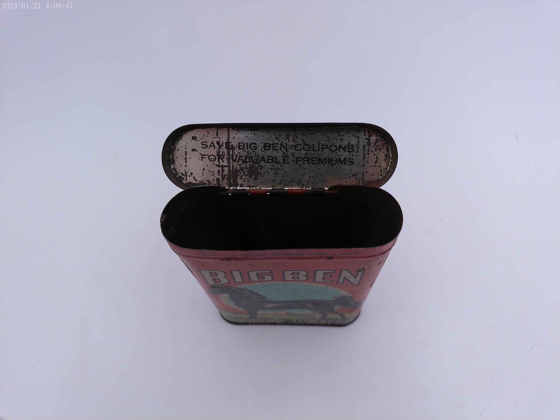 Get a piece of vintage advertising history with this empty Big Ben vertical pocket tobacco tin. Perfect for collectors or anyone looking for a piece of nostalgia, this tin is a must-have.