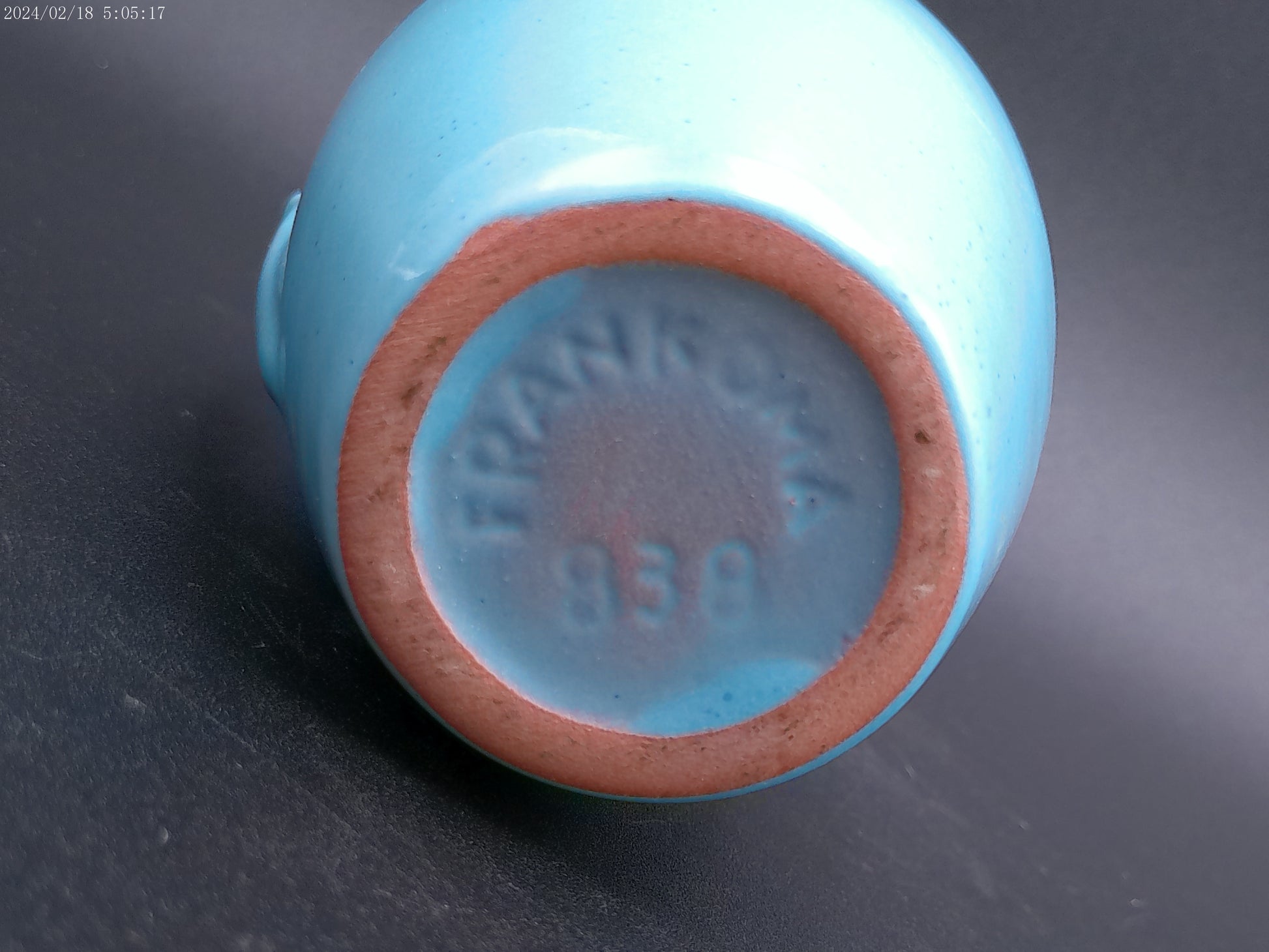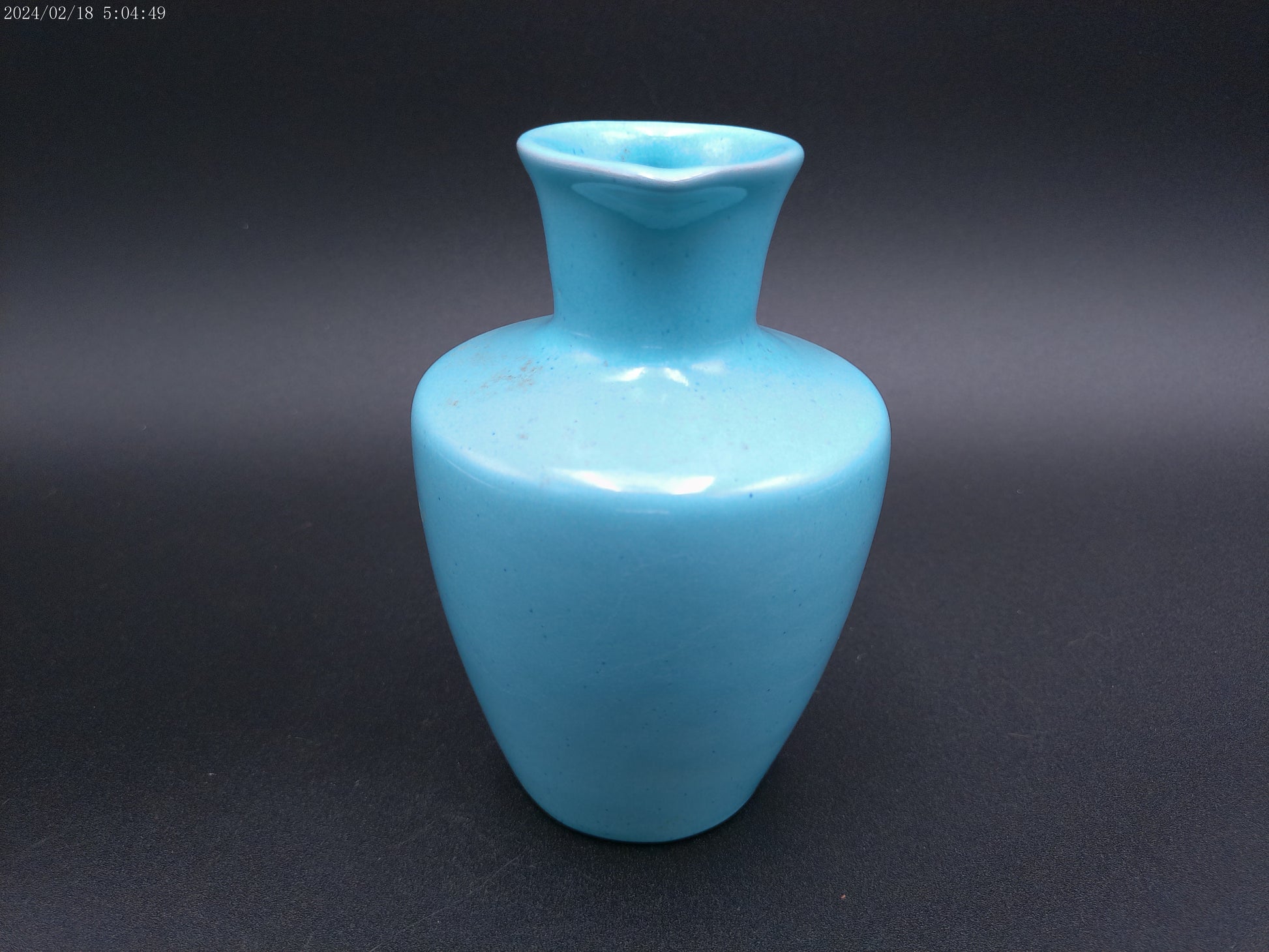 This Vintage Frankoma # 838 Art Pottery Jug Pitcher Cruet Robin Blue is a unique and charming addition to any home decor collection. Made in the USA, this vintage piece boasts quality craftsmanship and a beautiful robin blue color. Perfect for serving and displaying, it's a must-have for pottery enthusiasts.