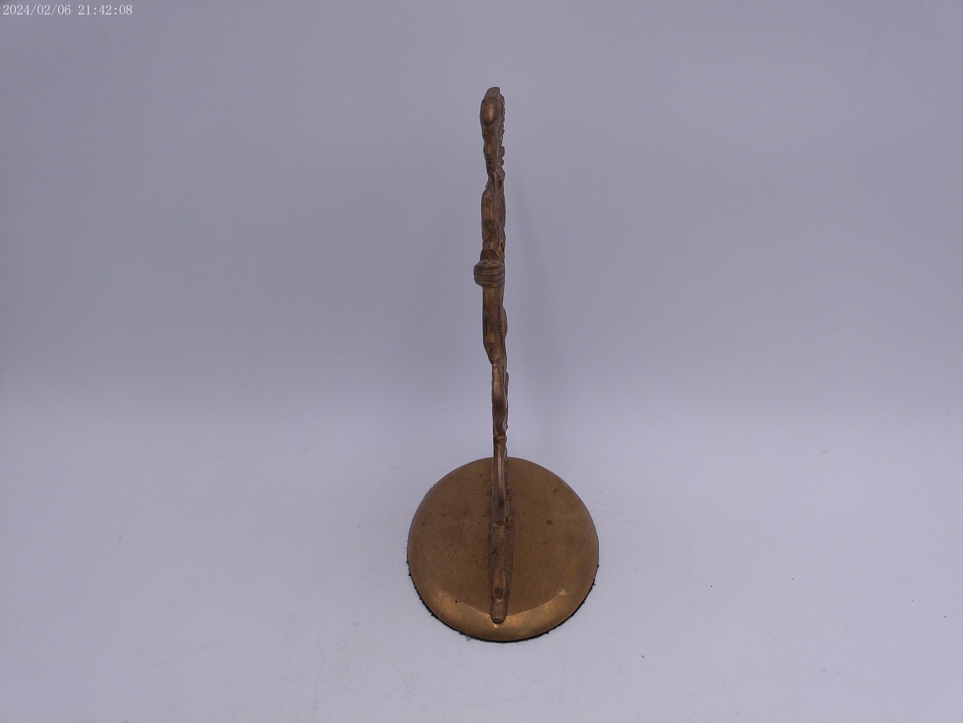 Expertly crafted from solid brass, this vintage Jainson candle holder features a beautiful angel design that stands at 9" tall and has a 6" wide base. Add a touch of elegance to any room with this timeless piece.