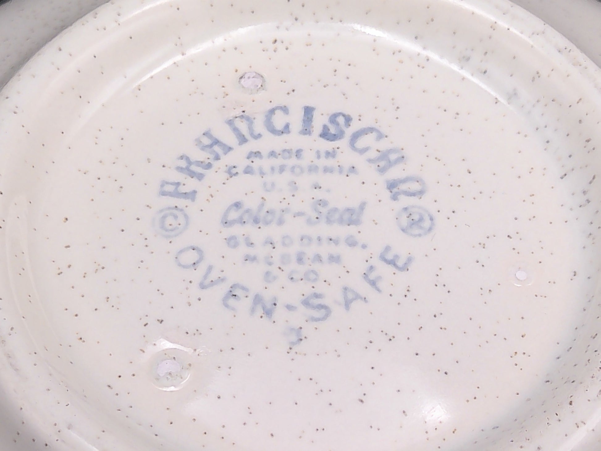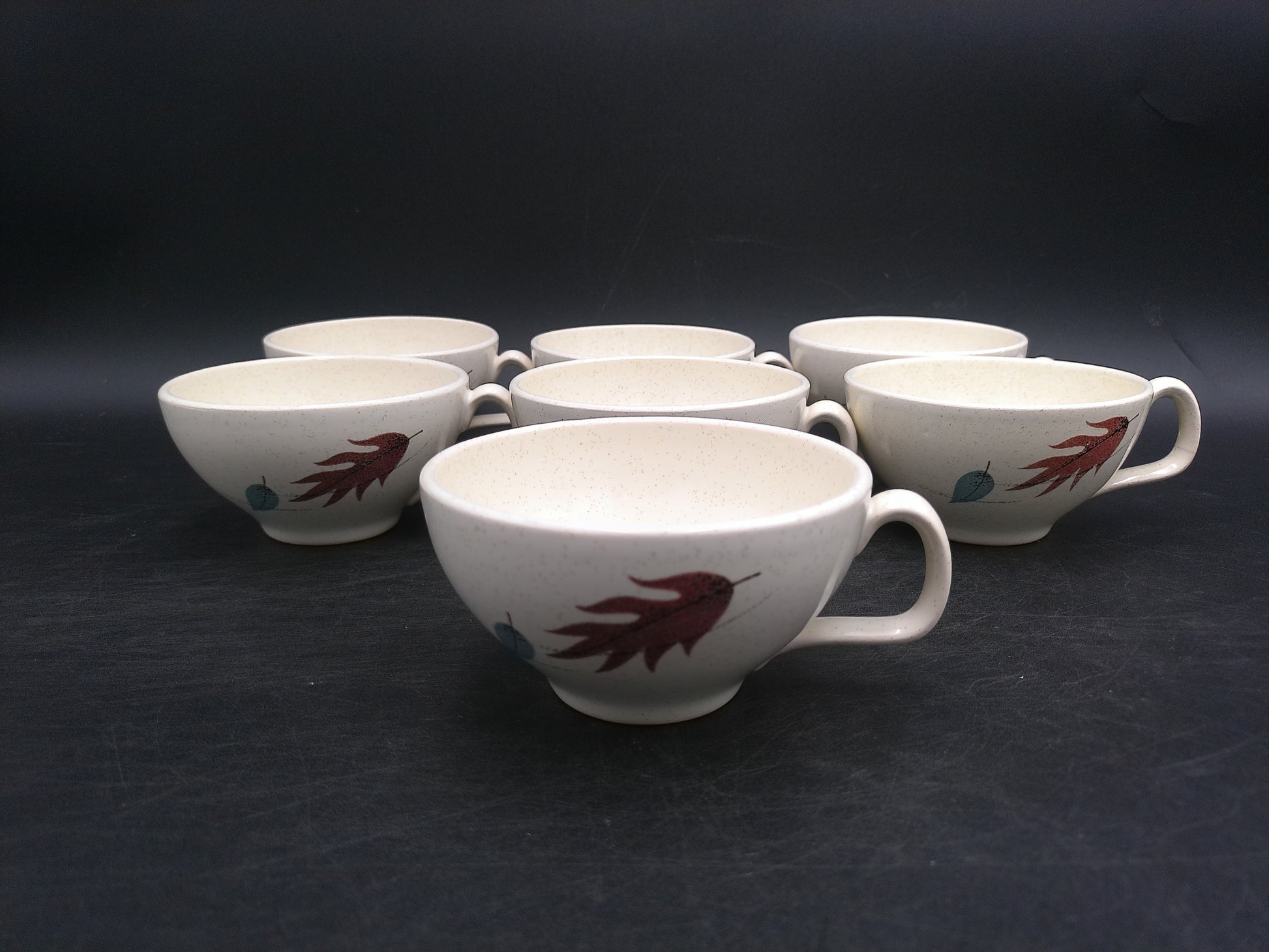 Experience the charm of the 1950s with this Franciscarn set featuring cups, dishes, a plate, and a pitcher adorned with a delicate leaf design. Crafted with care, each piece brings vintage elegance and timeless style to your table. Perfect for collectors or those seeking to add a nostalgic touch to everyday dining, this set combines beauty and functionality effortlessly. Elevate your serving experience with this classic mid-century collection.